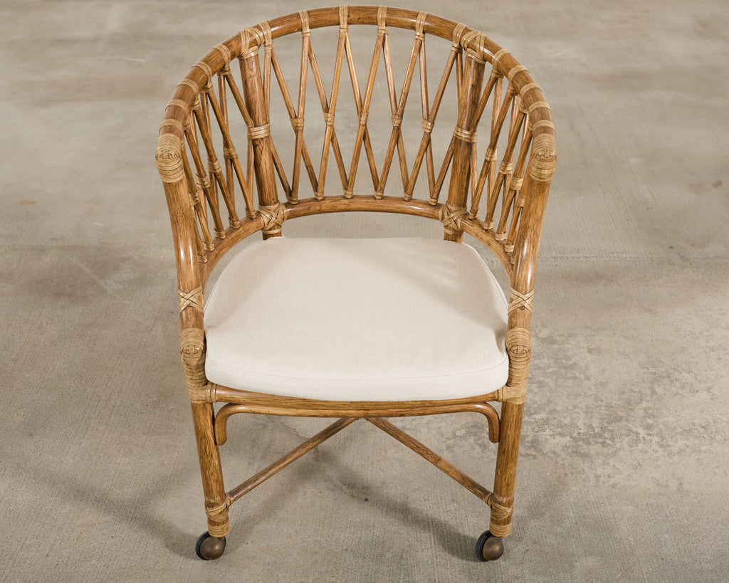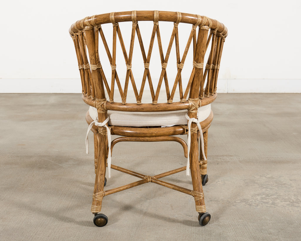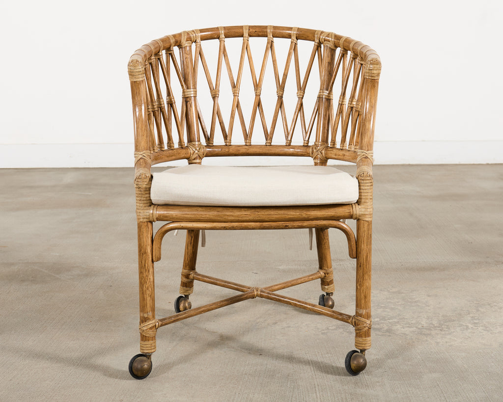 A beautifully crafted well-preserved McGuire barrel back dining chair, desk chair, games chair, or arm chair featuring one of McGuire's most sought after and rare designs. The chair features a graceful barrel-back form silhouette with gently sloped arms executed in a warm honey-toned rattan. The frame showcases McGuire's signature hand-applied leather rawhide lashing joinery on the exposed joints. The chair is detailed by an intricate open lattice fretwork of rattan pole spindle-work to the back and sides, lending the piece a visual air lightness. The frame is raised by straight rattan legs reinforced by a X-form stretcher, terminating in patinated brass casters. The chair is fitted with a loose padded seat cushion in an ivory tone. The chair is versatile and suited to add a polished Coastal, Organic Modern, or Palm Beach style interior. Arms measure 28" tall. Original McGuire maker's plaque underneath chair. The chair is sturdy and strong having excellent joinery and craftsmanship. This versatile chair would also work as a stylish desk chair. From the Glenshaw estate in Napa, CA.