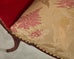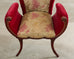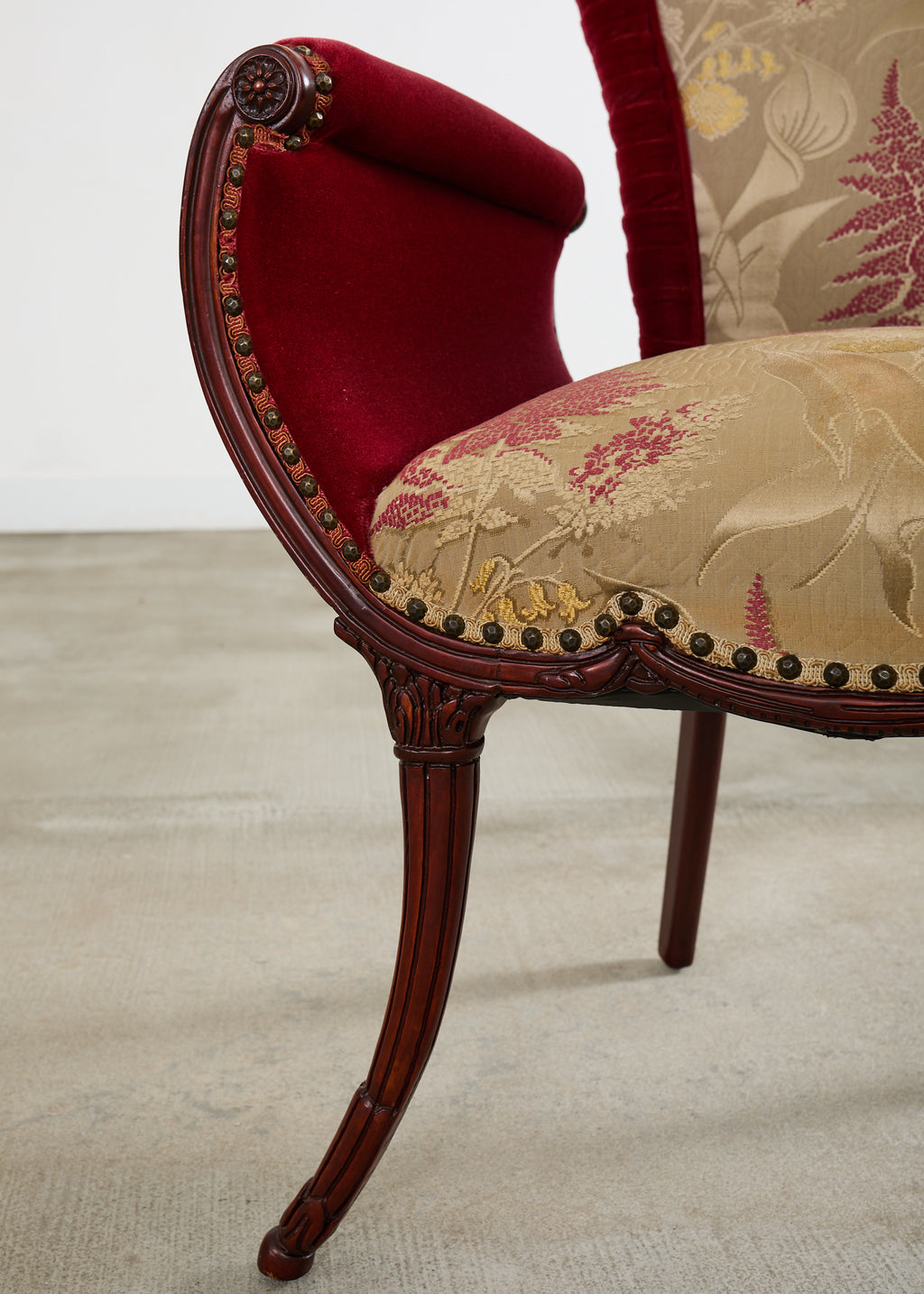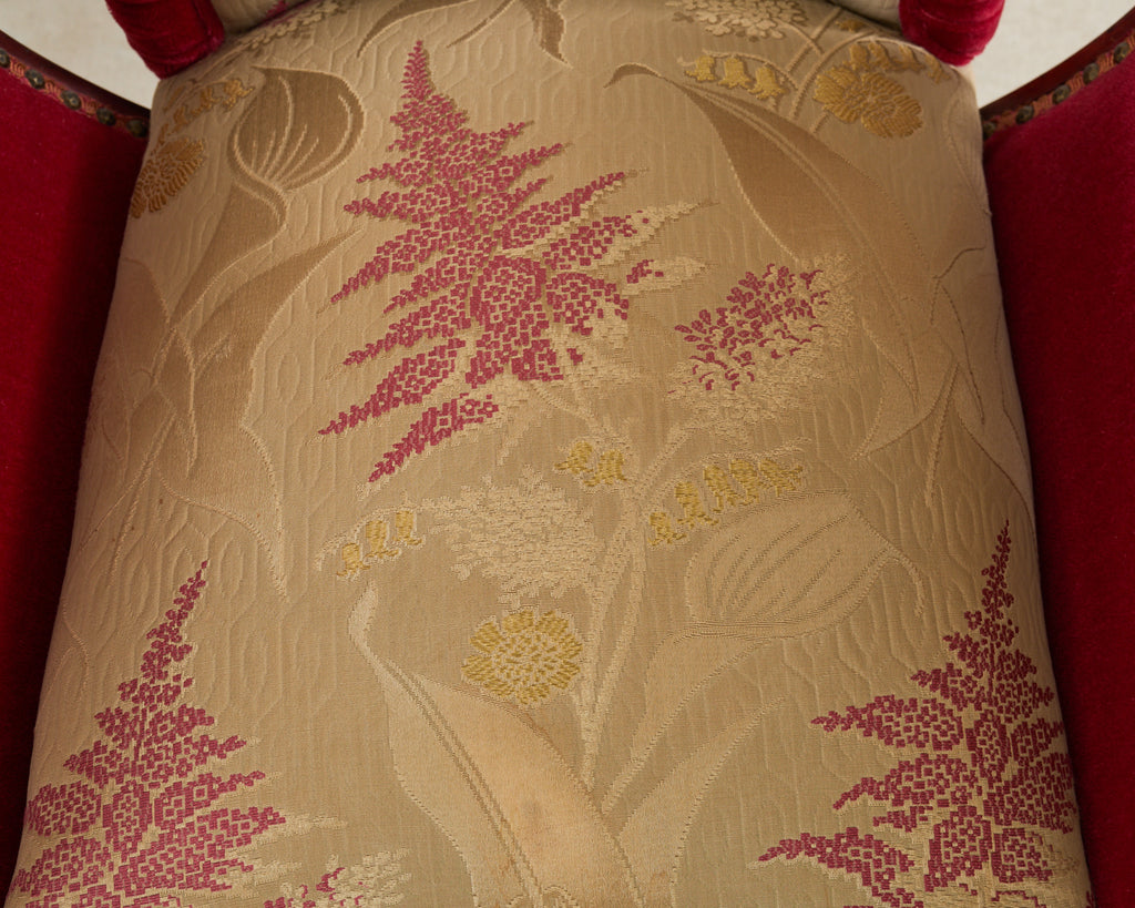 Dramatic and whimsical pair of Regency fireside armchairs crafted by Grosfeld House, New York. The chairs feature a mahogany frame with a winged back and gracefully curved scroll arms. The generous seats are supported by saber style legs decorated with carved acanthus. The chairs are upholstered with a festive ruby red mohair velvet fabric bordered by patinated brass tack nail heads. The back and seat have a silk brocade gold fabric embellished with delicate floral and foliate motifs in gilt, red, and yellow. The chairs have a distinctive profile with dazzling upholstery. Well preserved condition give age and use with vibrant colors and finish.