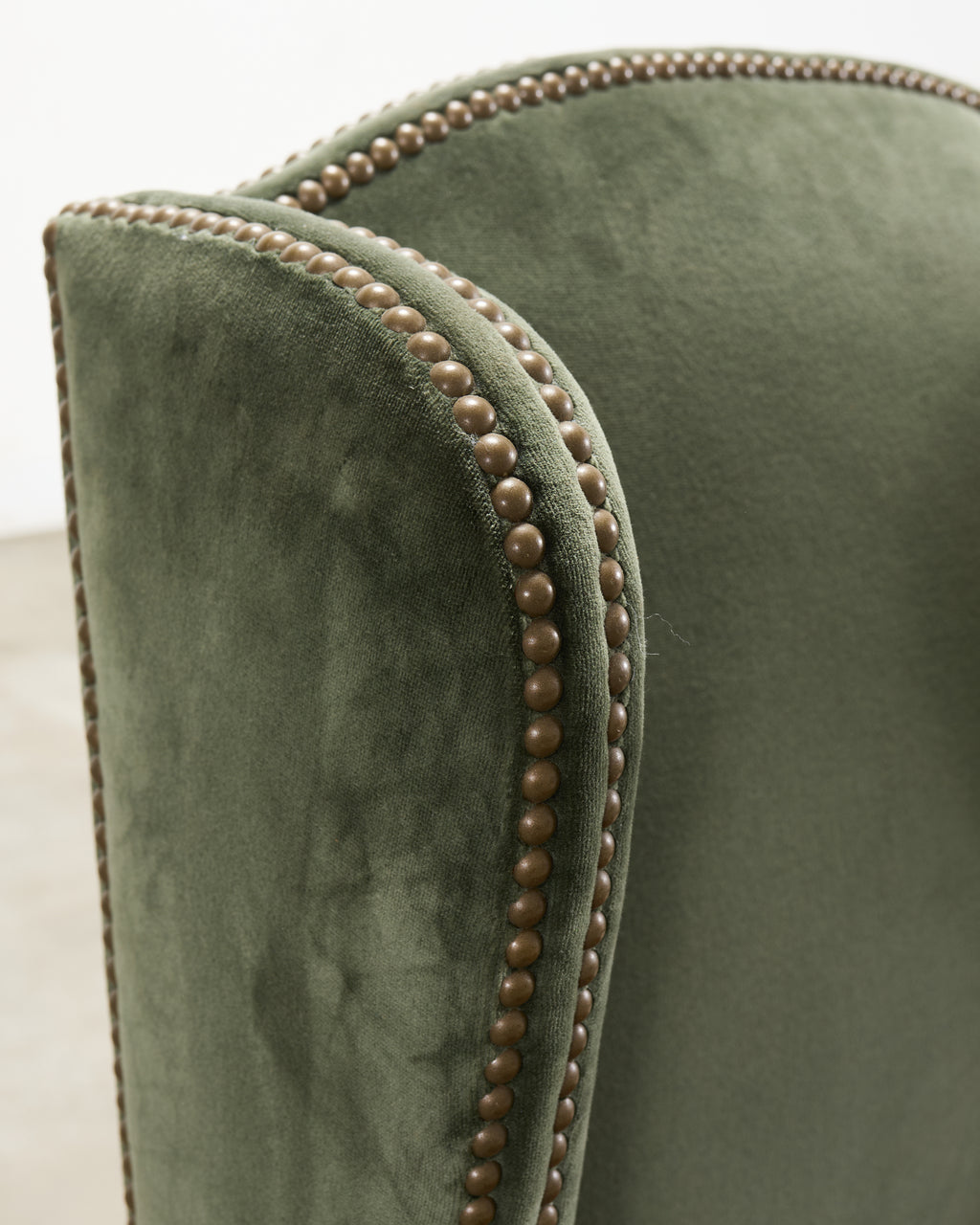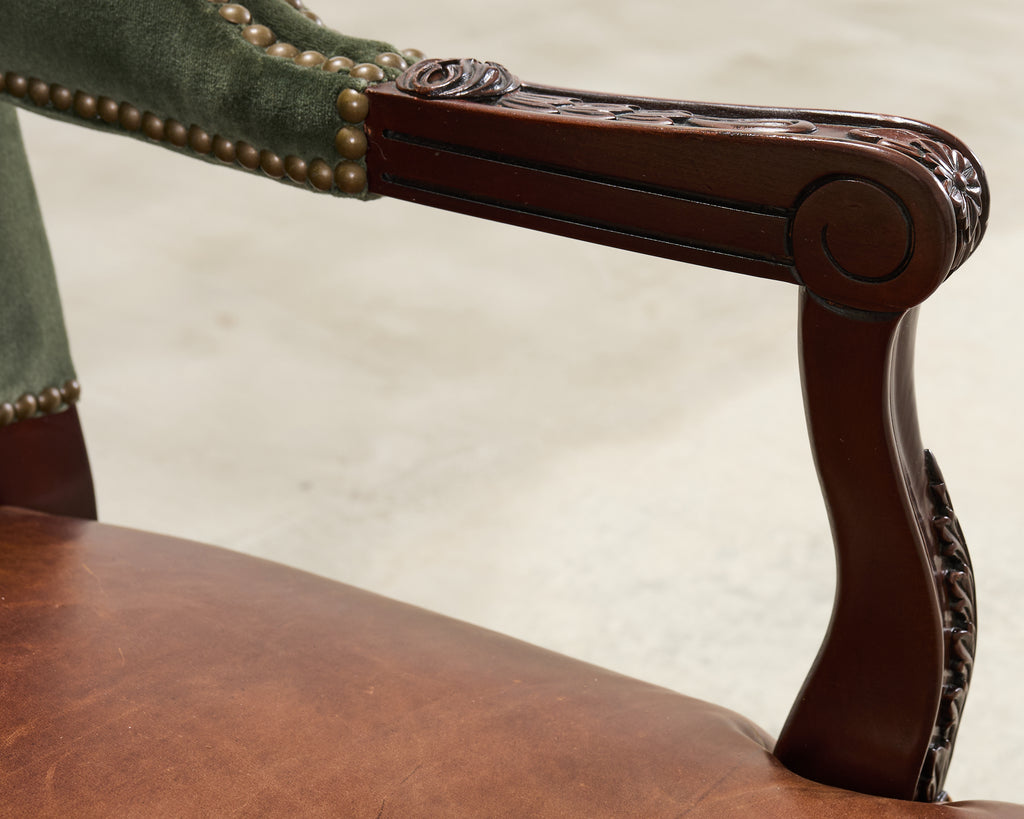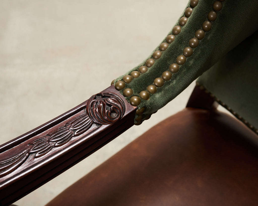 Classic English Regency style conservatory garden dining host armchair or wing chair designed by Ralph Lauren. The chair features a hand-carved beech frame having a dark, rich mahogany finish. The back of the chair has gracefully formed wings that conjoin to flat arms measuring 27.5 high. The frame is decorated with foliate and acanthus carved motifs and upholstered with a leather seat and a plush Italian riding velvet in a British racing green tone. The rich leather and velvet fabric is bordered by patinated brass tack nail heads. The limited production chair is from Ralph Lauren's Conservatory Garden Collection. Each bench made wing chair is individually produced and finished with the highest level of hand craftsmanship by Theodore Alexander for Ralph Lauren in the U.S. Custom bespoke chair having the original order tags affixed to the bottom of the seat dated 2021. The chair is sturdy and strong having excellent joinery and craftsmanship in exceptional condition. The leather has a desirable intentionally aged patina as seen in photos. The versatile chair works beautifully as the head of the dining table or as a library chair.