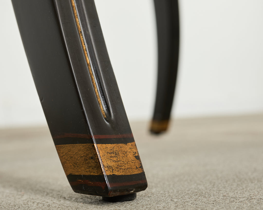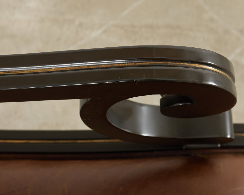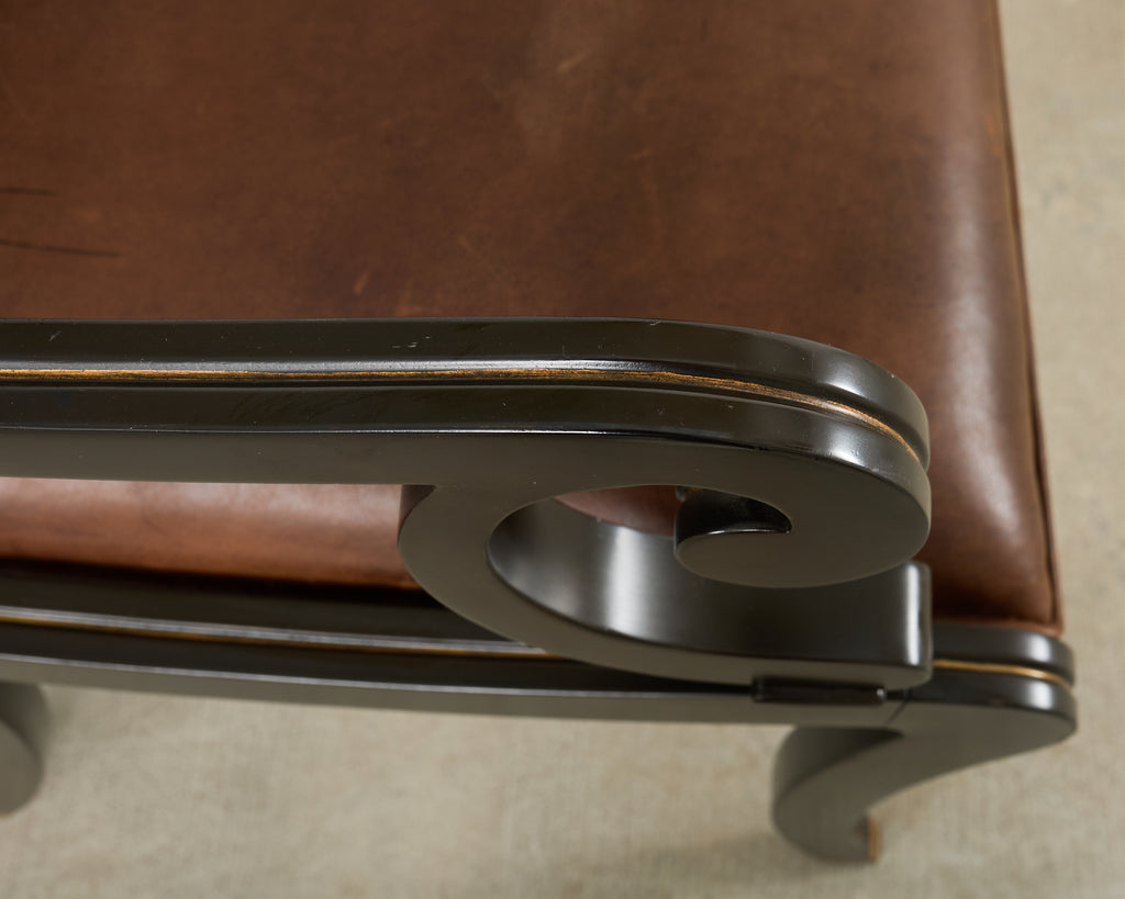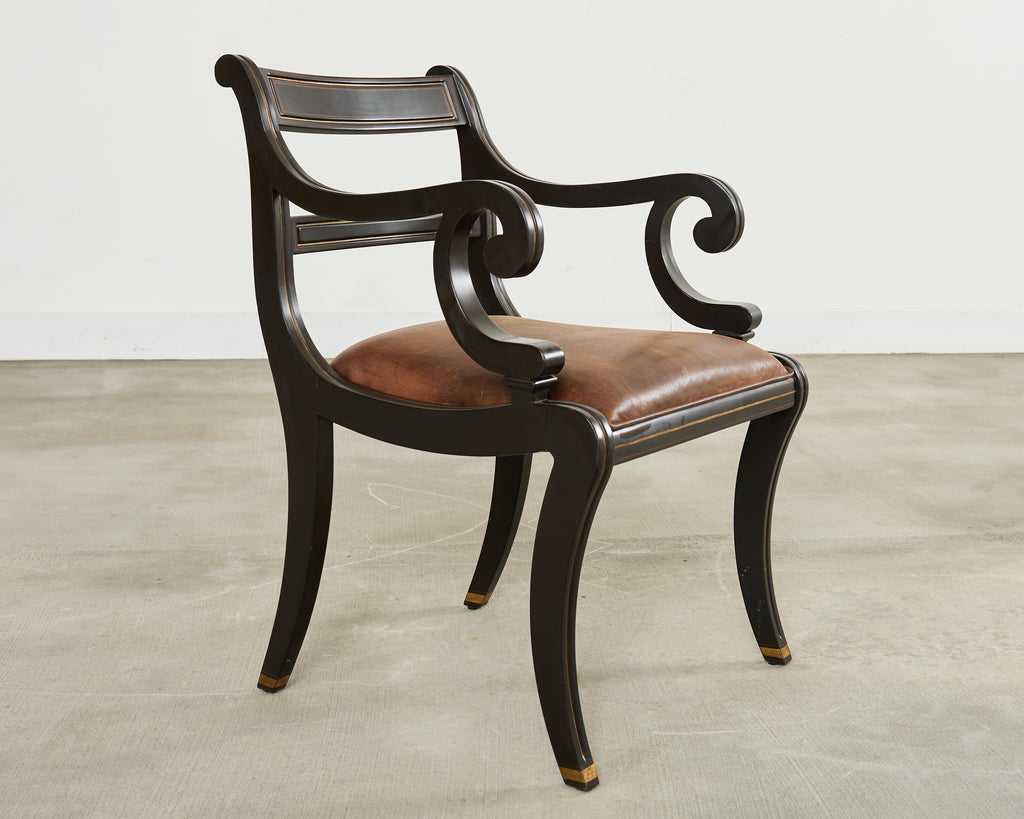 Rare English regency style library armchair designed by Ralph Lauren. From Lauren's Alastair collection, the chair features a hardwood frame with a dramatic black ebonized lacquer finish. Design by Ralph Lauren, finish by Theodore Alexander. Constructed in Italy and finished upholstery in the U.S. The chair is upholstered with a bespoke leather seat having a distressed finish to mimic age. The frame is accented by parcel gilt highlights. The frame has a ladder back and klismos style saber legs. Each chair is individually bench made and the chair retains its original order tags under the seat. The seat has large scrolled arms measuring 28 inches high. In exceptional condition as seen in photos.