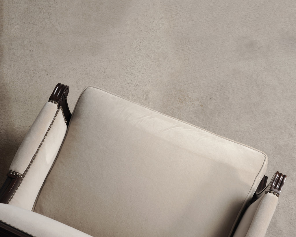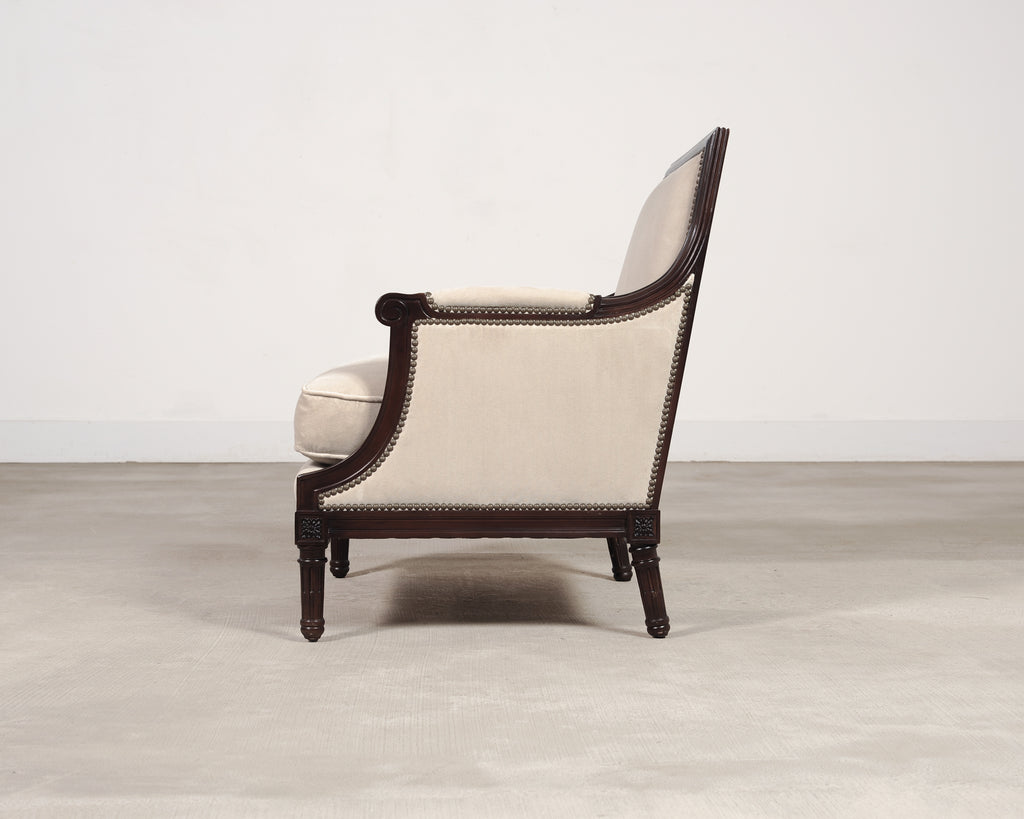 A refined bergère à la reine "Duchess Salon Chair" designed by Ralph Lauren in the French Louis XVI style. The construction, crafted in the United Kingdom, features a carved hardwood frame bench from beechwood with turned and fluted legs and carved rosette corner blocks. Part of Lauren's Duchess collection finished in the U.S. by artisans at Theodore Alexander. The chair has a custom soft neutral ivory-colored upholstery with a loose box seat cushion and welted edges, accented by polished brass tack nail heads. The frame has a rich, dark mahogany finish that accentuates the cream toned plush fabric. The chair is solid and sturdy in exceptional condition having excellent joinery and craftsmanship. Original Ralph Lauren tags under seat and MSRP of $8,691 from Ralph Lauren Home.