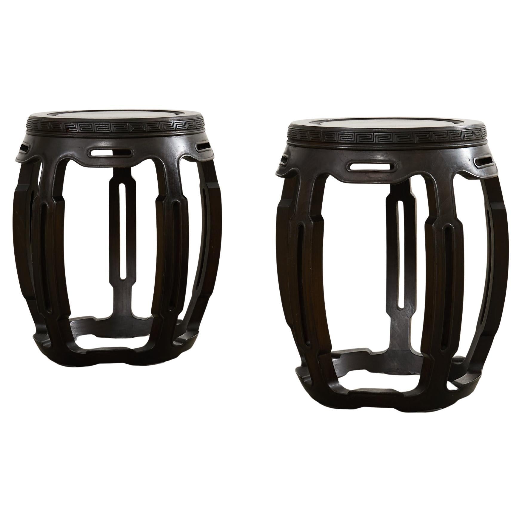 Handsome matching pair of Chinese export carved hardwood garden stools or drinks tables having a round tabouret or drum form. The stools are are sturdy and solid with excellent joinery and craftsmanship. The wood has a dark, rich, near-ebony finish with a lovely aged patina. The round tops are 18.5 inches high with a decorative carved greek key motif around the frieze or border. The apron and legs have oval elongated openings further enhancing the design. Mid-century modern with a distinctive profile from an estate in San Francisco, CA.
