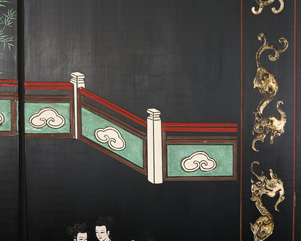 Chinese Export Six Panel Lacquered Coromandel Screen Courtyard