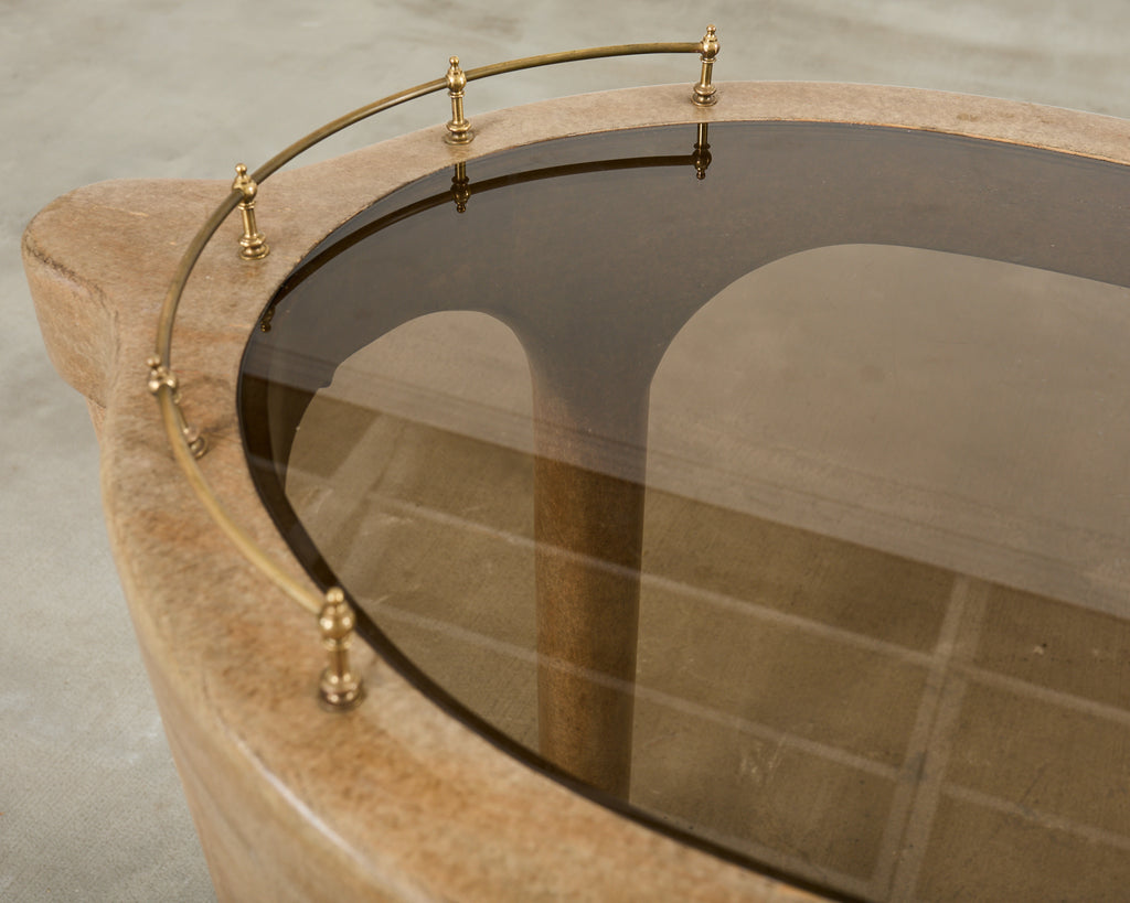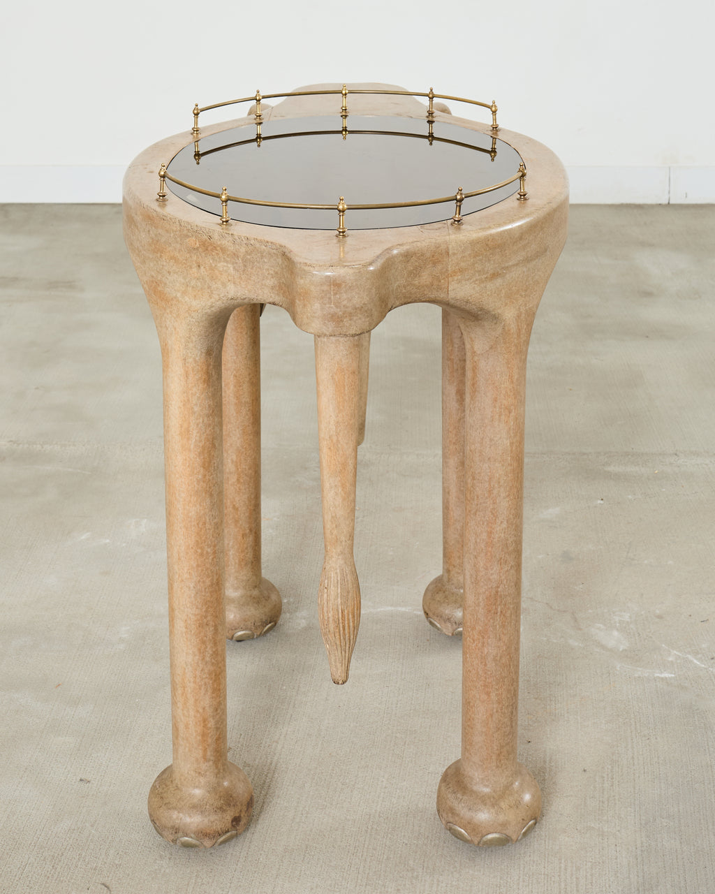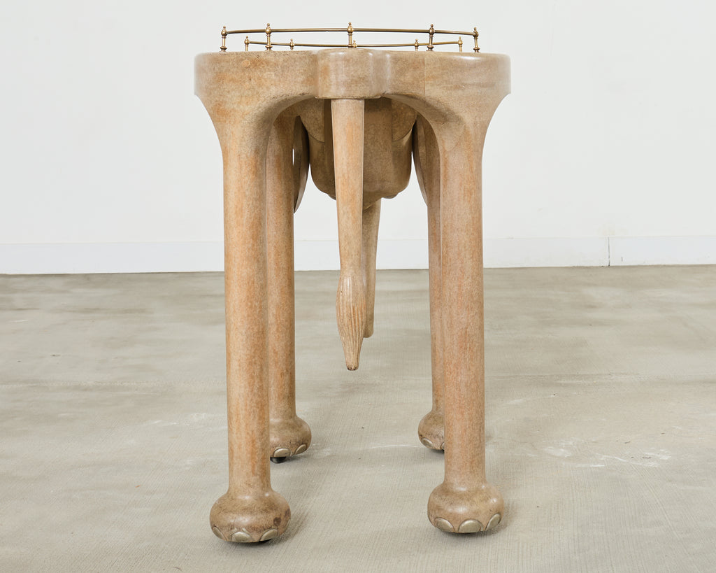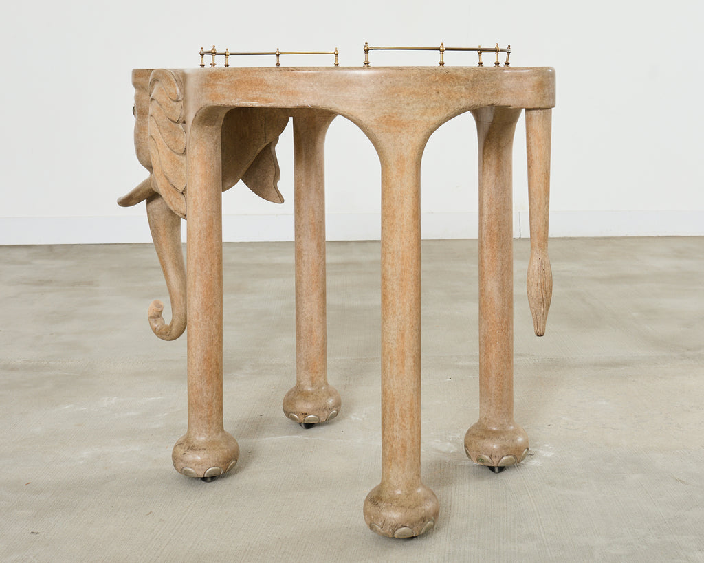 Whimsical rolling Hollywood Regency bar car in the form of an elephant designed by Marge Carson. The 20th century cart features a lacquered wood frame having an inset smoked glass top with a brass galleried border. The top is supported by straight round legs ending with elephant feet on casters. The elephant head is decorated with gilt tusks and a long trunk. The cart is solid and sturdy with excellent joinery and craftsmanship. The finish is intentionally distressed to mimic the elephant's skin. From an estate in San Francisco, CA.