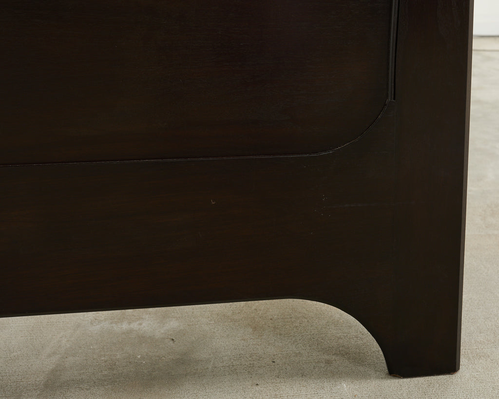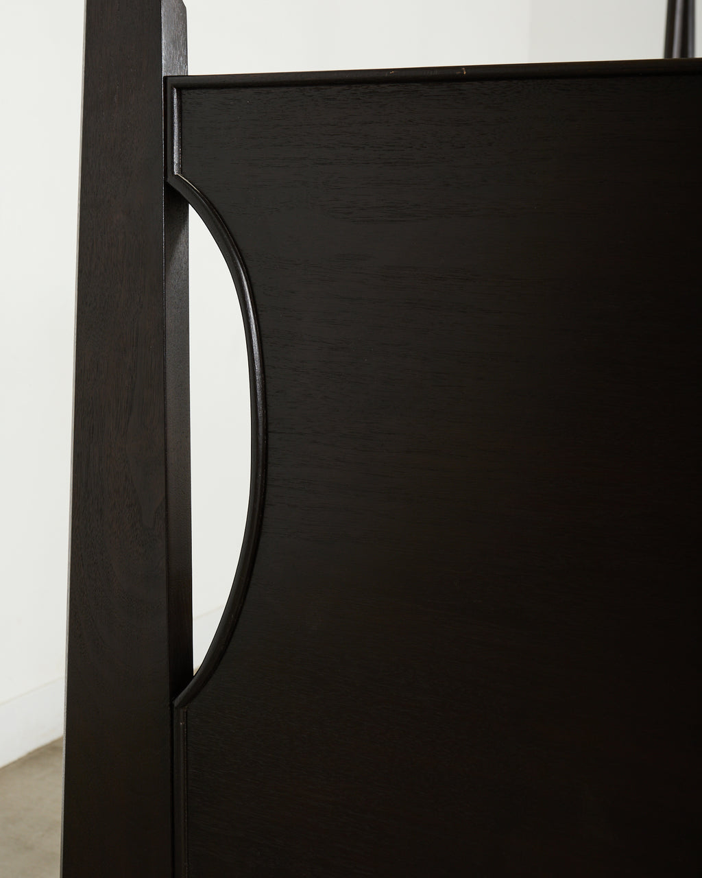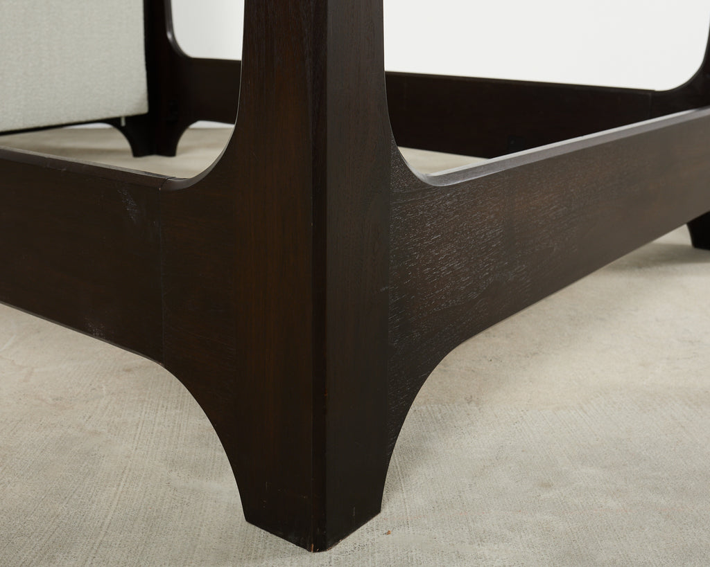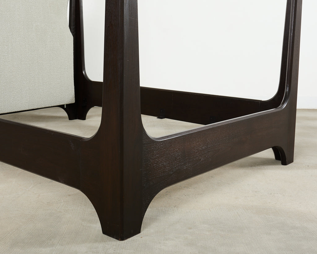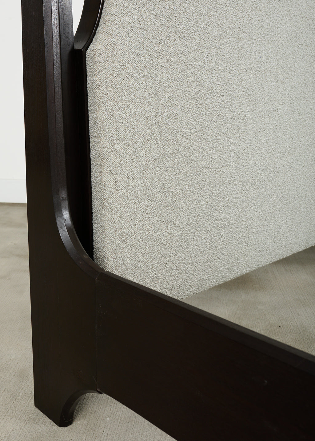 Stylish ebonized walnut four poster canopy style bed designed by Holly Hunt. The Sorraia bed is crafted from solid American black walnut on the exposed wood frame and features a dark espresso finish. The headboard is upholstered with a chic bouclé style fabric in a light grey tone. The bed has interior dimensions of 63 inches wide by 81.5 inches deep fitted for a queen size mattress. Sturdy and solid with excellent joinery and craftsmanship. The bed includes all hardware. Very good, well-preserved condition from an estate in Santa Barbara, CA.