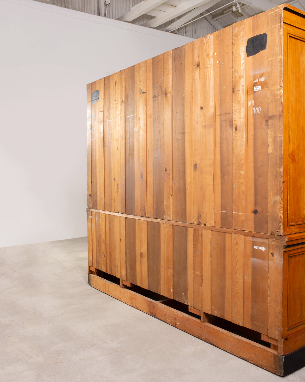 Grand important 19th century fruitwood bibliotheque library bookcase purported to be from 18th century Schloss Leopoldskron Palace in Salzburg, Austria. The large bookcase is constructed in two parts. The upper case features four astral glazed glass doors having interlacing elliptical bars in a graceful lattice pattern. The doors are flanked by ebonized pilaster columns in the Napoleonic taste surmounted in the center. The bottom case features storage doors on each side centered by three fall front doors opening to storage. The doors are decorated with globe and harp motif drawings with pilaster ebonized columns on each side. The cabinets are crafted from radiant fruitwood with a warm honey toned finish. The cabinet is heavy and solid with excellent joinery and craftsmanship. The original keys and lockplates are included. The wood finish has a desirable aged patina commensurate age and use. The inside of the cabinet bears a label from the historic Schloss Leopoldskron Palace with an inventory number. From an estate in Beverly Hills, California. Color is warm honey-amber wood tone.