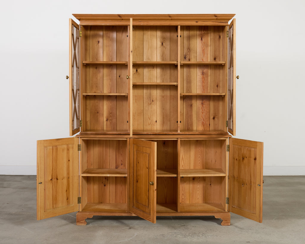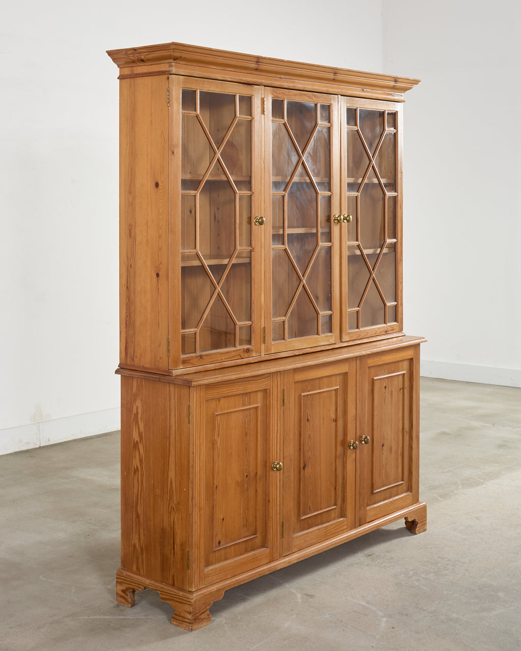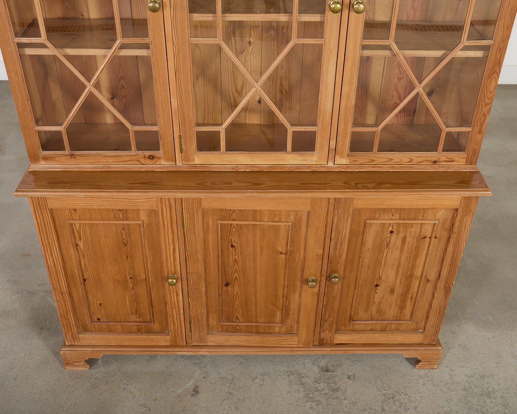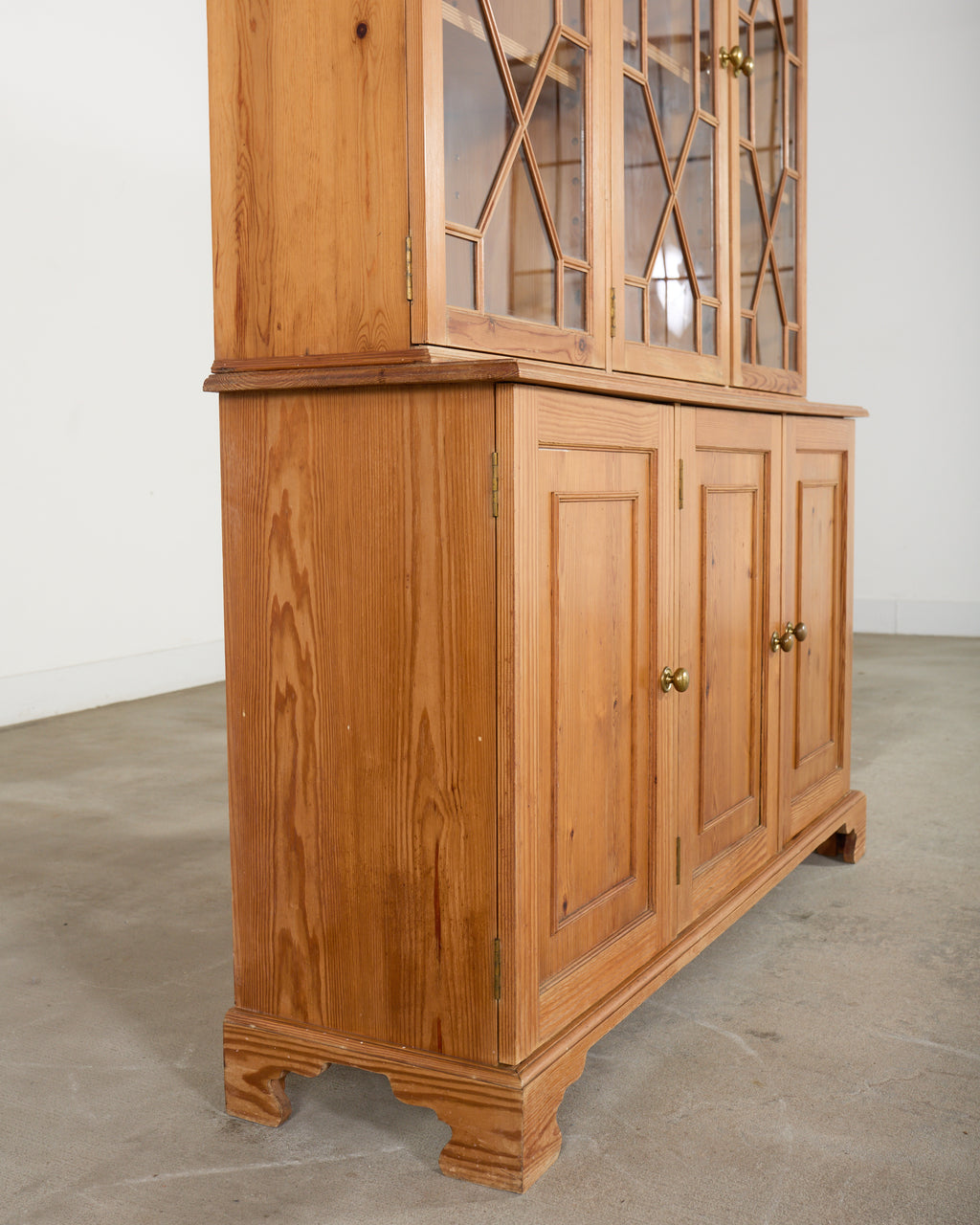 A handsome tailored 20th century large English Country George III-style bookcase cabinet or Bibliotheque finished in warm honey-toned pine wood. The two-piece design features a crowning molded cornice above a three-door upper case with decorative astragal glazed glass. The lower section contains three large paneled cupboards opening to shelved storage. The case is support by shaped bracket feet. The natural pine surface shows beautiful natural knotting and grain movement throughout. The upper shelves and lower paneled cupboards provide generous storage space. The cupboards are fitted with round patinated brass-toned pulls. Suitable for holding books, dishes, glassware, ceramics, or linens. The cabinet has solid joinery with intricate carved details on the doors and moldings. The construction and craftsmanship are impressive having a tidy fit and finish. The pine has a desirable aged patina as seen in photos that showcase the rich woodgrains.