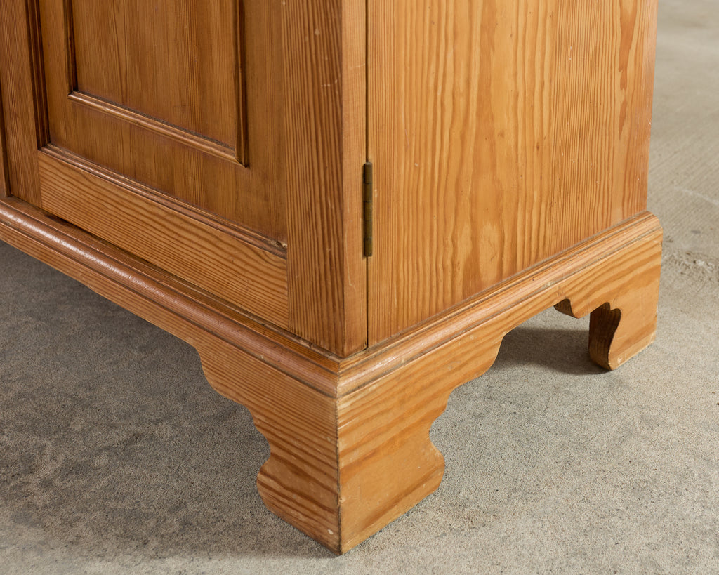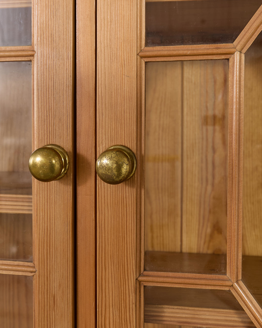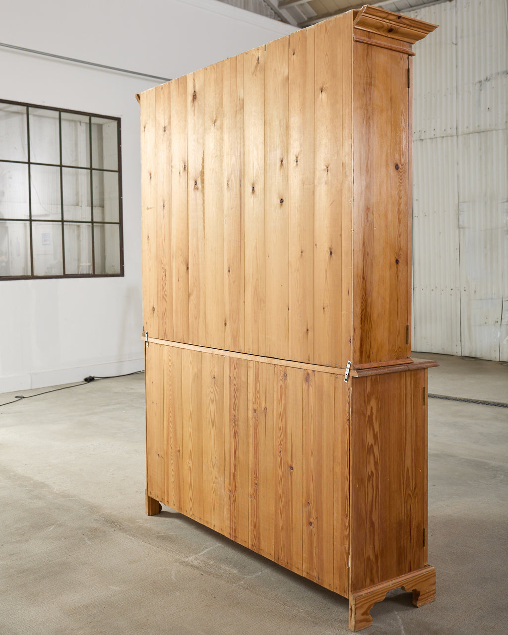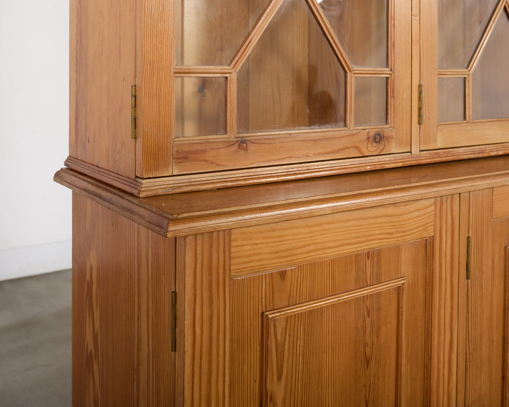 A handsome tailored 20th century large English Country George III-style bookcase cabinet or Bibliotheque finished in warm honey-toned pine wood. The two-piece design features a crowning molded cornice above a three-door upper case with decorative astragal glazed glass. The lower section contains three large paneled cupboards opening to shelved storage. The case is support by shaped bracket feet. The natural pine surface shows beautiful natural knotting and grain movement throughout. The upper shelves and lower paneled cupboards provide generous storage space. The cupboards are fitted with round patinated brass-toned pulls. Suitable for holding books, dishes, glassware, ceramics, or linens. The cabinet has solid joinery with intricate carved details on the doors and moldings. The construction and craftsmanship are impressive having a tidy fit and finish. The pine has a desirable aged patina as seen in photos that showcase the rich woodgrains.