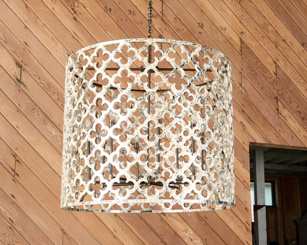The Asilah chandelier by Ironies features a monumental drum form decorated with neoclassical quatrefoil designs. The chandelier is completely embellished with natural capriz shell veneer having a dramatic pearlescent finish. The open fretwork of quatrefoil designs gives the chandelier a Middle Eastern aesthetic with Moorish arabesque shapes. The frame is fitted with rubbed bronze hardware having eight lights. The drum is supported by a three foot long bronzed chain with a bronzed canopy for the top. The large drum form measures 29 inches high and 34 inches wide. Painstakingly crafted from organic materials with a subtle iridescent sheen creating intrigue. The chandelier was customer ordered from Kneedler Fauchere in Beverly Hills, CA.