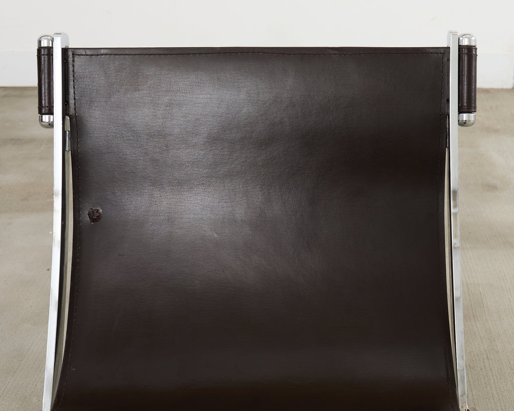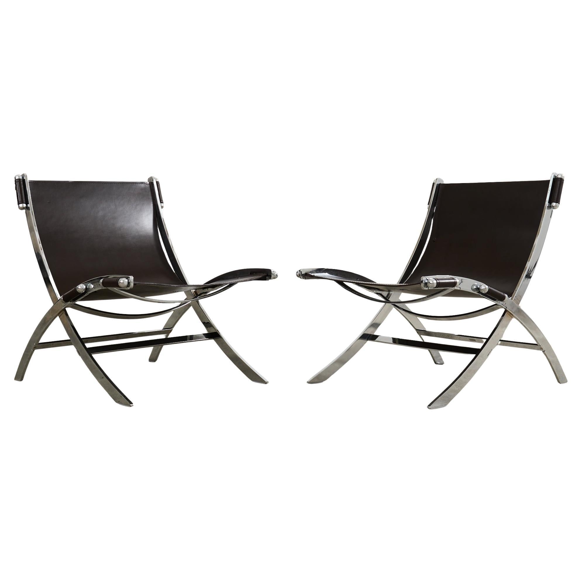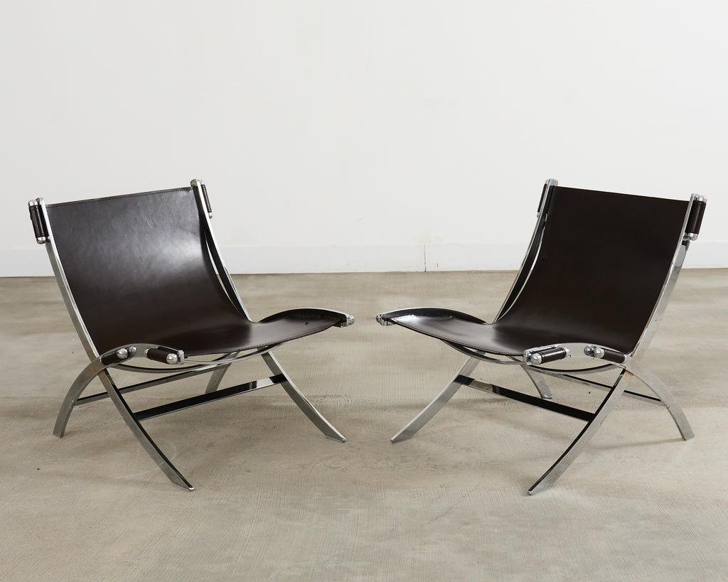 Dramatic pair of mid-century modern timeless scissor chairs designed by Antonio Citterio for Flexform. The chairs feature a chromed steel scissor frame with dark brown bonded leather slings. The thick leather was created by saddle makers and it is stretched to fit the frame at 6 points like a fine Italian suite. The frames have been crafted from steel with a shiny chrome finish. The chairs are sturdy and solid with excellent joinery and craftsmanship. The slings have minor chips and scuffs to commensurate age and use but show very well as seen in photos. Sold as a pair. From an estate in San Francisco, CA.