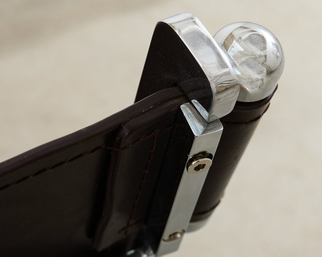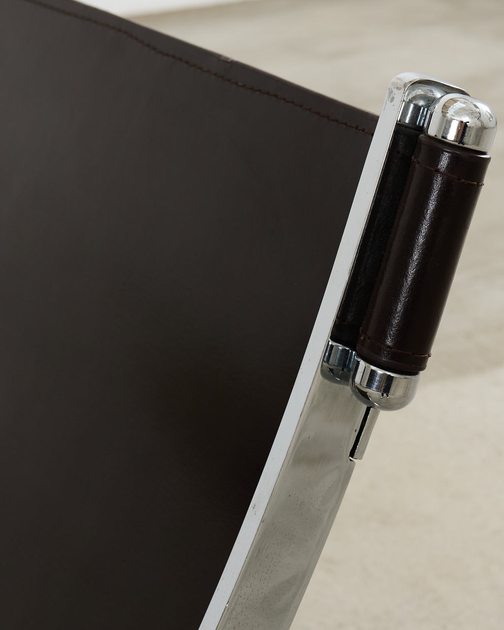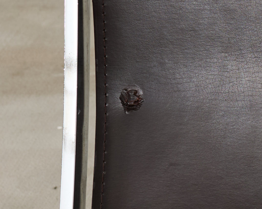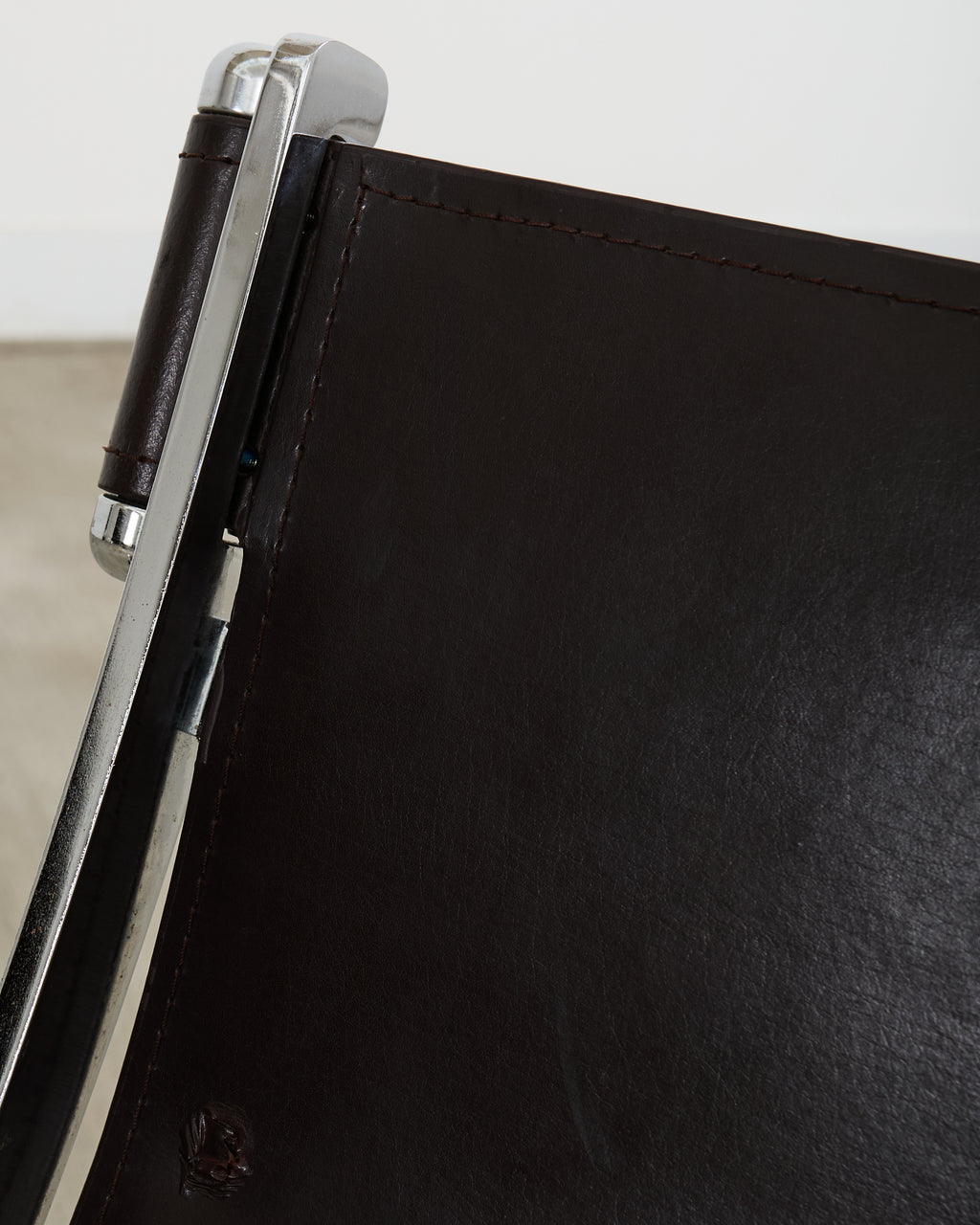 Dramatic pair of mid-century modern timeless scissor chairs designed by Antonio Citterio for Flexform. The chairs feature a chromed steel scissor frame with dark brown bonded leather slings. The thick leather was created by saddle makers and it is stretched to fit the frame at 6 points like a fine Italian suite. The frames have been crafted from steel with a shiny chrome finish. The chairs are sturdy and solid with excellent joinery and craftsmanship. The slings have minor chips and scuffs to commensurate age and use but show very well as seen in photos. Sold as a pair. From an estate in San Francisco, CA.