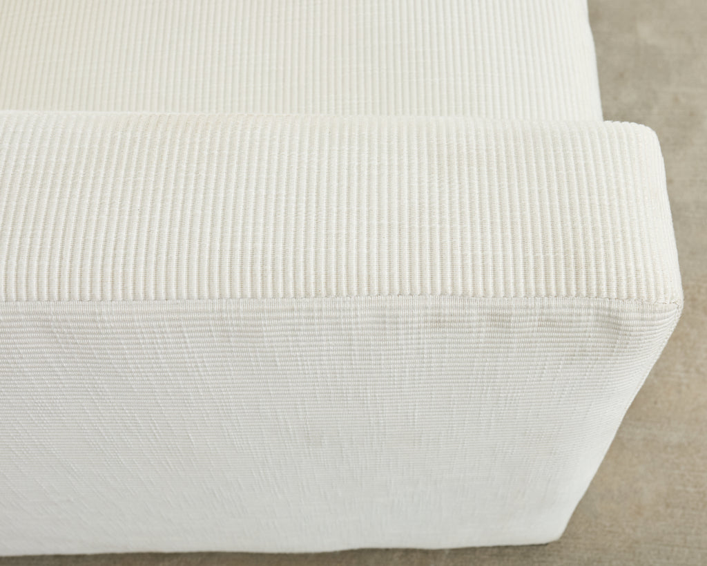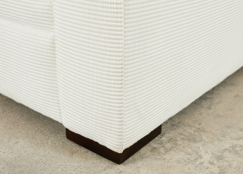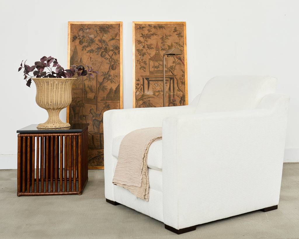 Distinctive Italian club chair or lounge chair designed by Ralph Lauren. The "Raymond" club chair features a large, deep hardwood frame that is individually bench made by Italian artisans and finished in the United States by Theodore Alexander. The frame is upholstered with a tightly padded fabric in a white tone with a geometric ribbed, striped design. The chair has wide flat arms measuring 25 inches high and is very comfortable. The seat has a fitted loose seat cushion that tethers to the frame and includes a matching throw pillow. The chair is supported by dark maple block feet. Good condition given age and use with minor light stains as expected on edges. Original order tag and makers label under seat cushions. Handsome modern style inspired by Jean-Michel Frank.