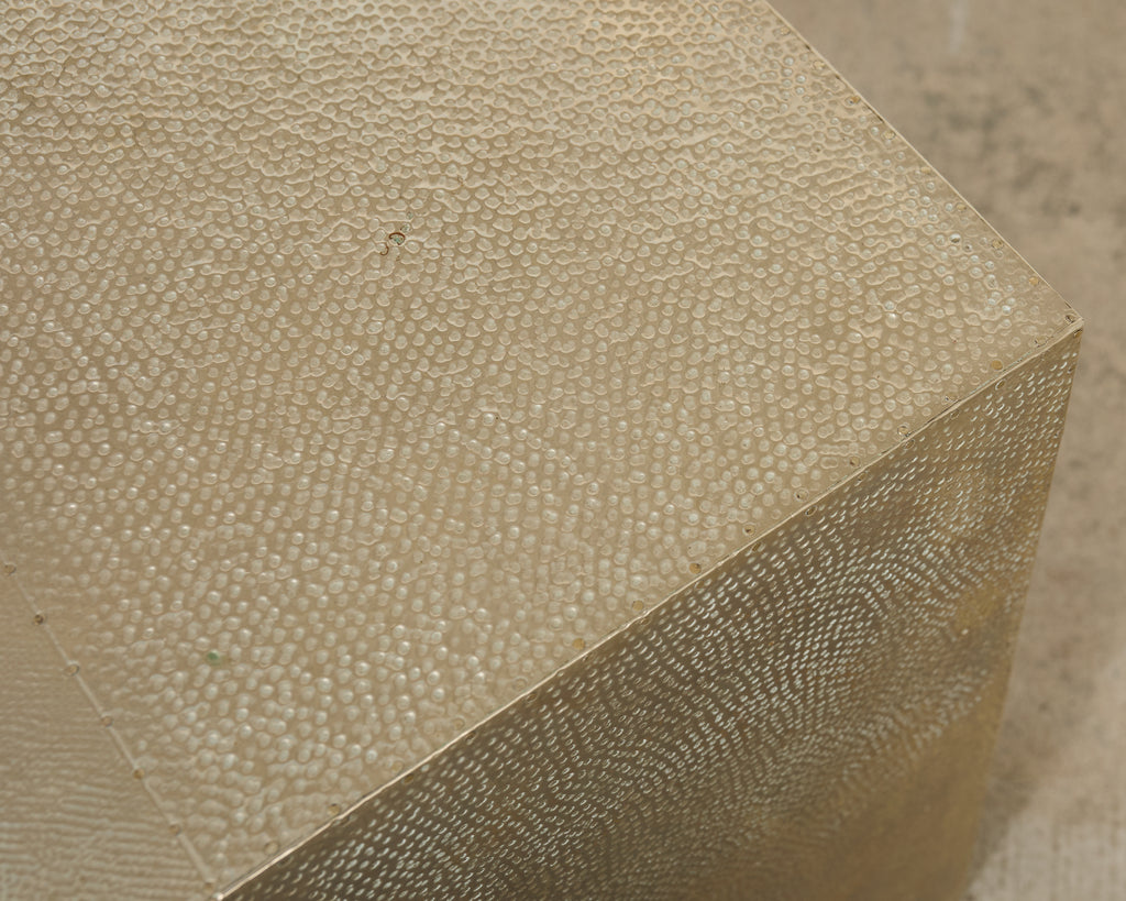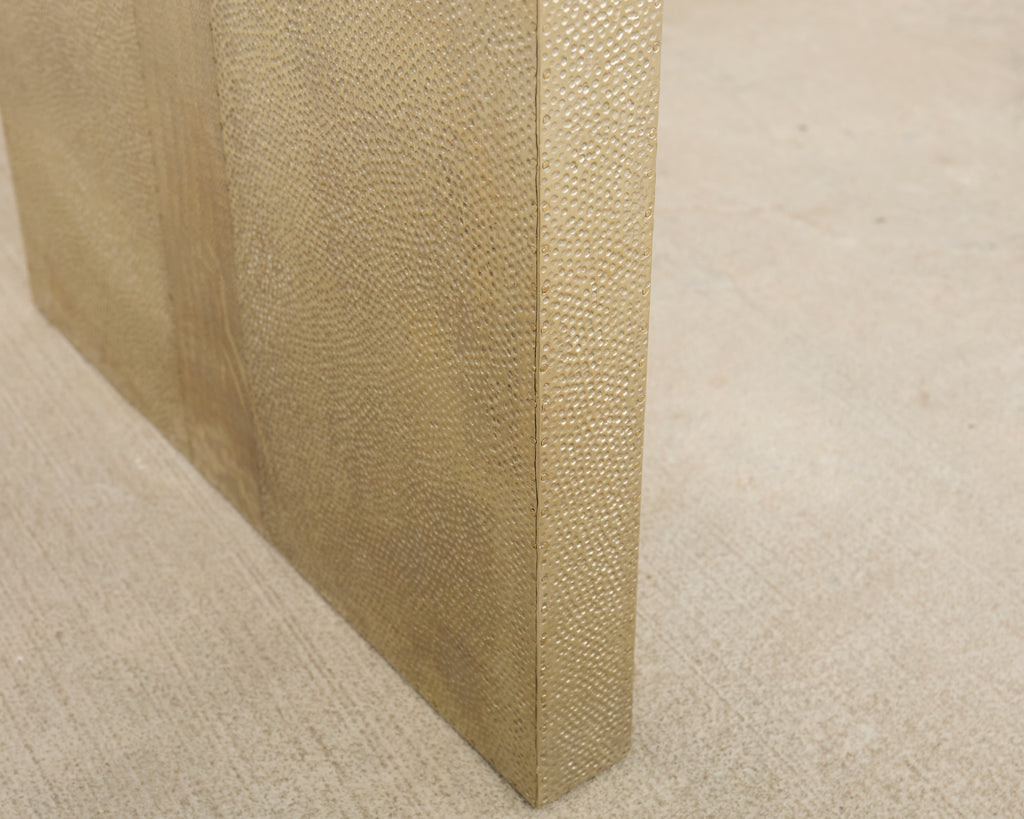 Sublime hammered white bronze low rectangular cocktail or coffee table designed by Alison Spear for Stephanie Odegard. The table was concieved during a trip to Rajasthan India and features a heavy teak wood form covered with shimmery white bronze metal work sheets. The metal work is hammered to create a sensual smooth texture and a handsome art deco inspired monolithic profile. The table is curiously heavy and solid with excellent joinery and craftsmanship. The top and sides are 2 inches thick. The bronze cladding has a unique design with a geometric stripe down the middle. The table metal work finished on all sides as seen in photos. The bronze metal has an aged patina akin to silver gilt. The design has a parsons style waterfall form with angular borders. From an estate in the Napa Valley, California. The table is located at our California warehouse available for immediate shipment and installation.