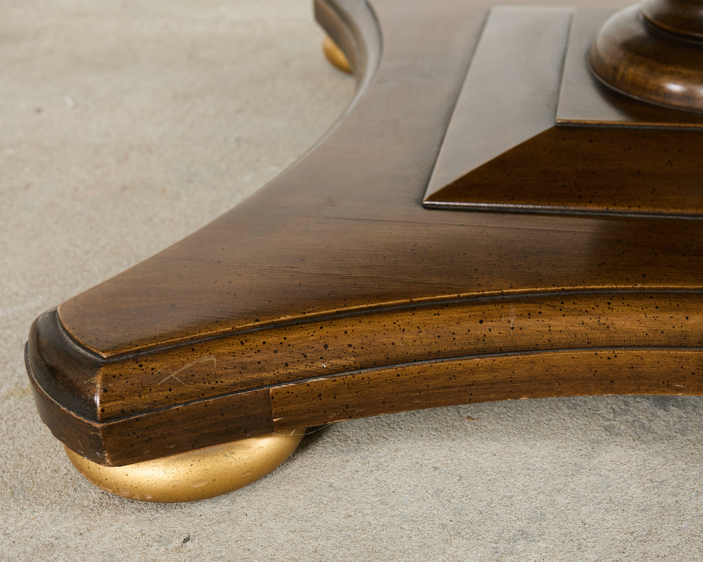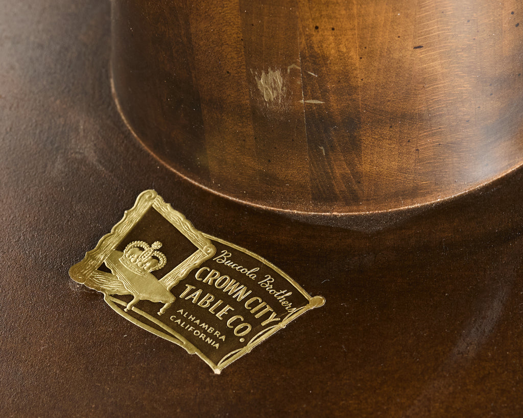 Handsome mid-century modern pedestal coffee cocktail table produced by Buccola Bros. in Alhambra, California. The table features a thick slab of round "Rosa Poente" Portuguese marble with a honed finish and a subtle soft pink tone. The marble is supported by a baluster pedestal with a thick turned column. The walnut column is mounted to a gracefully curved star-shaped plinth base ending with gilt finished bun feet. The table is heavy and sturdy with excellent joinery and craftsmanship. The marble top has fascinating veins and color measuring 3 feet in diameter. Marble and bases are both labeled on bottoms. From an original one-owner estate in San Francisco, California in exceptional condition given age and use.