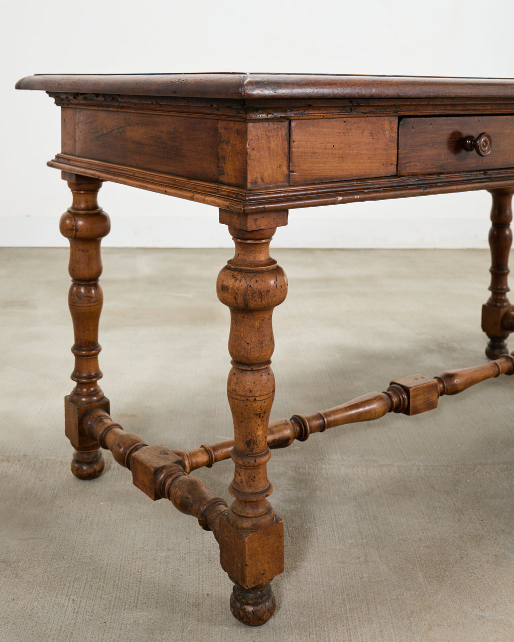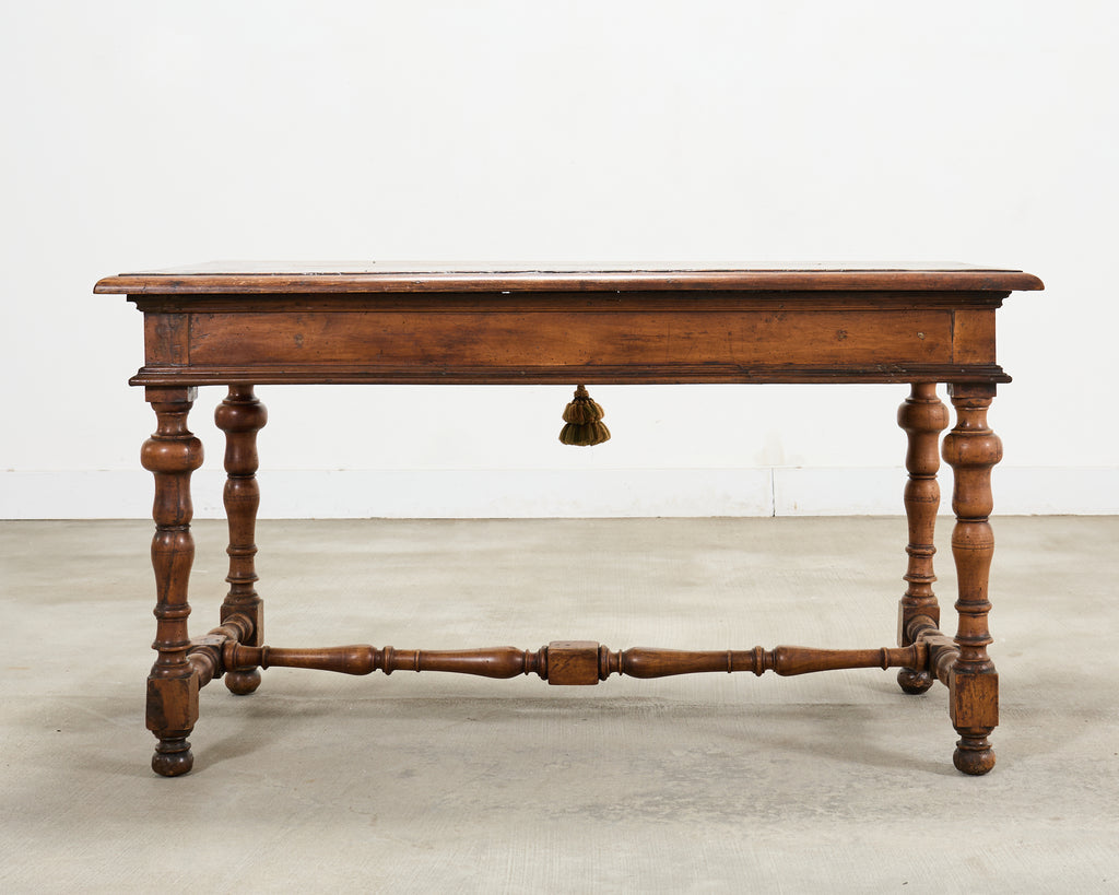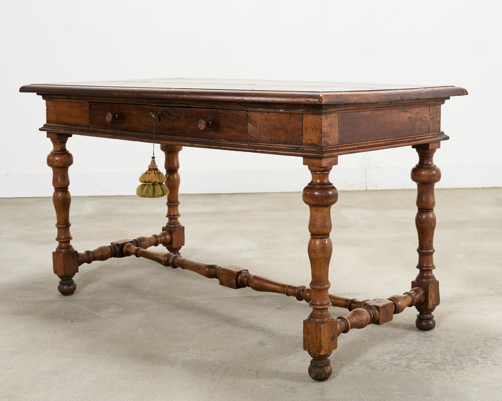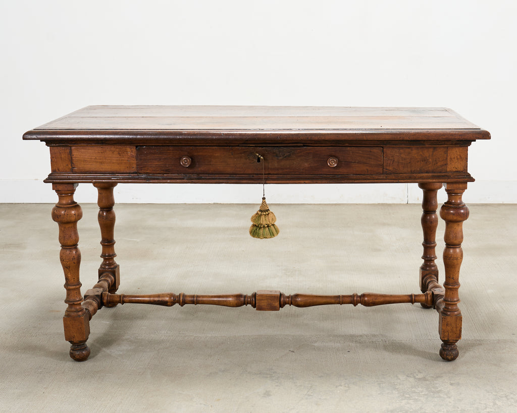 A handsome and beautifully patinated 18th century French Provincial walnut library table or desk crafted in the Louis XIII Baroque taste. The piece features a long rectangular plank top with an organically time-worn weathered finish, showing rich tonal variation and age marks, giving the piece an exceptional rustic character. The top sits above a single frieze locking drawer fitted with two carved pulls, and a central escutcheon and key having an ornate tassel pull. The table is raised on elegantly turned baluster legs ending with bun feet. The legs are conjoined by turned stretchers and block-form connectors, giving the piece a refined European Country presence. The rustic table is crafted in the French Baroque period with subtle Louis XVIII influence. The versatile piece is functional as a library table, desk, writing table, console table, vanity, hall table, or as an entry or foyer table. Ample leg room with a clearance measuring 24.75" high from the floor to the apron. The table measures 31.5 inches tall with a space between the legs measuring 46" wide. The large case has solid joinery and construction with a desirable aged patina showcasing the woodgrains. The walnut surface was gently polished and finished with a hand-applied wax to enhance the depth of the patina while preserving the character of the antique wood. A beautifully balanced French table that blends architectural presence with understated elegance. From a winery estate in the Napa Valley, CA. Erin Lane Estate specializes in European tables with over 100 in stock ready to ship from our California warehouse.