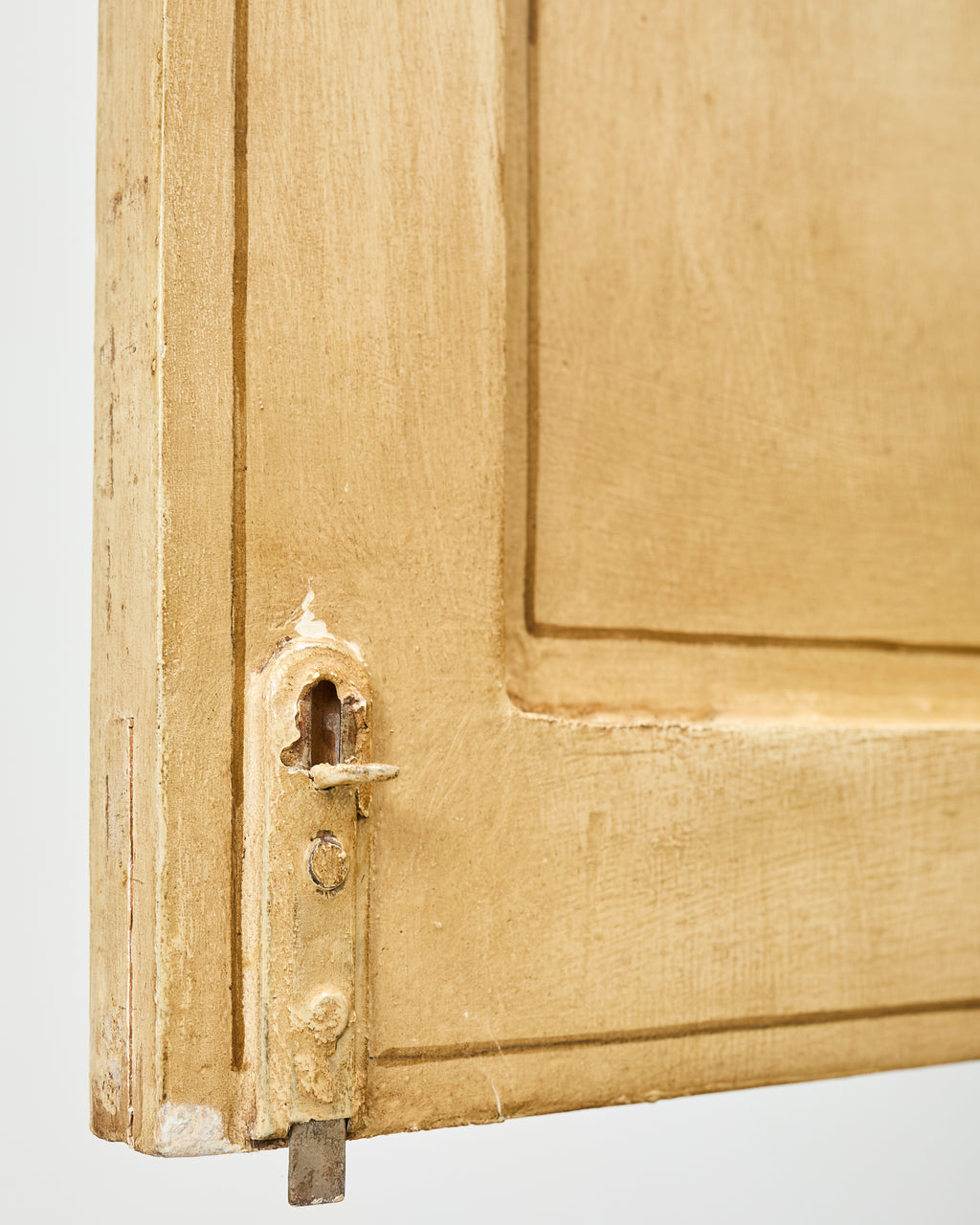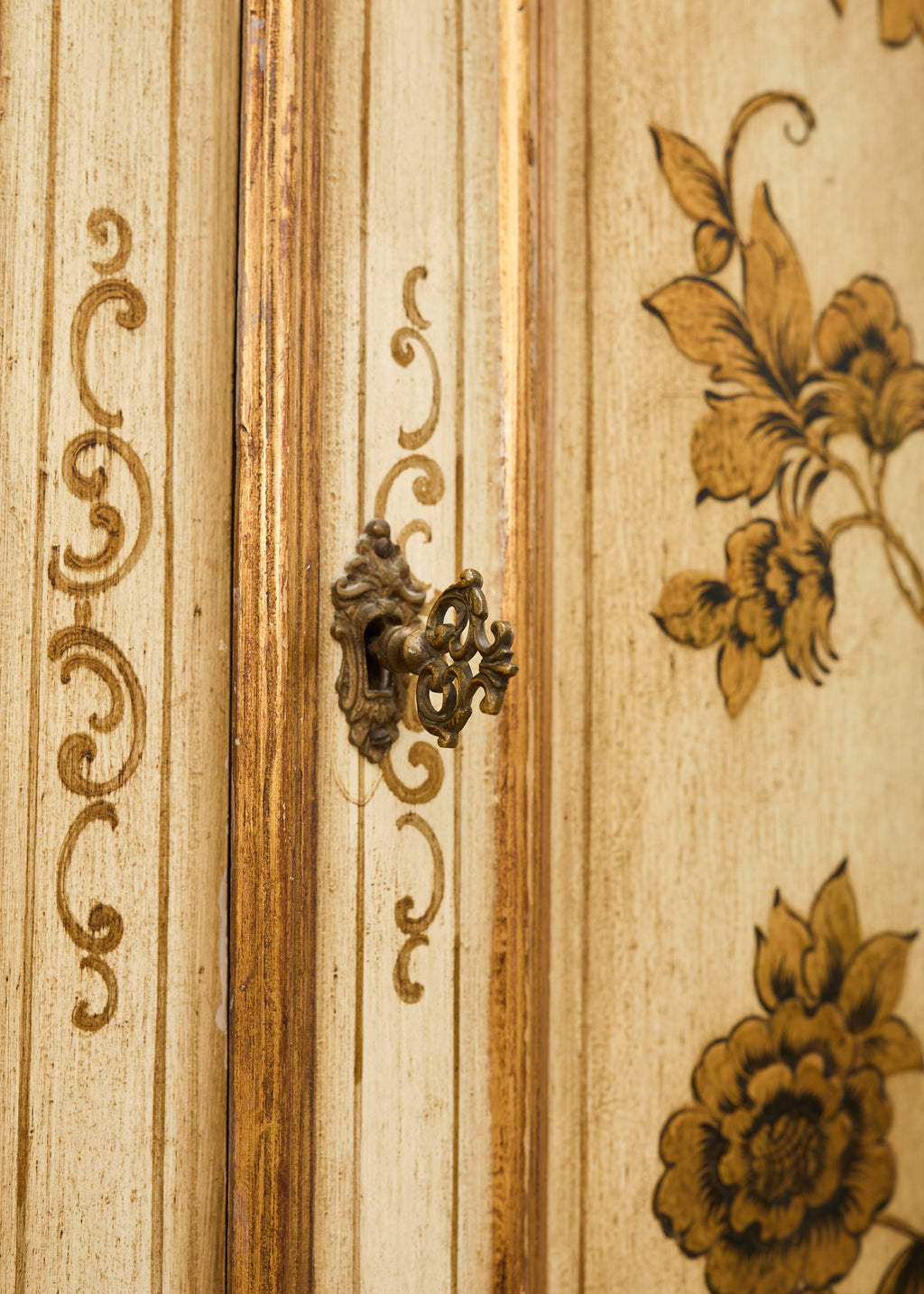 Condition: Good, wear consistent with age and use. Beautifully crafted with solid joinery and construction. Intentionally distressed patina and finish to mimic age as seen in photos. Includes key. Age appropriate wear with chips, scuffs, scratches, and minor losses to finish as expected.