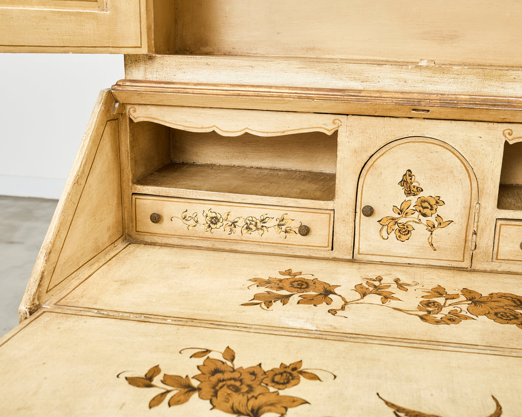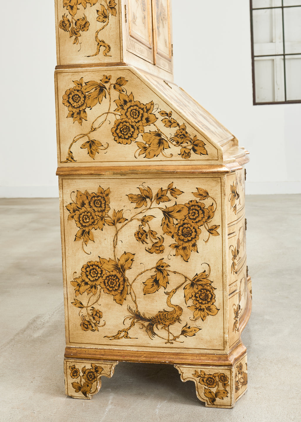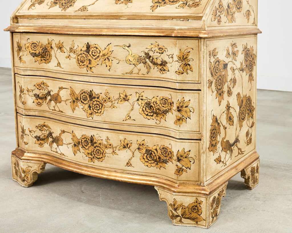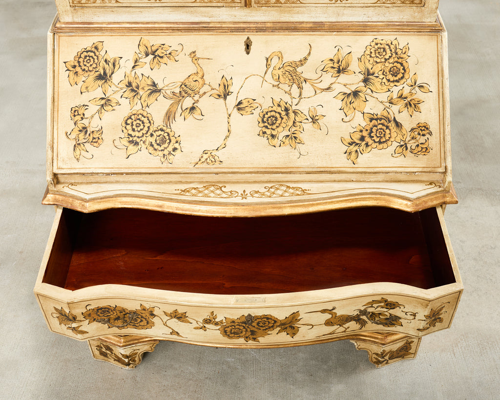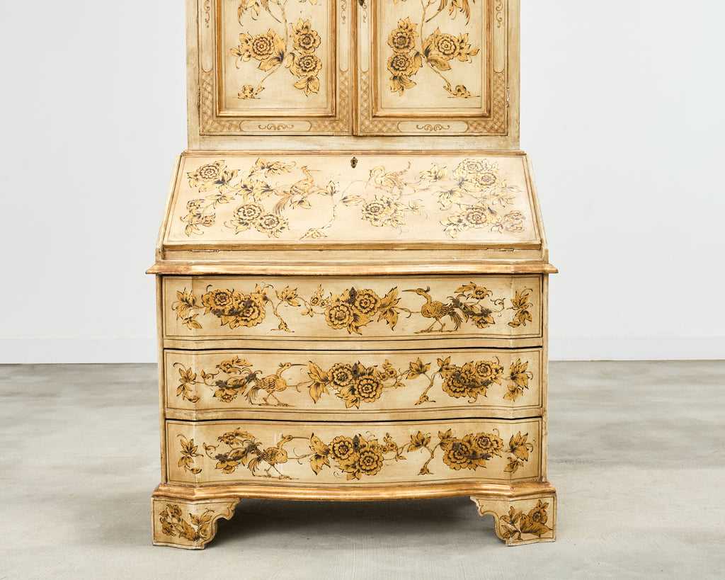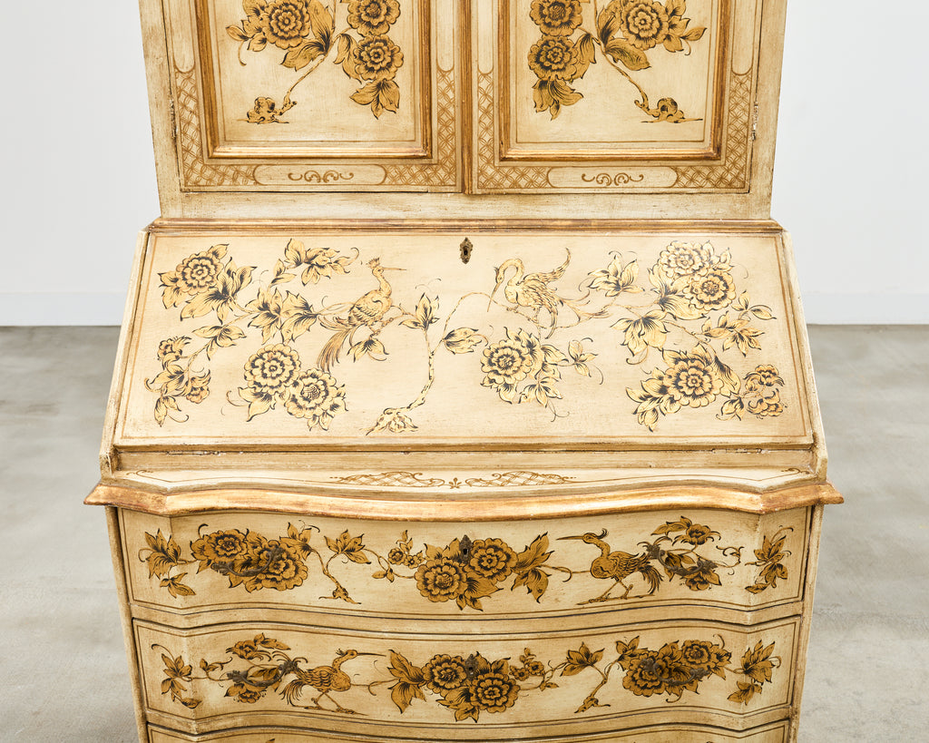 Fantastic 20th century Italian lacquered secretary bookcase decorated in the Venetian taste with dramatic Chinoiserie motifs. The two-part case has an intentionally distressed painted finish to mimic age. The top of the bookcase has a split pediment with a cornice molding. The cabinet is fronted by two locking doors opening to a shelved interior. The bottom case has a slant or fall front secretaire desk with a large writing table and fitted drawers with cubbies for storage. Below the desk are three large storage drawers with patinated brass pulls and mahogany interiors. The entire piece is embellished with floral reserves in parcel gilt. The scenes include mythical birds and floral sprays in the orientalism aesthetic. The paintings have intricate details with dramatic gilt over a distressed cream painted background that provides a romantic light-filled palette. The original locking key is provided. The case is heavy and solid with excellent joinery and craftsmanship.