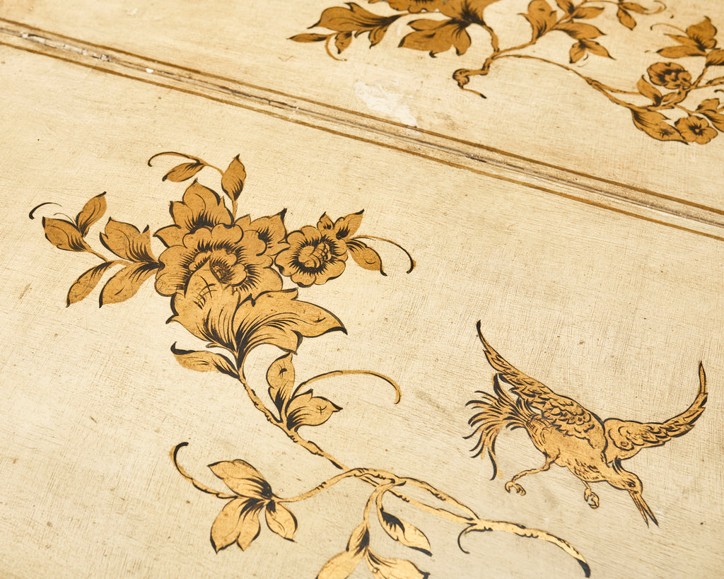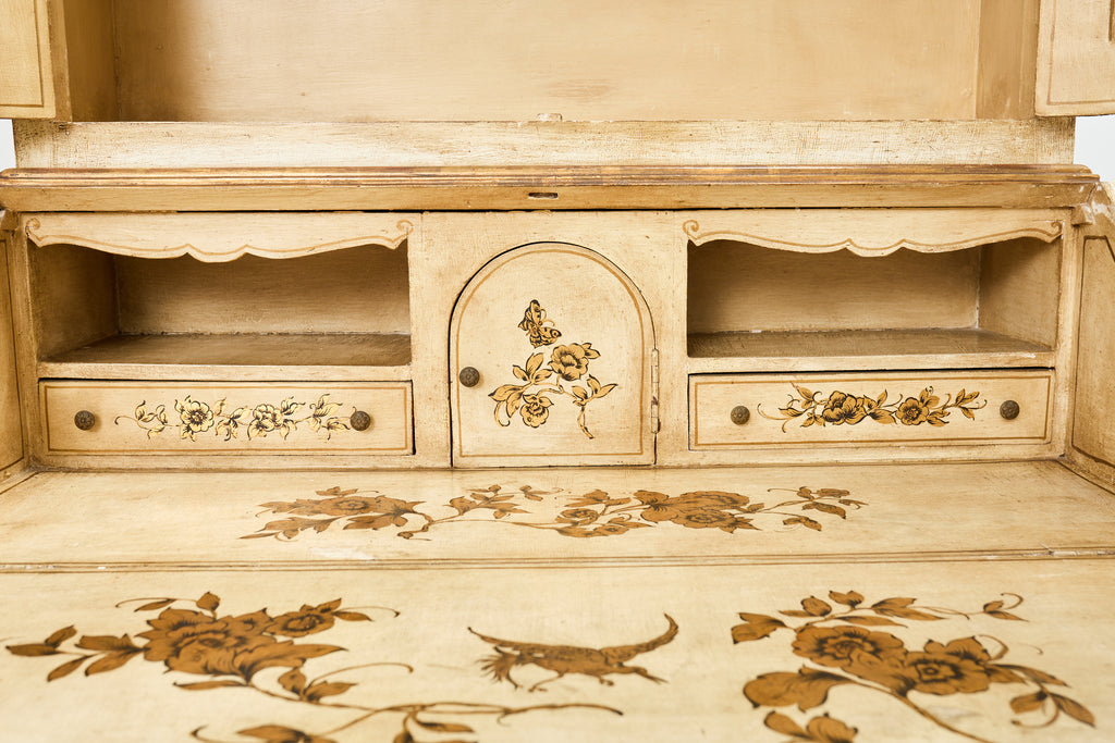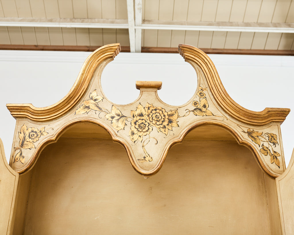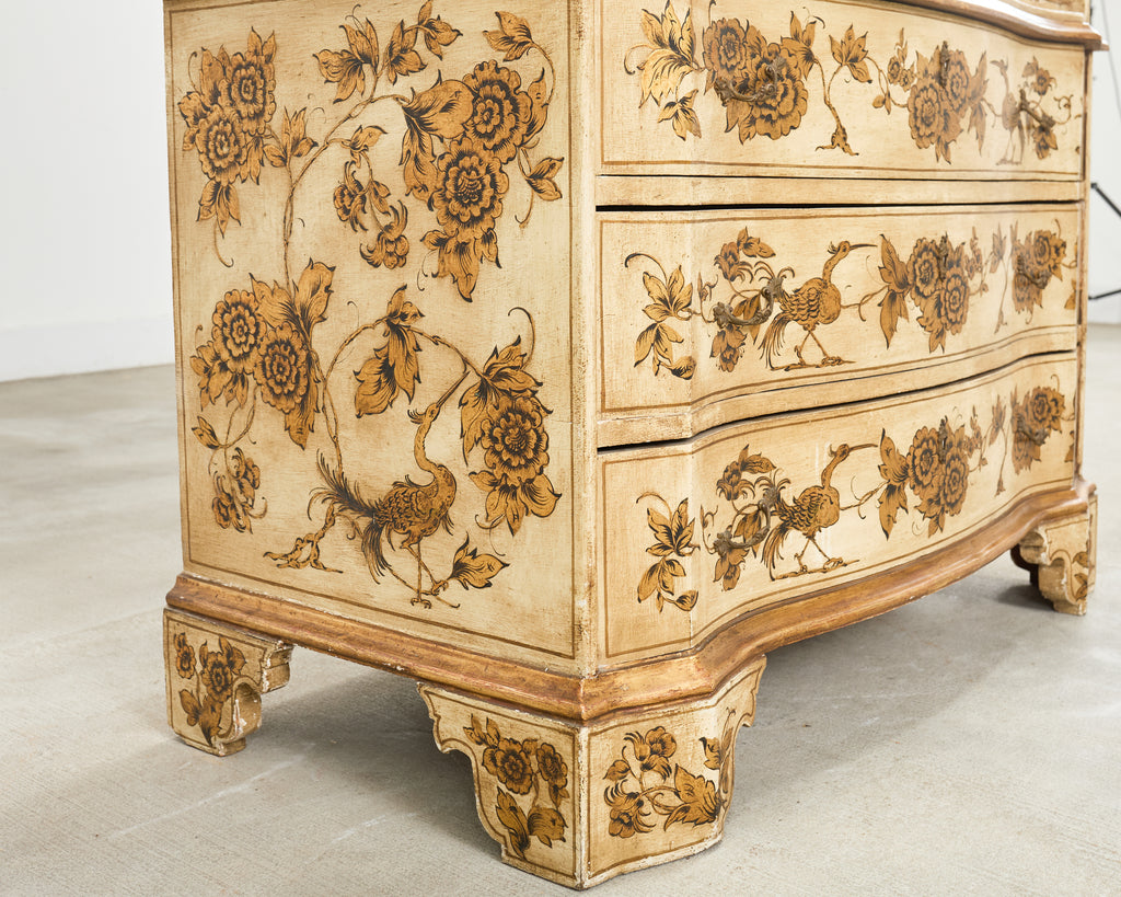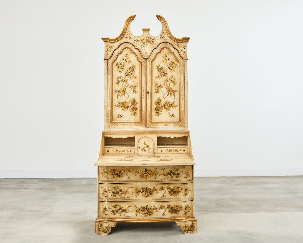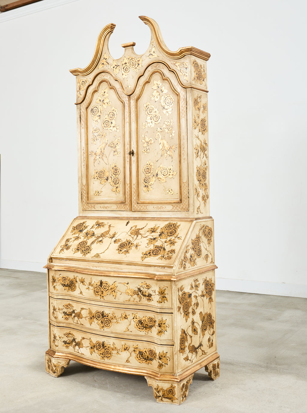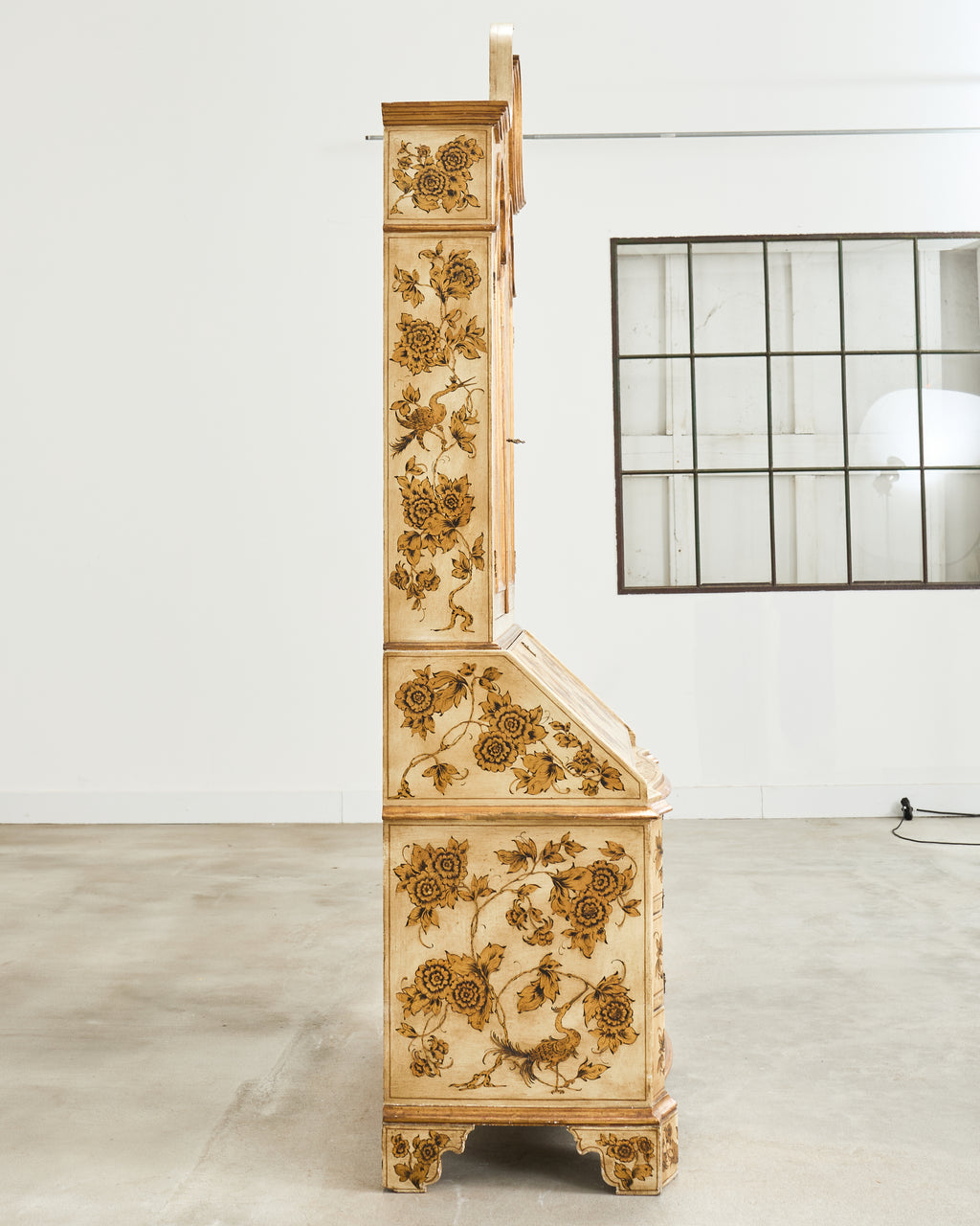Fantastic 20th century Italian lacquered secretary bookcase decorated in the Venetian taste with dramatic Chinoiserie motifs. The two-part case has an intentionally distressed painted finish to mimic age. The top of the bookcase has a split pediment with a cornice molding. The cabinet is fronted by two locking doors opening to a shelved interior. The bottom case has a slant or fall front secretaire desk with a large writing table and fitted drawers with cubbies for storage. Below the desk are three large storage drawers with patinated brass pulls and mahogany interiors. The entire piece is embellished with floral reserves in parcel gilt. The scenes include mythical birds and floral sprays in the orientalism aesthetic. The paintings have intricate details with dramatic gilt over a distressed cream painted background that provides a romantic light-filled palette. The original locking key is provided. The case is heavy and solid with excellent joinery and craftsmanship.