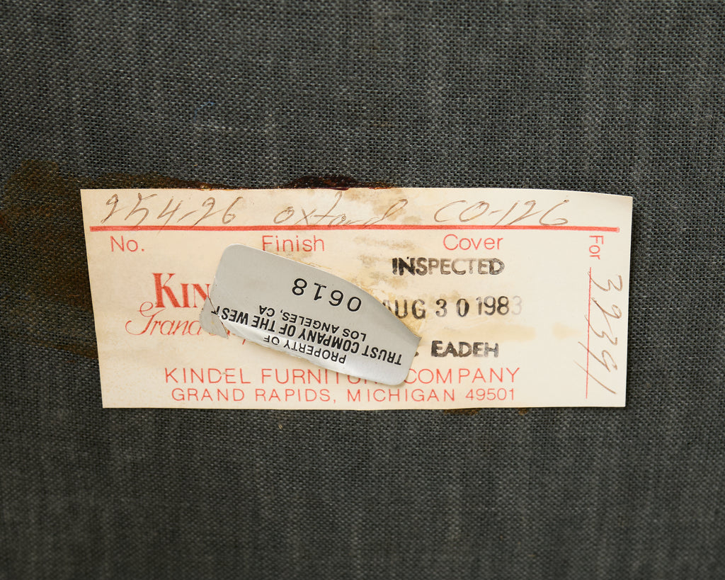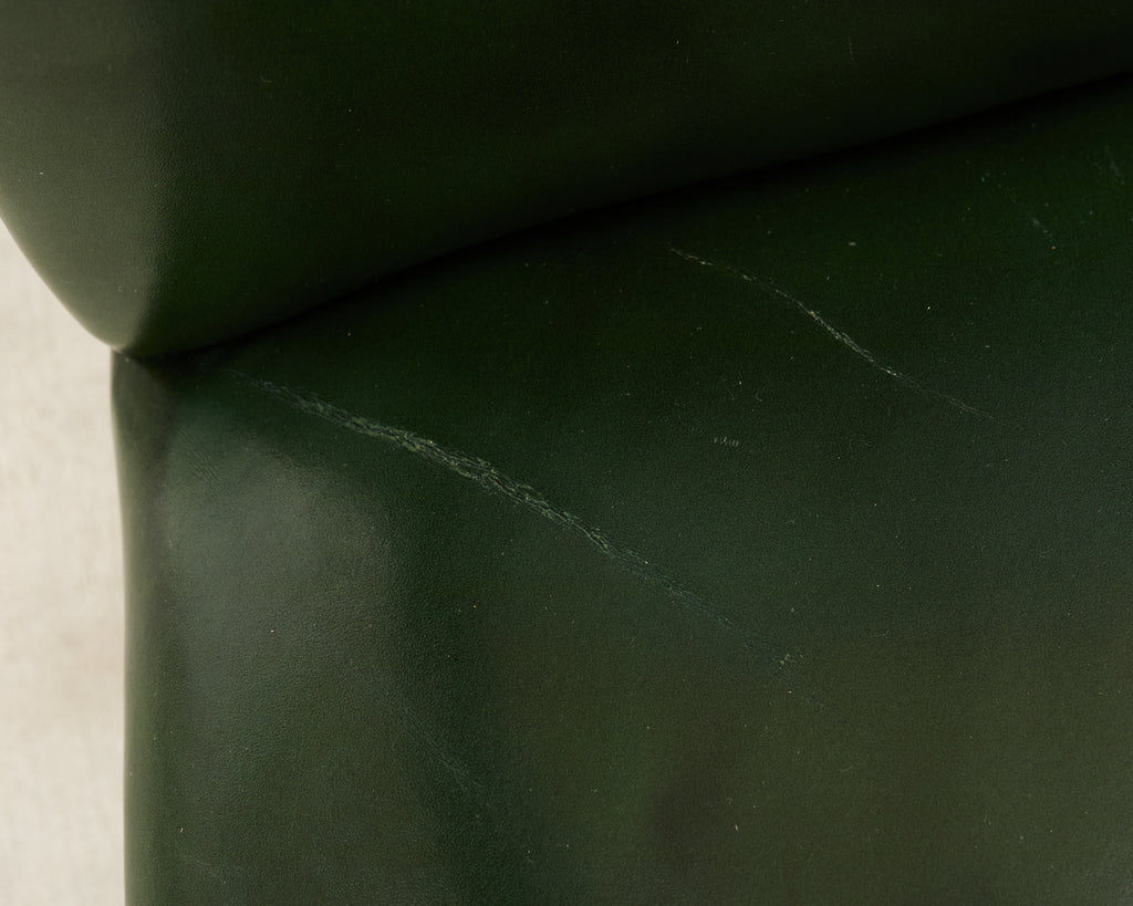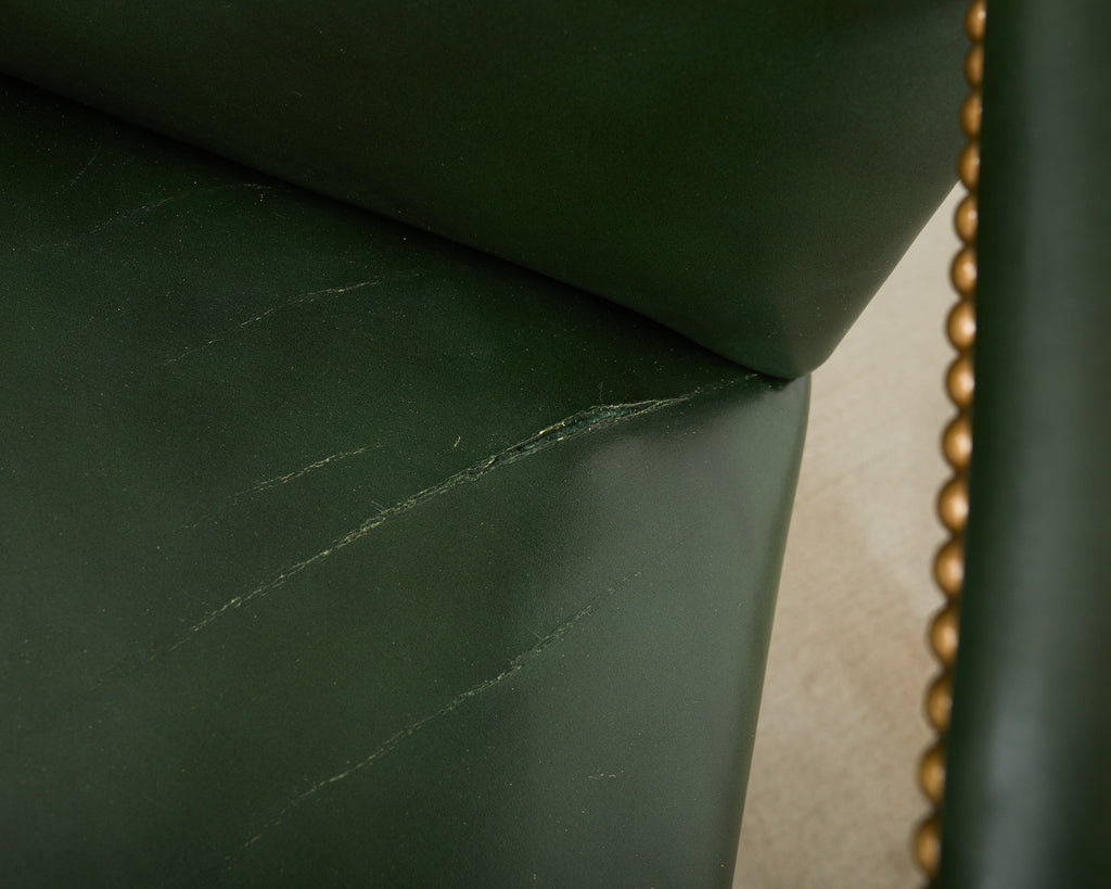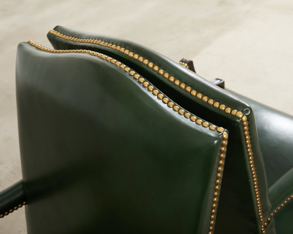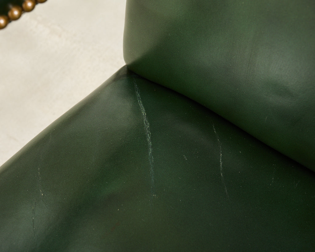 Important set of eight George III style English Gainsborough armchairs from the Robert A. Day (American 1943-2023) W.M Keck Foundation estate in Los Angeles, CA. Bespoke set of library armchairs crafted by Kindle Furniture circa 1983. The stately chairs retain the original order tags and trust company stamps. The large mahogany frames feature a classic flat back with an arched crest rail. The generous seat has padded arms measuring 25.5 inches high with gracefully curved arm supports. The frames are upholstered with opulent smooth leather hides in an English Oxford green color. The leather is bordered with patinated brass tack nail heads. The chairs are made on a grand scale with a classic English profile. Heavy and solid with excellent joinery and craftsmanship. Very good, well preserved condition. The leather is soft and supple with visible creases, but no rips, tears, or losses. Sold as a set of eight. Could also serve as dining chairs.
