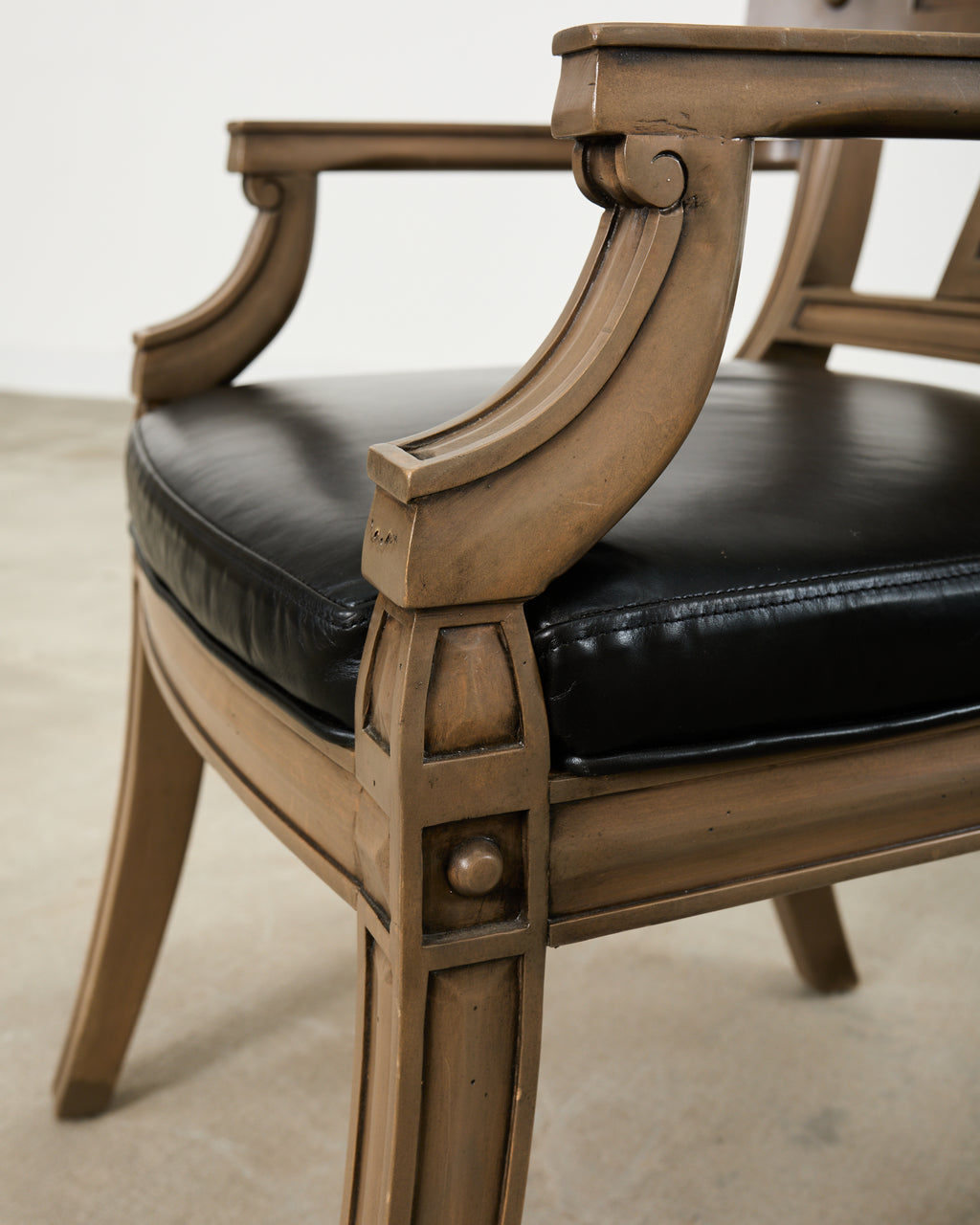 Stylish set of eight lacquered neoclassical klismos dining armchairs attributed to Michael Taylor. The chairs feature solid beech carved frames with a klismos style tablet back and wide, flat arms measuring 26 inches high. The generous seat is fitted with a black leather covered seat cushion. The chairs are finished in an earthy mushroom color lacquer finish with dramatic black leather seats. The frames have a neoclassical silhouette with gently curved back and saber legs. The chairs are sturdy and strong with excellent joinery and craftsmanship. The lacquer finish has an aged patina to commensurate age and use. Sold as a set of eight. Known as Michael Taylor white armchairs. The chairs are unmarked and probably have been re-upholstered in the past.