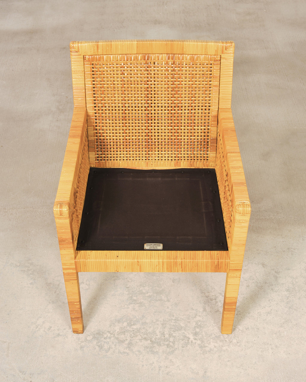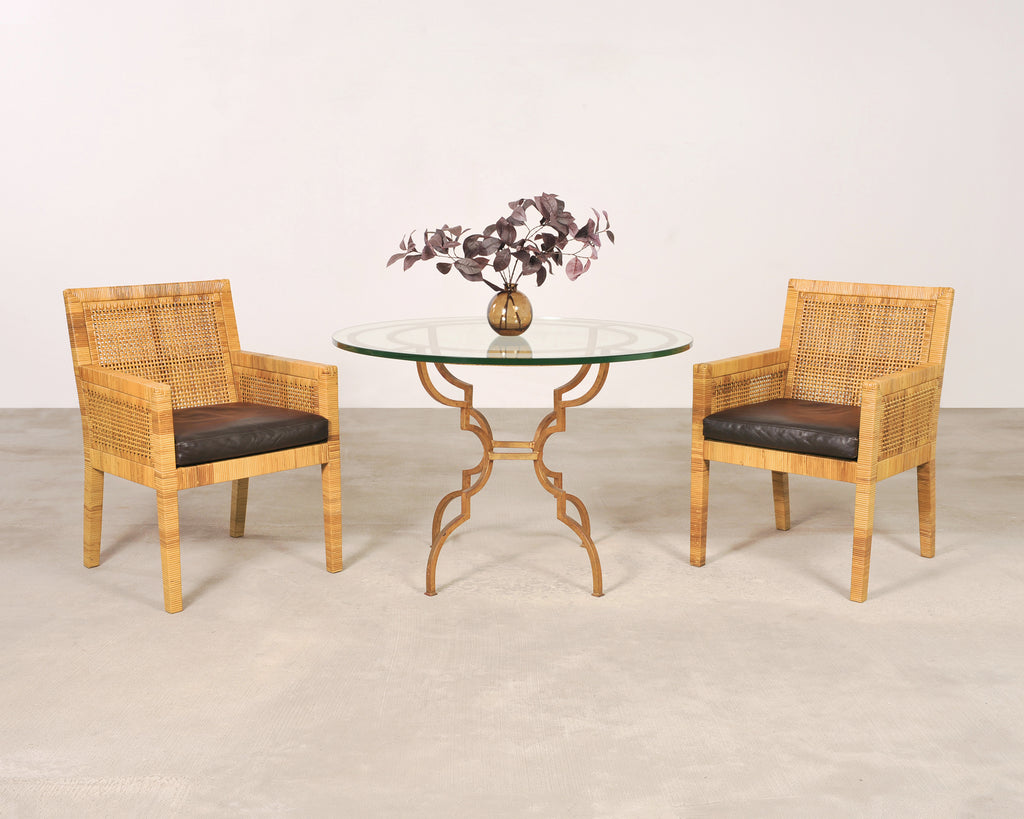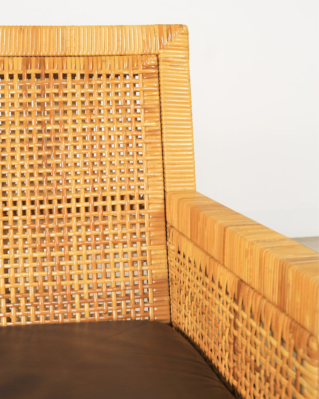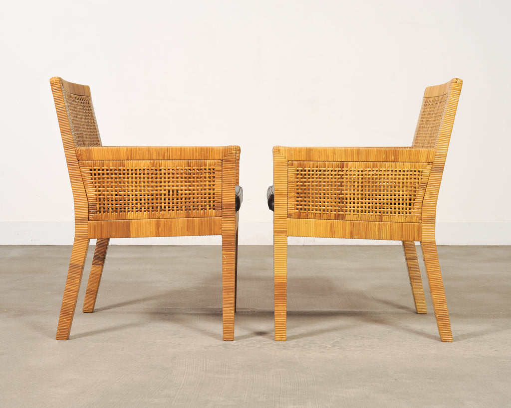 A sublime late 20th century set of four rattan cane dining armchairs designed by Billy Baldwin and hand-crafted by Bielecky Brothers, NY. The rare set consists of all dining armchairs model number (#C7651). Each chair features an architectural hardwood frame meticulously reed-wrapped for a refined ribbed texture. The sides and back feature organic woven cane panels, lending a visual lightness and depth to the profile of the chairs. The seats are supported by straight, slender legs which are slightly splayed on the rear. The chairs are fitted with loose, boxed faux leather naugahyde seat cushions in a rich textured dark chocolate brown tone. The cushions create a sharp contrast with the honey toned rattan. The frames are sturdy and strong having excellent joinery and craftsmanship. The rattan cane finish is well preserved in exceptional condition as seen in photos. Distinctive refined profile blending Organic Modern, California Coastal, and Palm Beach styles. The chairs are suitable for a variety of interiors. Chairs retain the original Bielecky Brothers, New York maker's plaques on the bottoms of each seat. Arms of the chairs measure 25" high. Sold as a set of four. From an estate in Beverly Hills, CA.