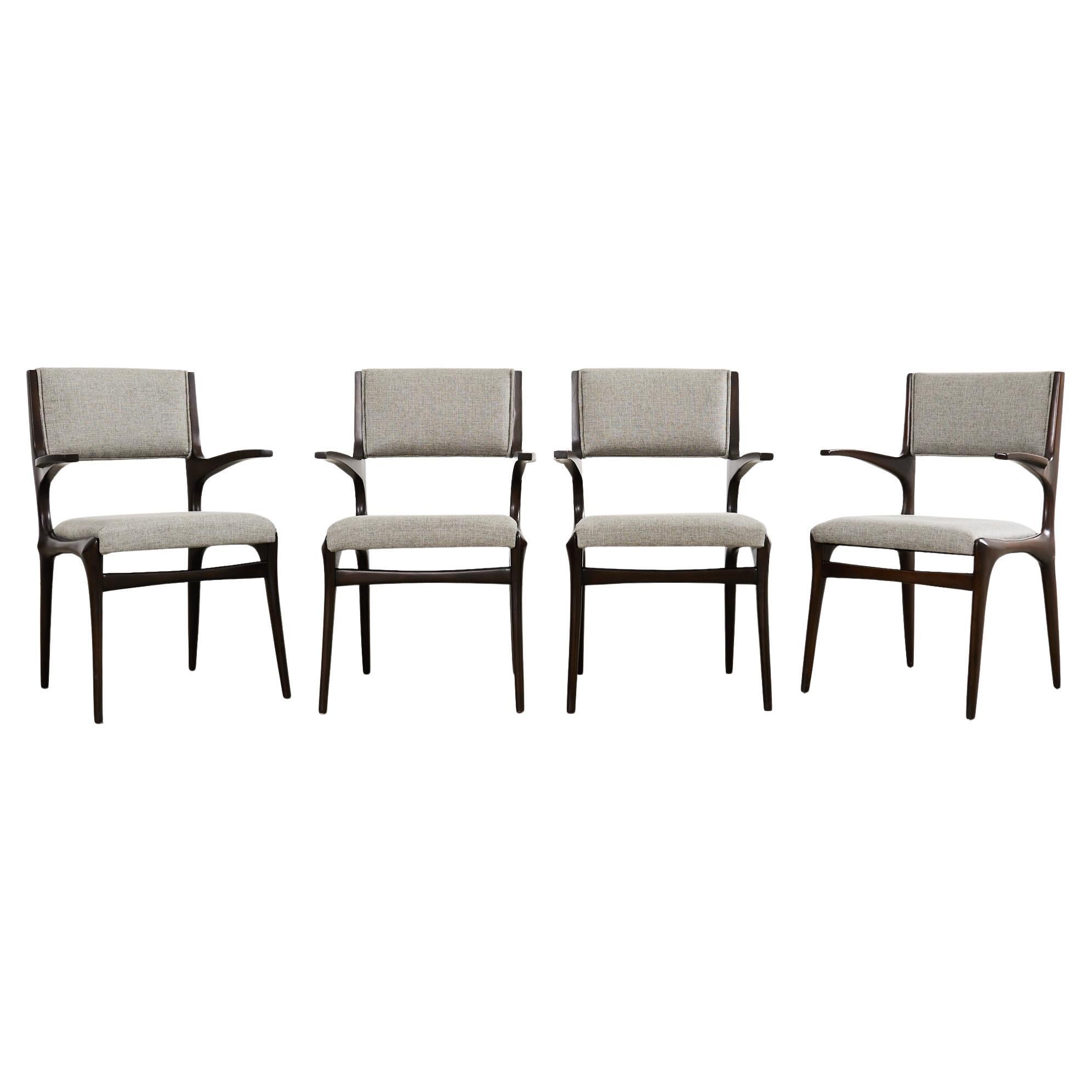 Rare set of four mid-century modern Italian walnut dining armchairs designed by Carlo De Carli (Italian 1910-1999) for Cassina. The set consists of all armchairs model #585 with a rich, dark walnut finish. The original velvet has been upgraded with new fabric with a textured linen style. The design for the chairs was presented at the XI Triennale of Milan in 1951. The chairs are sturdy and strong with excellent joinery and craftsmanship having old repairs as expected given age and use. From an estate in Bel Air, CA. Sold as a set of four.