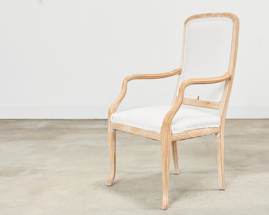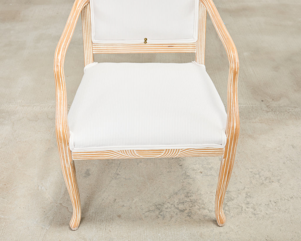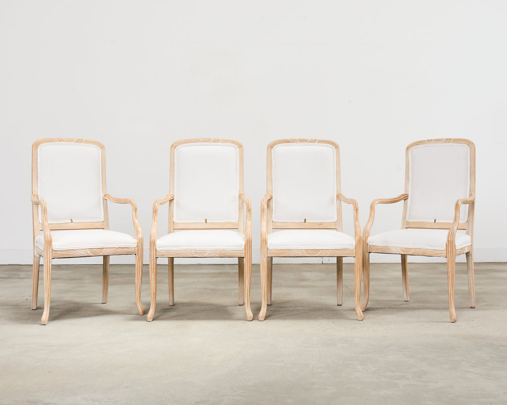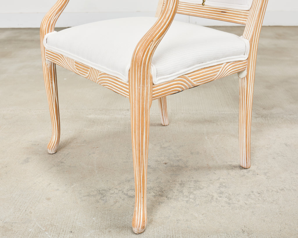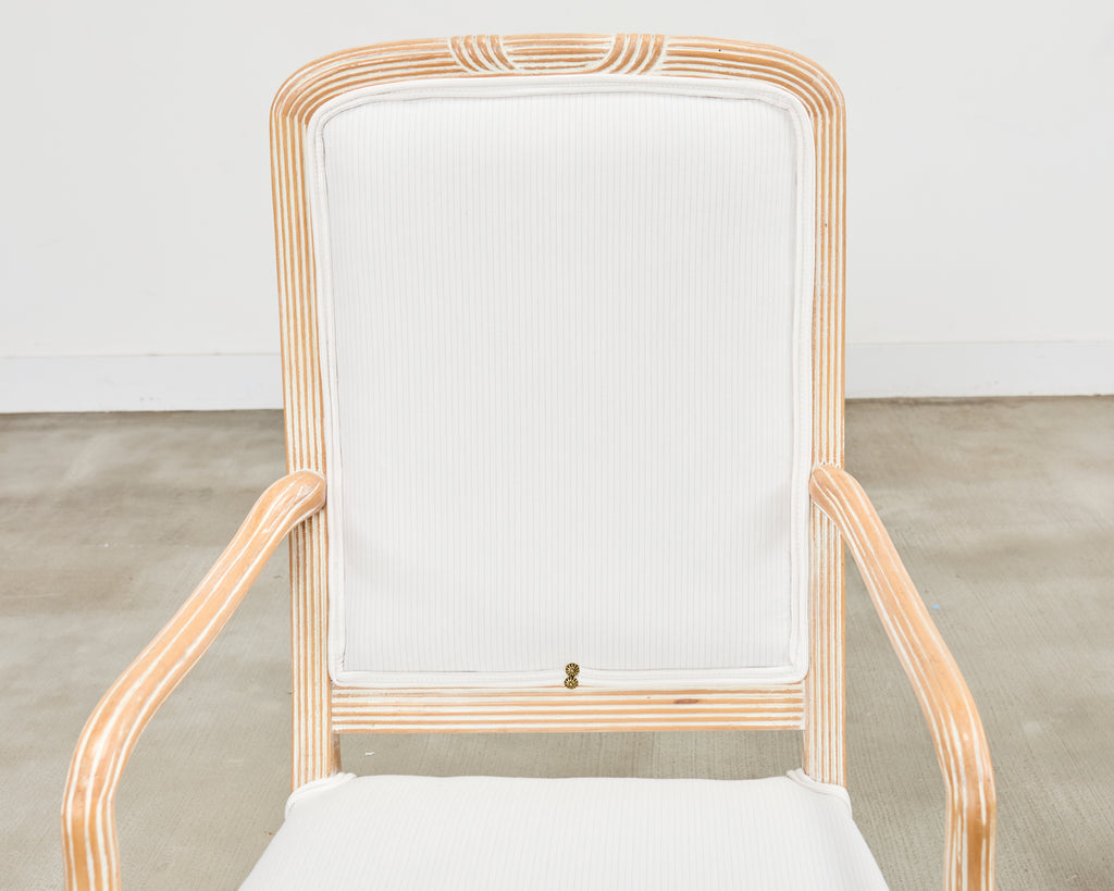 Stylish set of four blonde birchwood dining armchairs featuring a reeded and cerused finish. The frames are crafted in the regency taste with a carved, reeded finish. The wood has a cerused applied white lacquer that showcases the reeded design. The chairs are sturdy and strong with excellent joinery and craftsmanship. The frames have been newly re-upholstered with an off-white fabric having delicate pen stripes. The design is light and airy with a coastal aesthetic in the manner and style of McGuire and Bielecky Bros. The thin frames have sculptural fluidity with a handsome silhouette. The arms are gracefully curved and the seats are supported by Cabriole inspired legs.