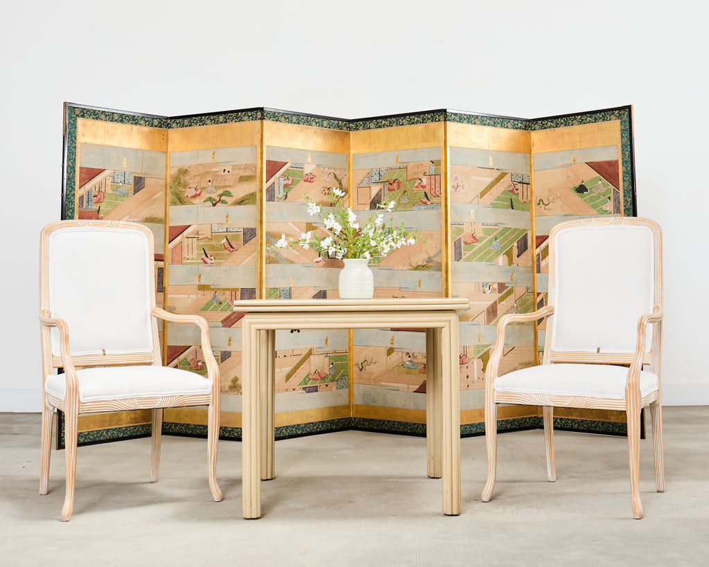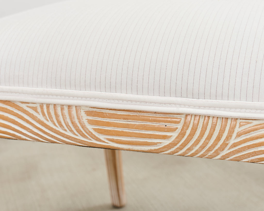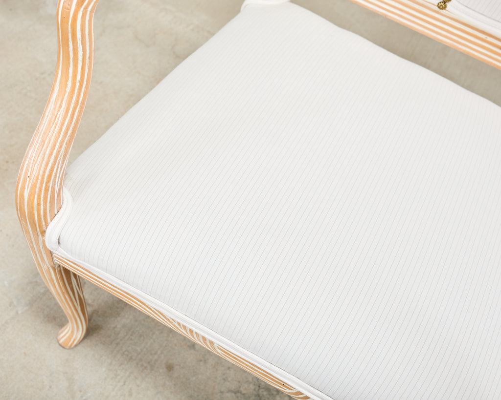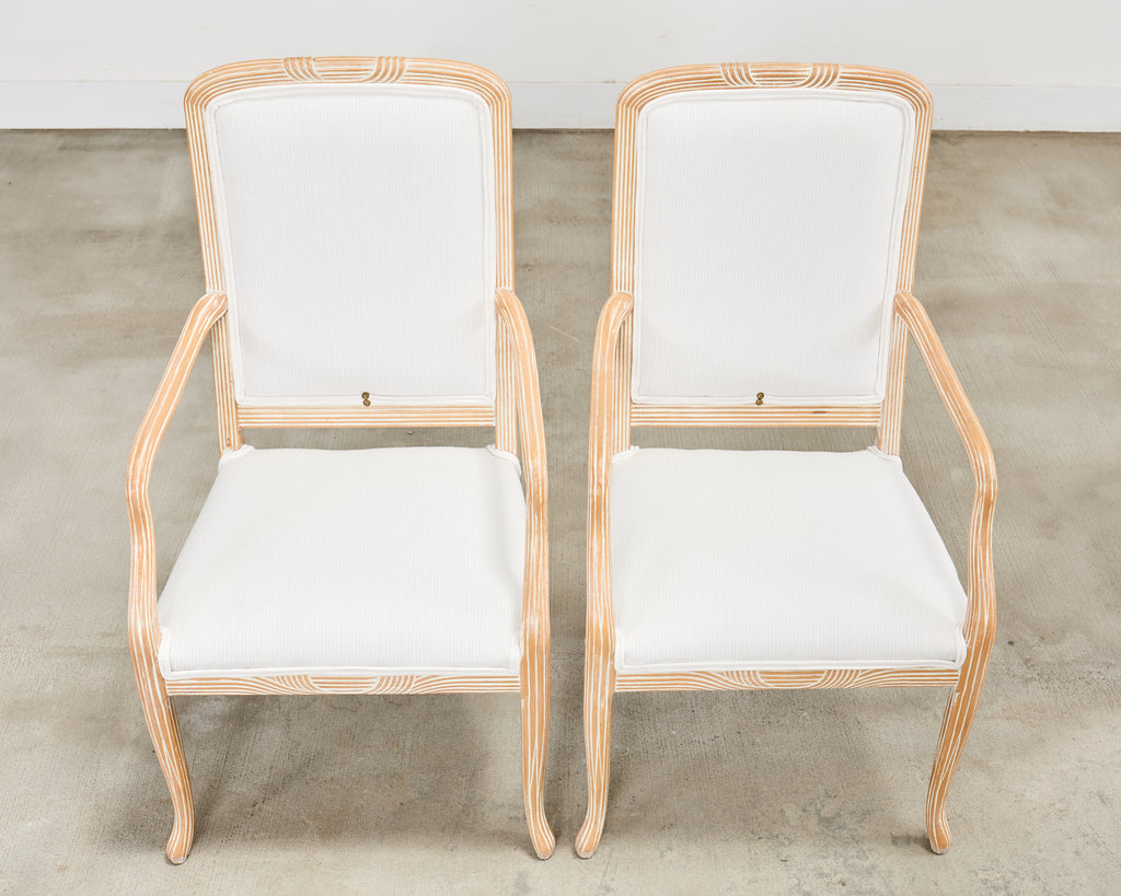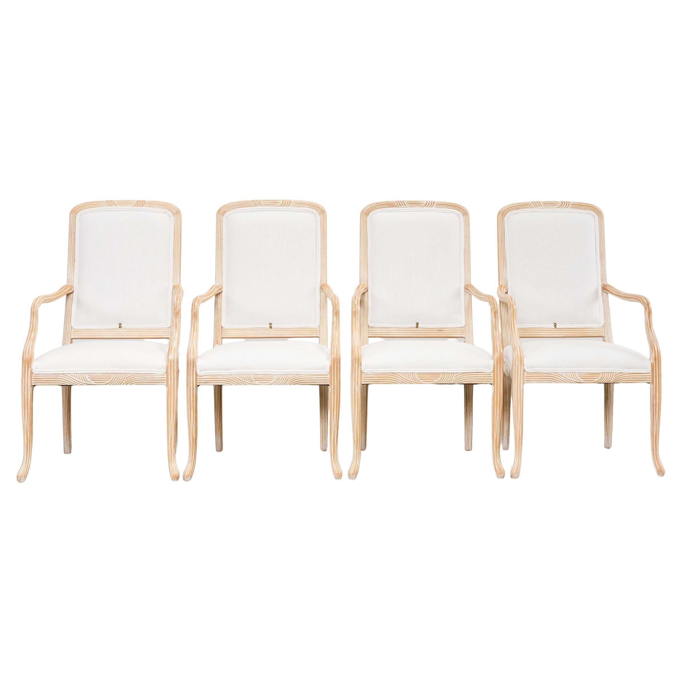 Stylish set of four blonde birchwood dining armchairs featuring a reeded and cerused finish. The frames are crafted in the regency taste with a carved, reeded finish. The wood has a cerused applied white lacquer that showcases the reeded design. The chairs are sturdy and strong with excellent joinery and craftsmanship. The frames have been newly re-upholstered with an off-white fabric having delicate pen stripes. The design is light and airy with a coastal aesthetic in the manner and style of McGuire and Bielecky Bros. The thin frames have sculptural fluidity with a handsome silhouette. The arms are gracefully curved and the seats are supported by Cabriole inspired legs.