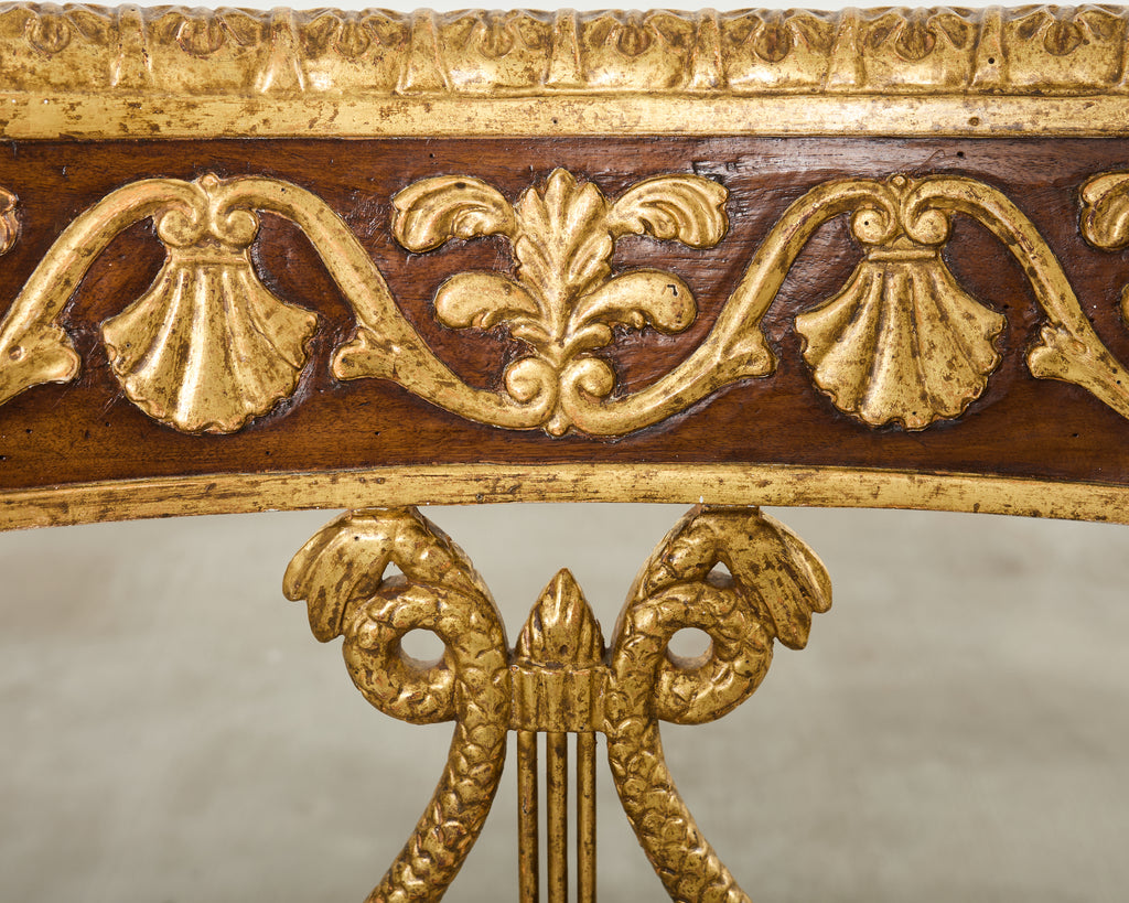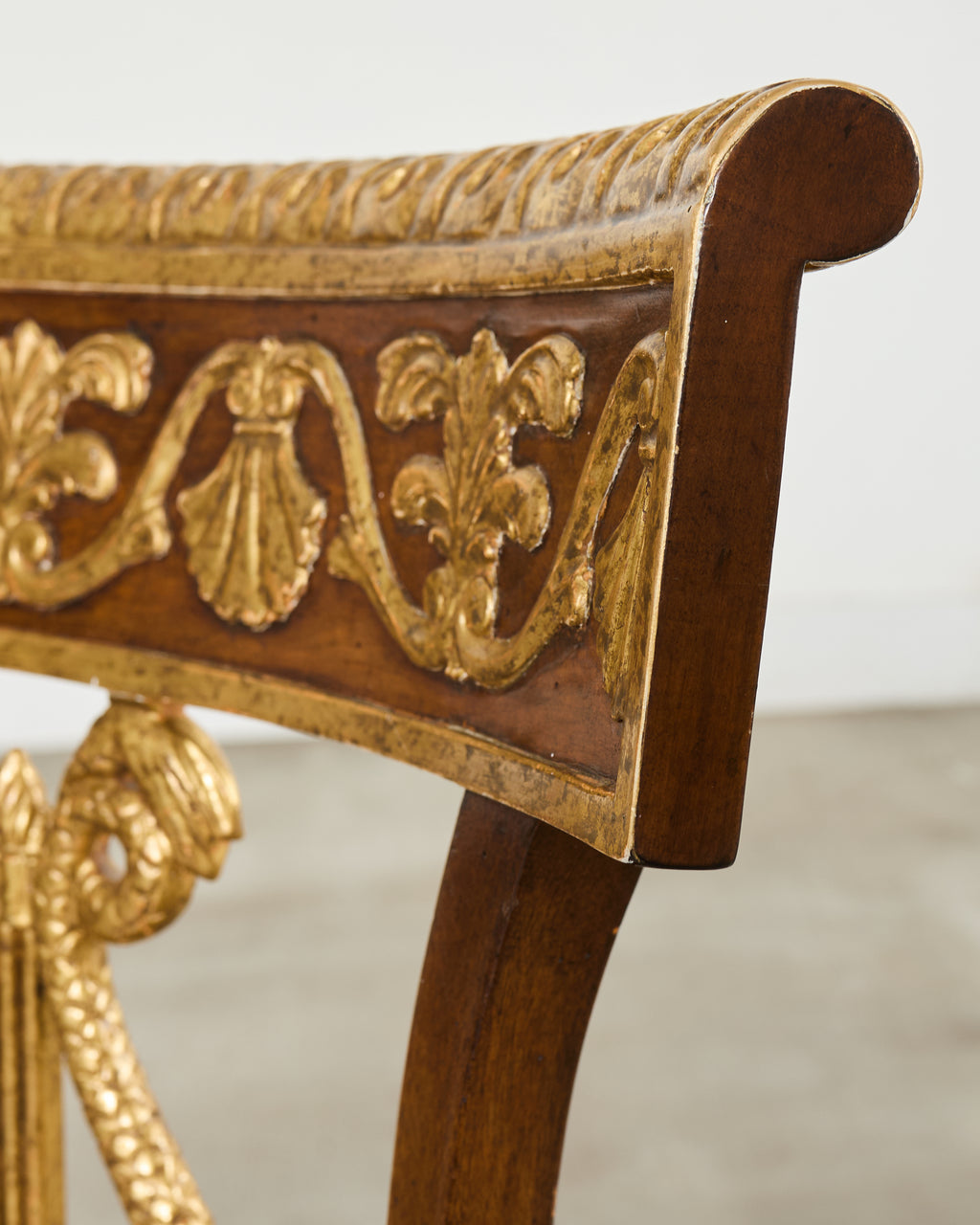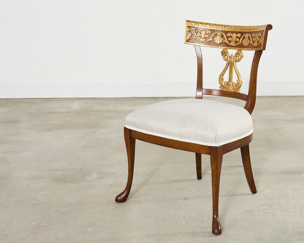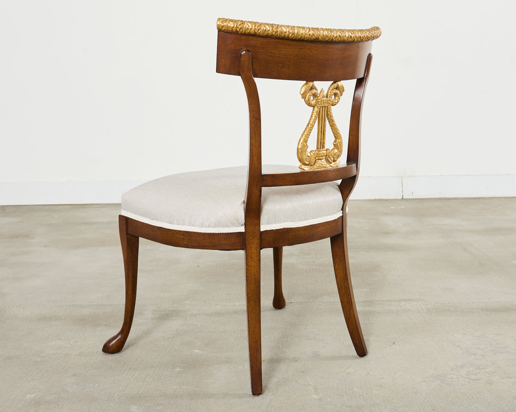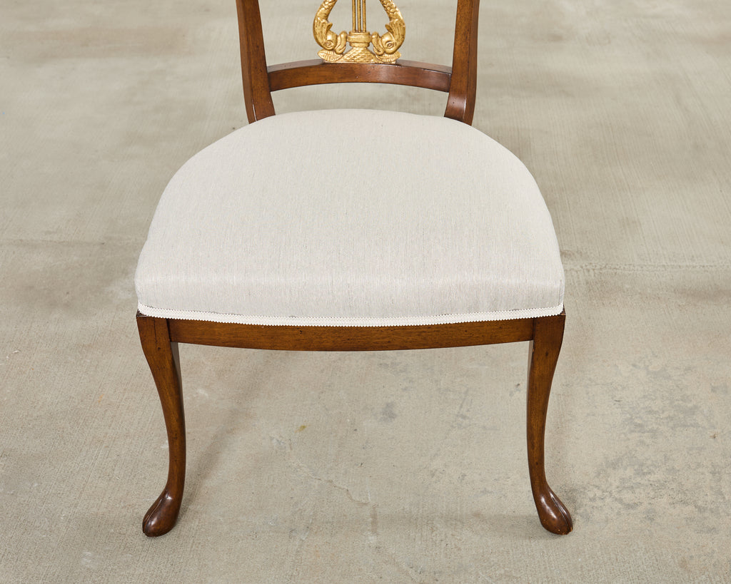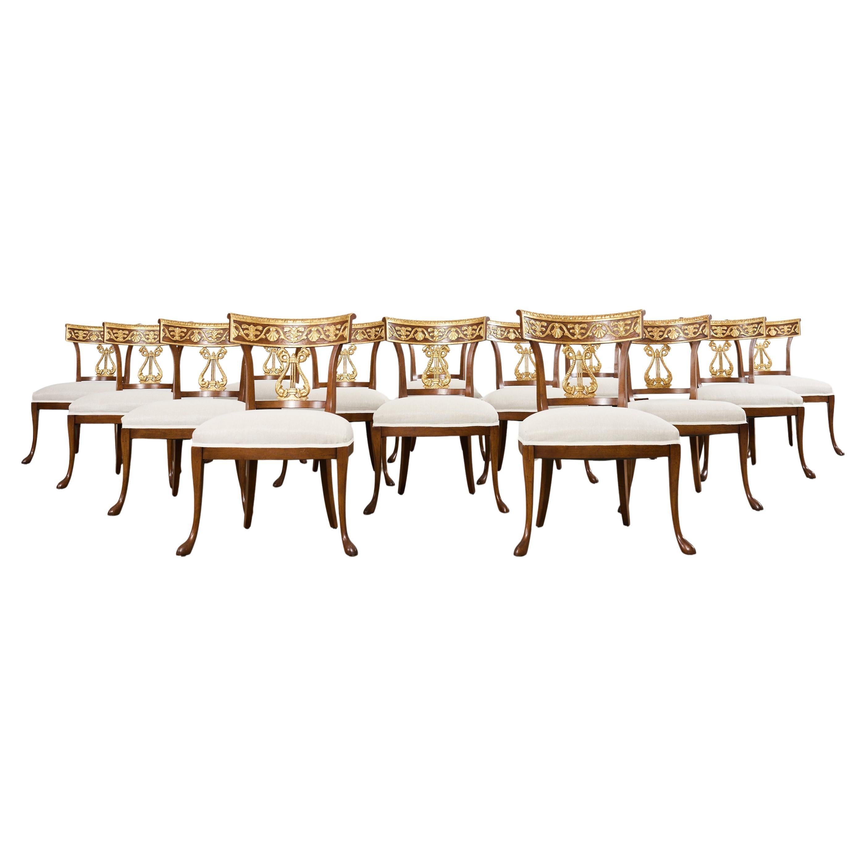 Remarkable grand set of fourteen neoclassical style dining chairs designed by Nancy Corzine in the California romantic style. The chairs feature a walnut frame with a klismos style tablet back decorated with 22k gold. The back splat has a dramatic neoclassical style double dolphin motif in the shape of a lyre. The seat crest is embellished with carved acanthus and rocaille carving having a gadrooned border in gilt. Newly upholstered seat cushions in a cream toned fabric. The legs are gracefully splayed in the front ending with a subtle pad foot. The chairs are in very good, well-preserved condition. The frames are solid and sturdy having excellent joinery and craftsmanship. Sold as a grand set of 14.