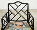 Extraordinary set of ten black lacquered faux-bamboo dining chairs designed in the Chinese Chippendale taste. The set consists of all armchairs with arms measuring 27.25 inches high. The chairs feature thick carved beech wood with a faux bamboo motif finished in a dramatic black lacquer. The seats are upholstered with a colorful chinoiserie style fabric with an Indian motif. The fabric is bordered by a double welt in ruby red. The chairs are heavy and solid with excellent joinery and craftsmanship. The vintage fabric shows well and is very presentable. Sold as a set of 10. From an estate in Beverly Hills, California. The chairs have a lovely open fretwork design on the back and sides with humped seat crest.