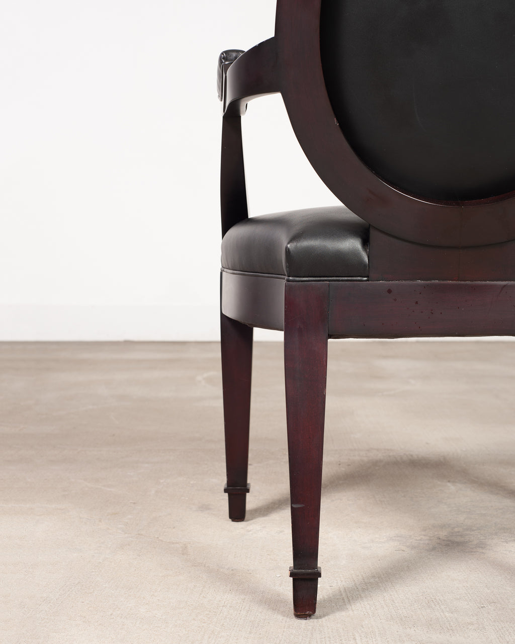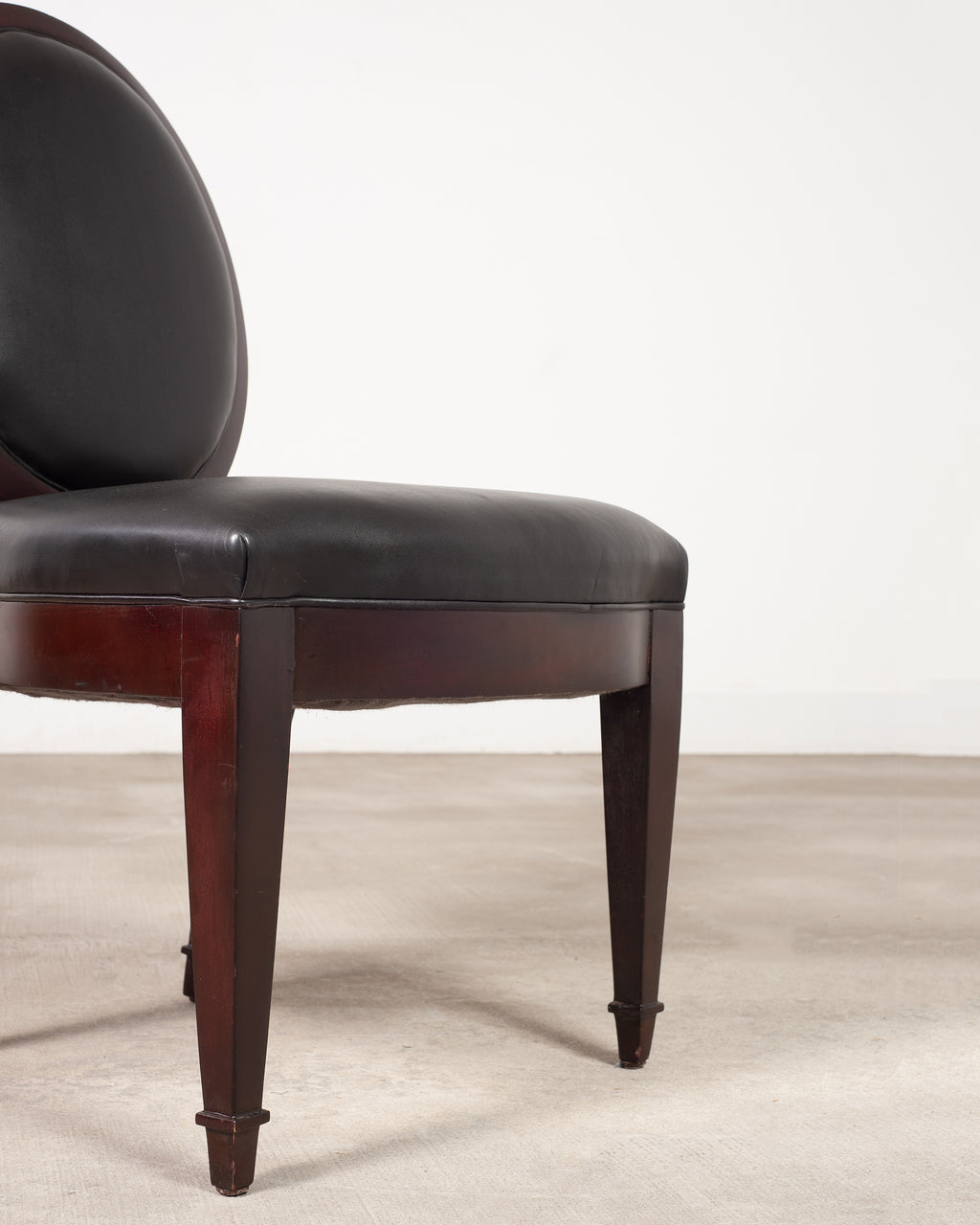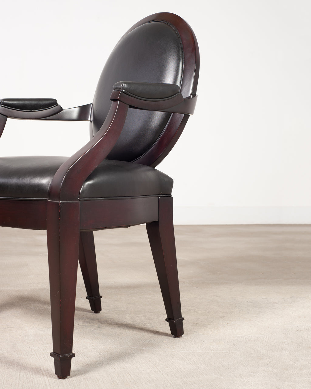 Substantial set of ten "Grand Soleil" black leather and mahogany dining chairs designed by John Hutton for Donghia. The imposing set consists of eight side chairs and two host armchairs. The chairs feature a rare smooth frame finish without a reeded or fluted carved decoration. The refined cameo or oval-back silhouette drawing inspiration from Neoclassical and Louis XVI styles while maintaining a clean, modern transitional profile. Each chair is constructed from a large dark stained mahogany frame and upholstered in a dramatic black leather finish, creating an espresso-toned palette. The chairs have thick, generously padded back panels and seats for comfort. The armchairs are distinguished by elegantly curved arms fitted with upholstered arm caps. The legs are tapered with a subtle cuff detailing. The chairs are sturdy and strong with excellent joinery and craftsmanship. Exceptional condition with minor chips and scuffs commensurate age and use. Makers label on bottom of chairs. Sold as a set of ten. Erin Lane Estate specializes in European style dining chairs with over 1000 in stock ready to ship from our California warehouse. The armchairs measure 24" wide, 24.5 deep, 37.25" high, 19" seat height, with a 27" arm height. The side chairs measure 23" wide, 24.5" deep, 37.25" high, and 19" seat height.