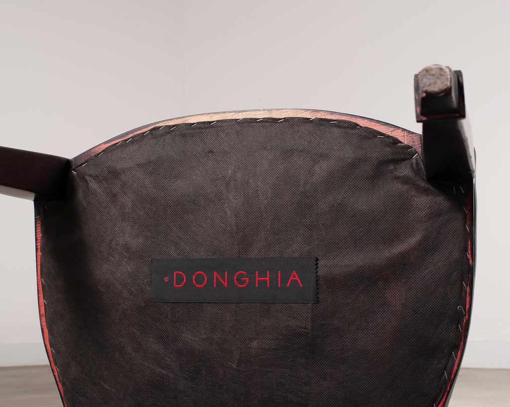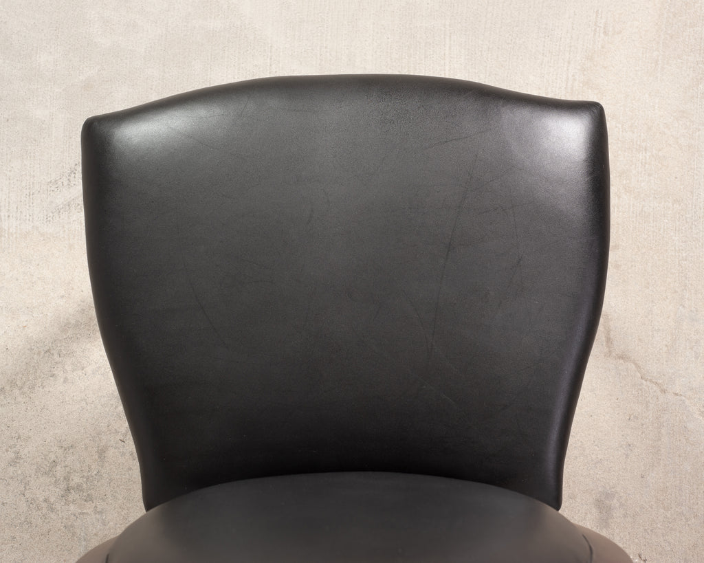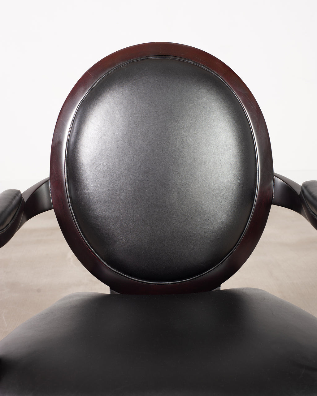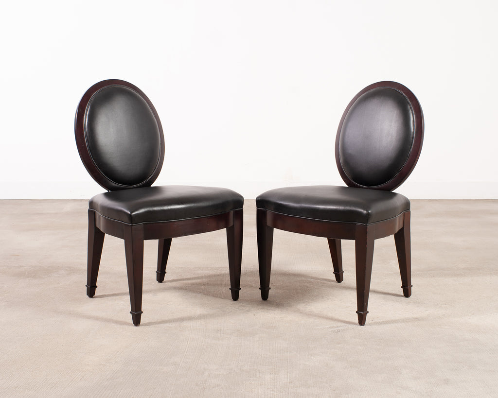 Substantial set of ten "Grand Soleil" black leather and mahogany dining chairs designed by John Hutton for Donghia. The imposing set consists of eight side chairs and two host armchairs. The chairs feature a rare smooth frame finish without a reeded or fluted carved decoration. The refined cameo or oval-back silhouette drawing inspiration from Neoclassical and Louis XVI styles while maintaining a clean, modern transitional profile. Each chair is constructed from a large dark stained mahogany frame and upholstered in a dramatic black leather finish, creating an espresso-toned palette. The chairs have thick, generously padded back panels and seats for comfort. The armchairs are distinguished by elegantly curved arms fitted with upholstered arm caps. The legs are tapered with a subtle cuff detailing. The chairs are sturdy and strong with excellent joinery and craftsmanship. Exceptional condition with minor chips and scuffs commensurate age and use. Makers label on bottom of chairs. Sold as a set of ten. Erin Lane Estate specializes in European style dining chairs with over 1000 in stock ready to ship from our California warehouse. The armchairs measure 24" wide, 24.5 deep, 37.25" high, 19" seat height, with a 27" arm height. The side chairs measure 23" wide, 24.5" deep, 37.25" high, and 19" seat height.