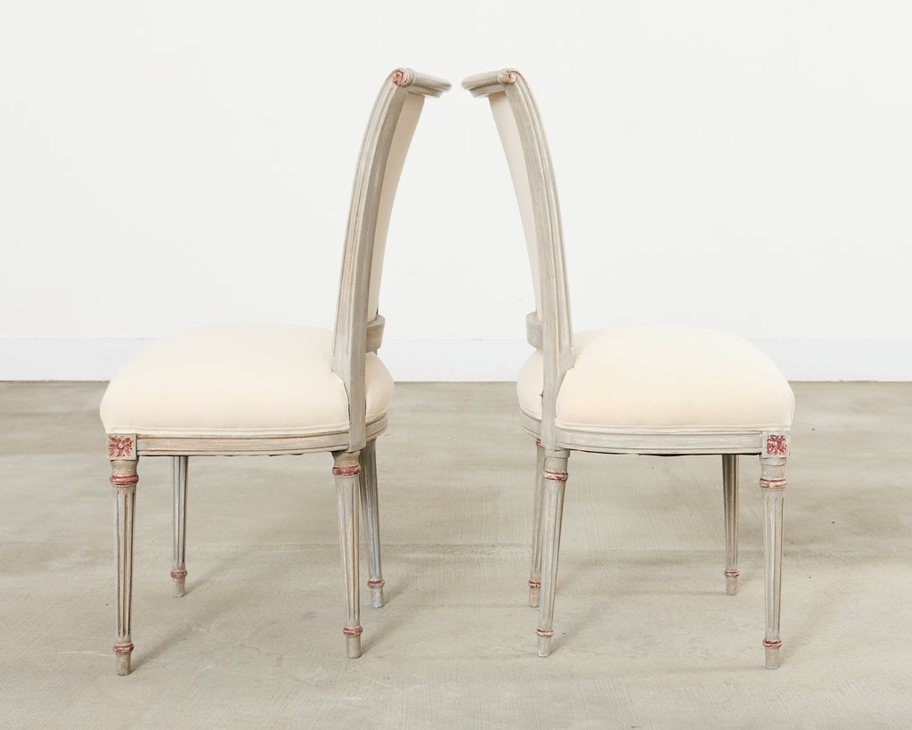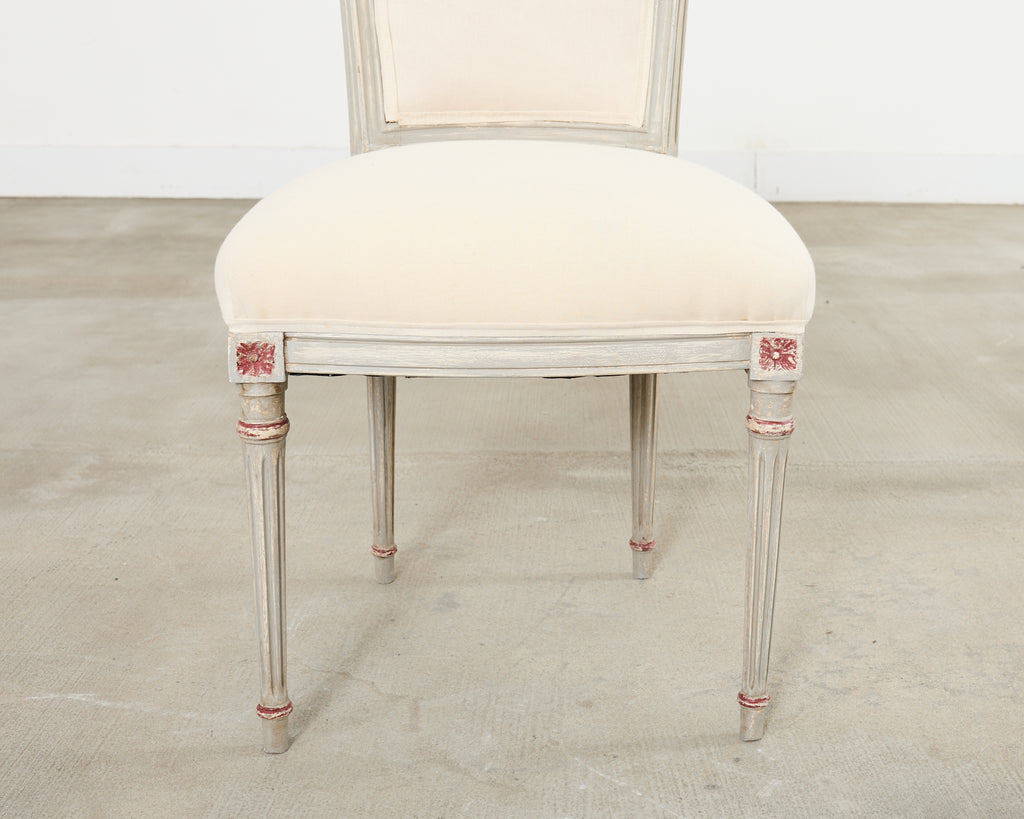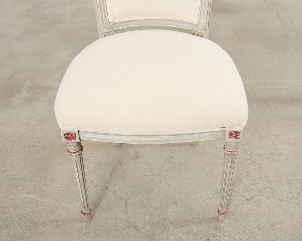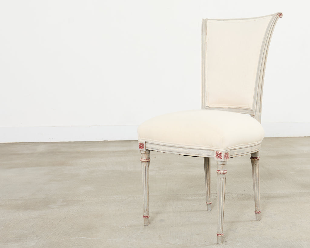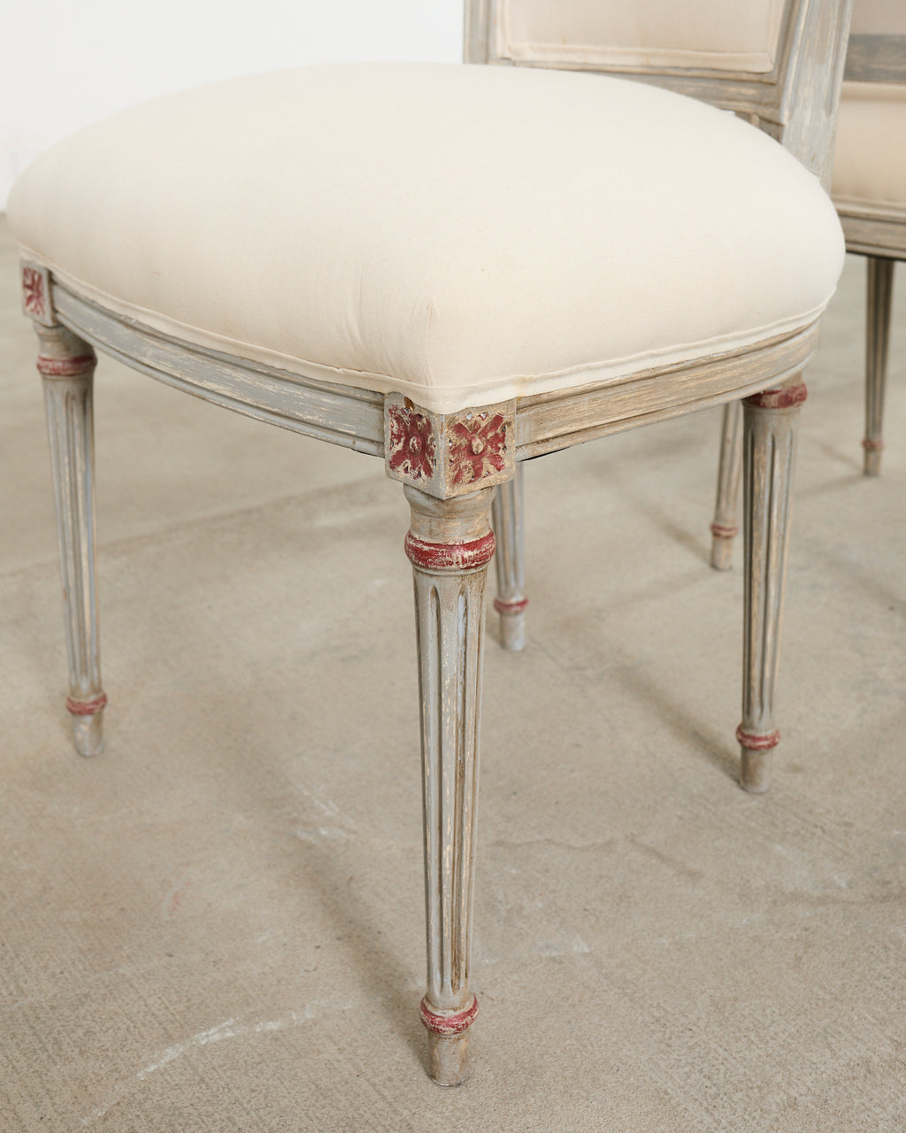 Glorious set of twelve Swedish dining chairs crafted in the Louis XVI Gustavian taste. The chairs feature beech frames that have been painted or glazed with an intentionally distressed and faded patina to mimic age. The grey painted frames have a sculptural flared back ending with a scroll. The generous seats have carved rosettes on the front apron corners and decorative red accents throughout the frames. The seats are supported by fluted, tapered legs. The chairs have been recently reupholstered in a neutral muslin style fabric. The chairs are sturdy and strong with excellent joinery and craftsmanship. Sold as a set of twelve chairs. Erin Lane Estate specializes in European dining chairs with over 1000 in stock ready to ship from our California warehouse.