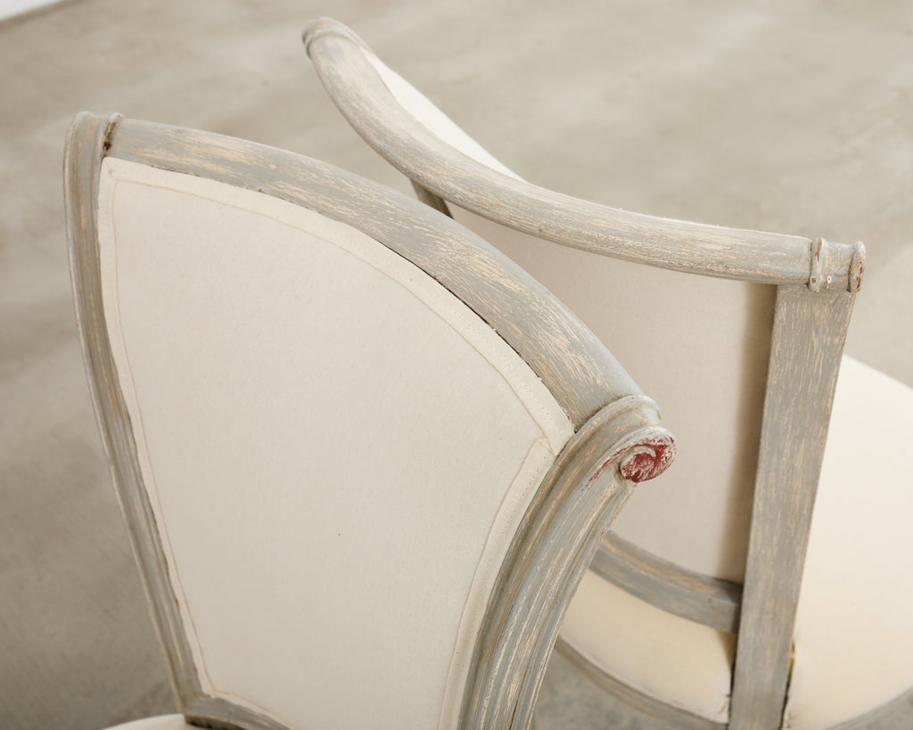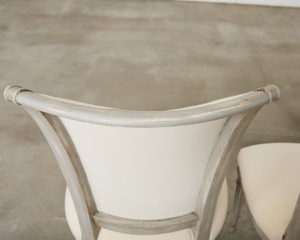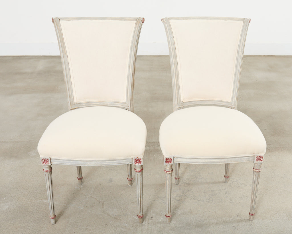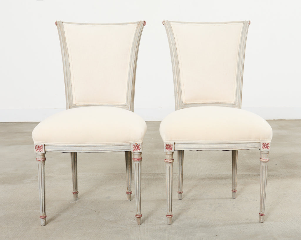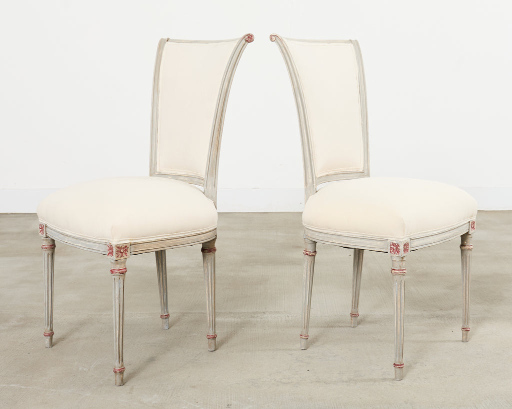 Glorious set of twelve Swedish dining chairs crafted in the Louis XVI Gustavian taste. The chairs feature beech frames that have been painted or glazed with an intentionally distressed and faded patina to mimic age. The grey painted frames have a sculptural flared back ending with a scroll. The generous seats have carved rosettes on the front apron corners and decorative red accents throughout the frames. The seats are supported by fluted, tapered legs. The chairs have been recently reupholstered in a neutral muslin style fabric. The chairs are sturdy and strong with excellent joinery and craftsmanship. Sold as a set of twelve chairs. Erin Lane Estate specializes in European dining chairs with over 1000 in stock ready to ship from our California warehouse.