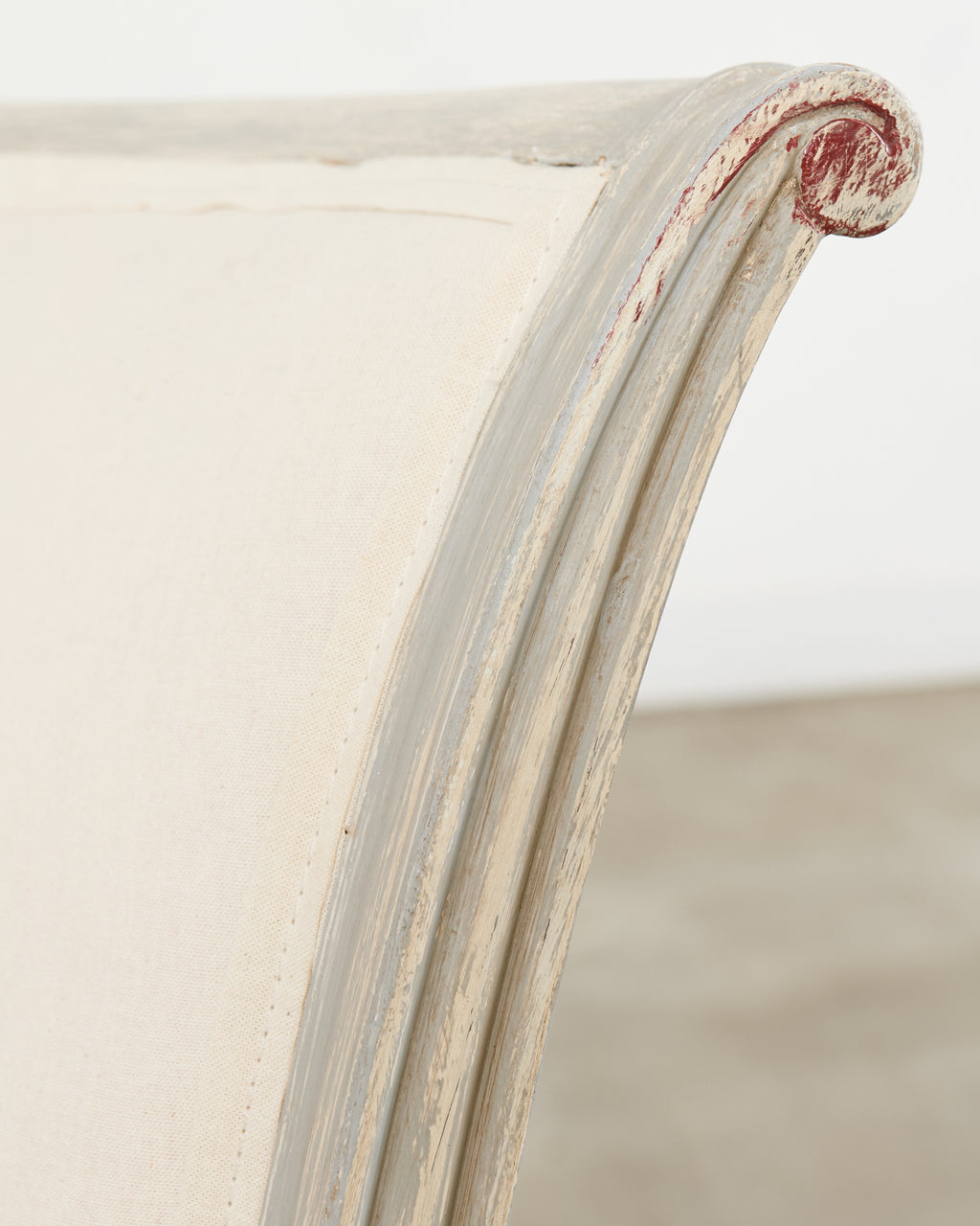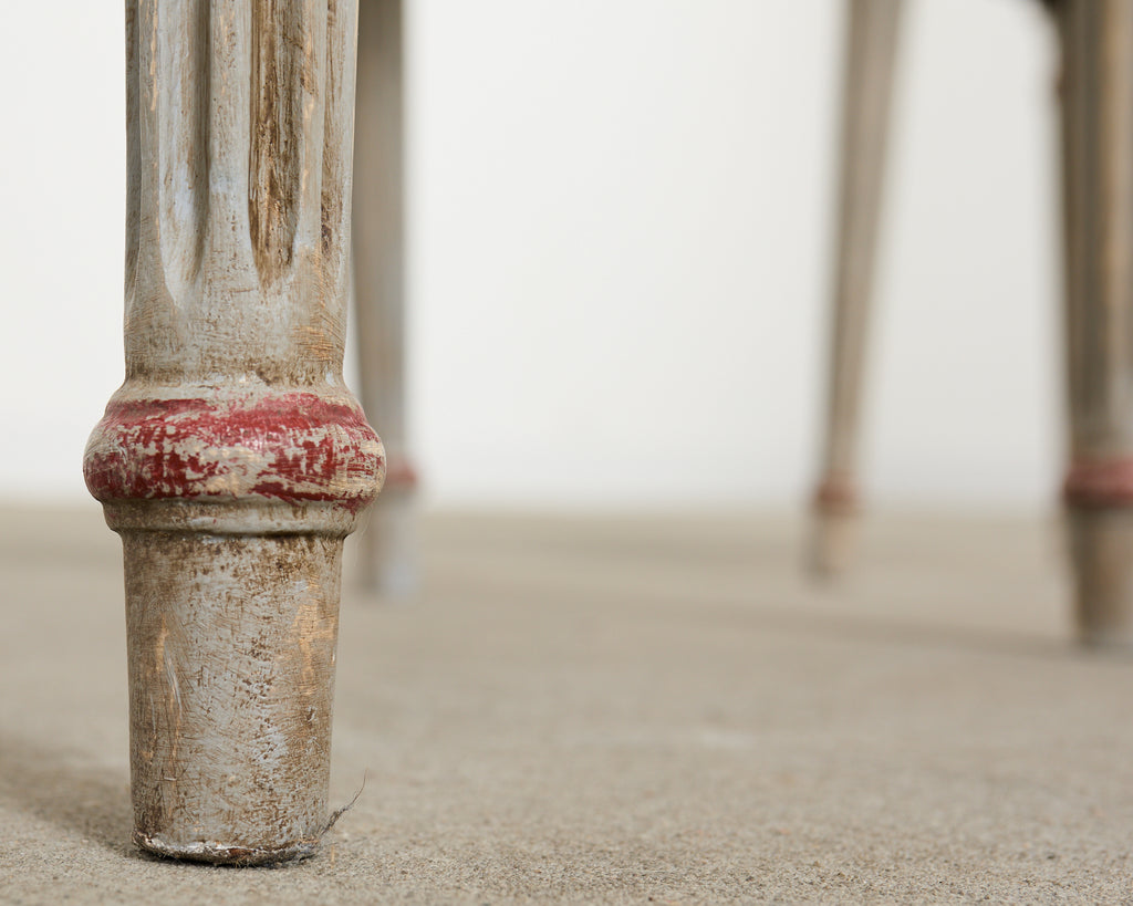 Condition: Good, wear consistent with age and use. Beautifully crafted with solid joinery and construction. Newly upholstered seats with muslin fabric. Intentionally distressed patina on the faded painted finish to mimic age as seen in photos.
