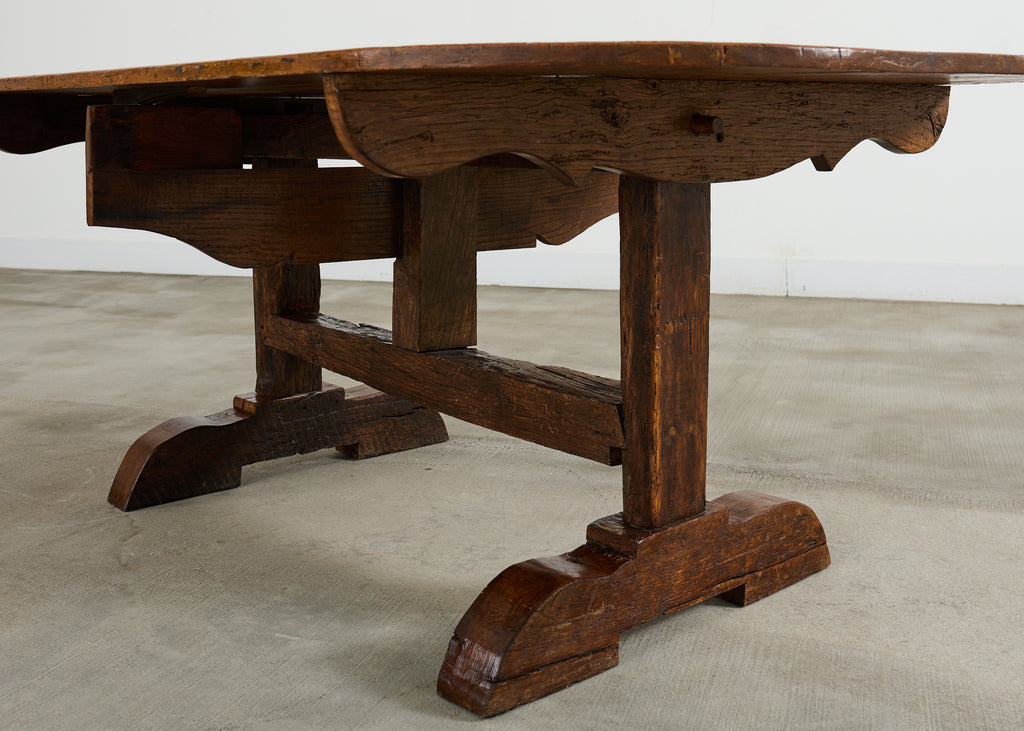 Rustic 19th century tilt-top wine tasting vendange dining table made on a large scale. The table features a thick top constructed from thick pine boards having rounded ends. The top is supported by a trestle base with a tilt-top mechanism. The legs are crafted of thick square columns ending with wide shoe feet. The wood has a desirable weathered patina on the finish full of character and charm to commensurate its age and use. The tilt top functions properly and the table is sturdy and strong. The country farmhouse aesthetic is further enhanced by the aged patina and wear. From a large winery in the Napa Valley, CA.