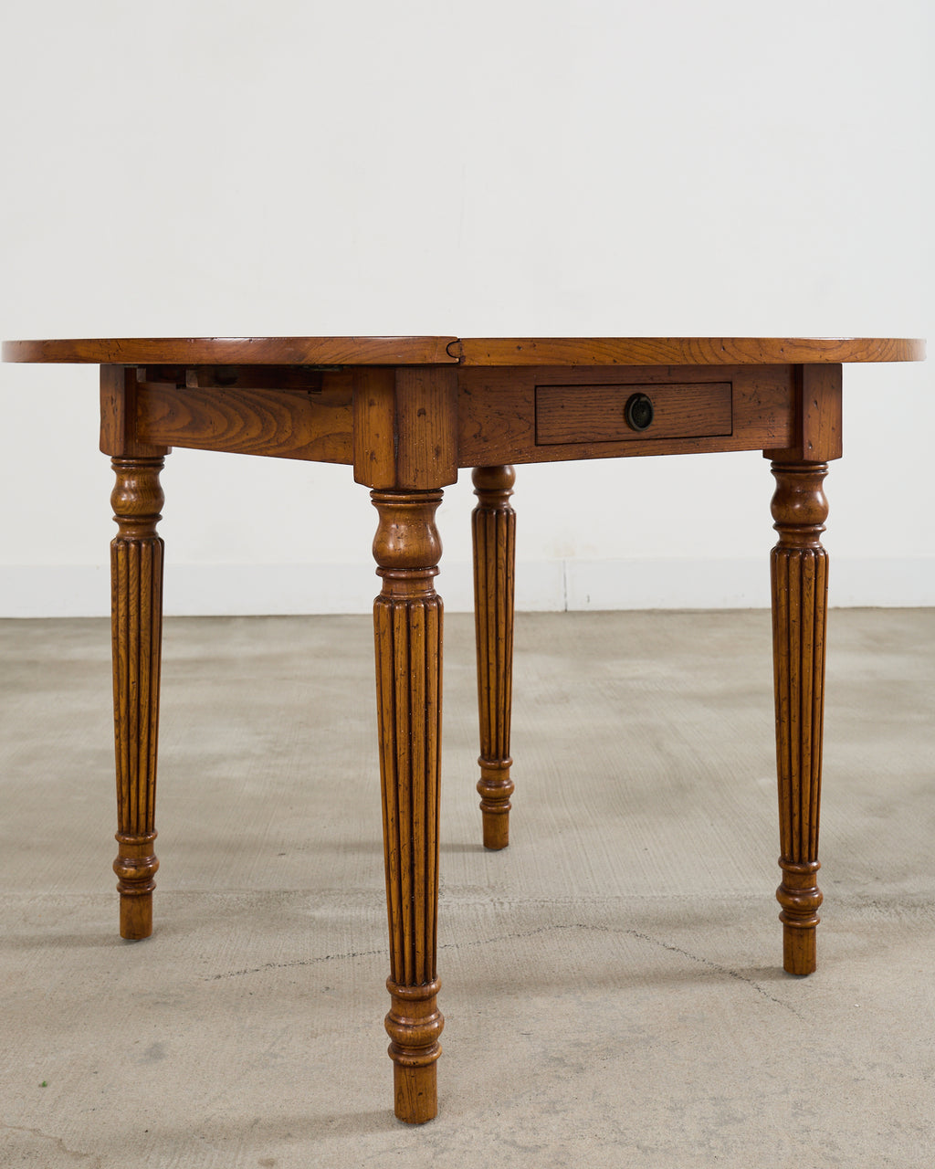 Charming and rustic country English provincial or Louis Philippe style round farmhouse breakfast table or dining table. The English table features drop leaves on each side which convert the round table to a 29.5 inch wide console when closed. The table is crafted from mixed woods including oak and walnut. The wood has an intentionally aged patina to mimic an 18th or 19th century piece. The finish has a warm, dark honey tone with rich woodgrains. The apron measures over 25 inches from the floor for ample legroom and has a small oak storage drawer. The top is supported by distinctive fluted legs ending with peg feet. Erin Lane Estate specializes in European farm tables with over 100 in stock ready to ship from our California warehouse.
