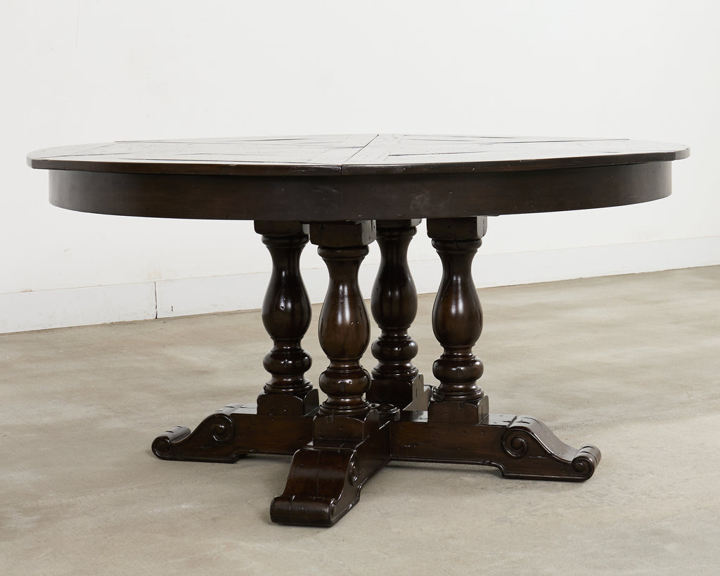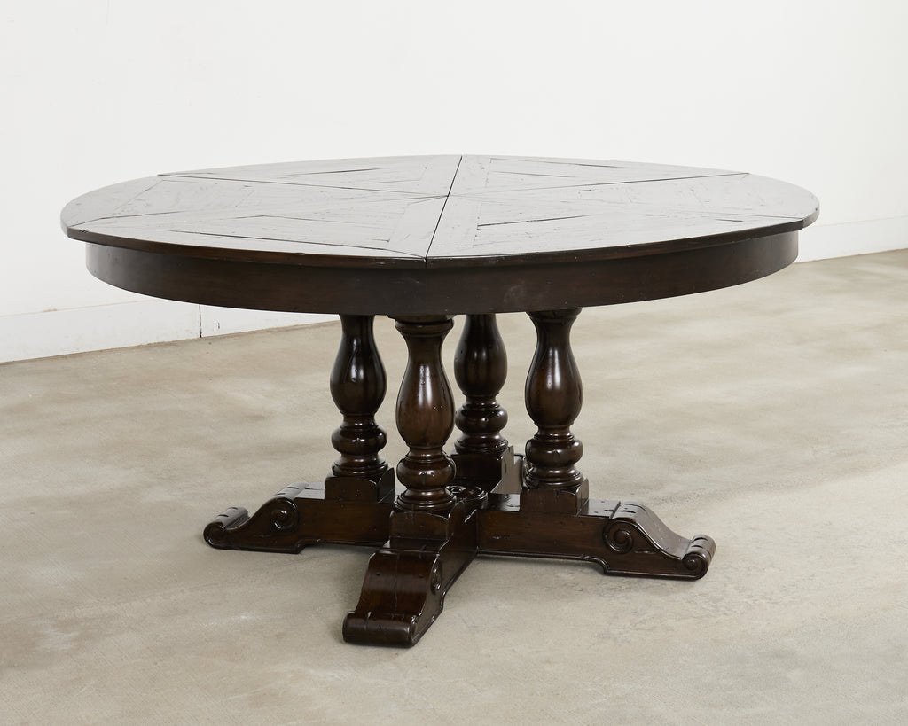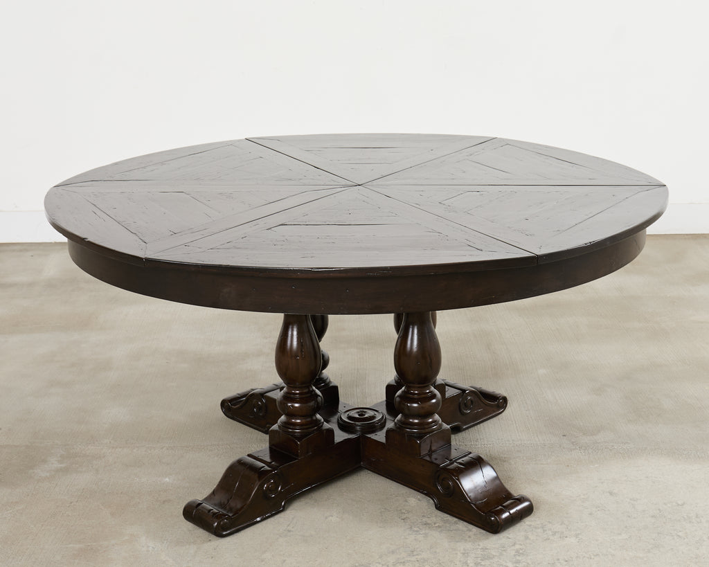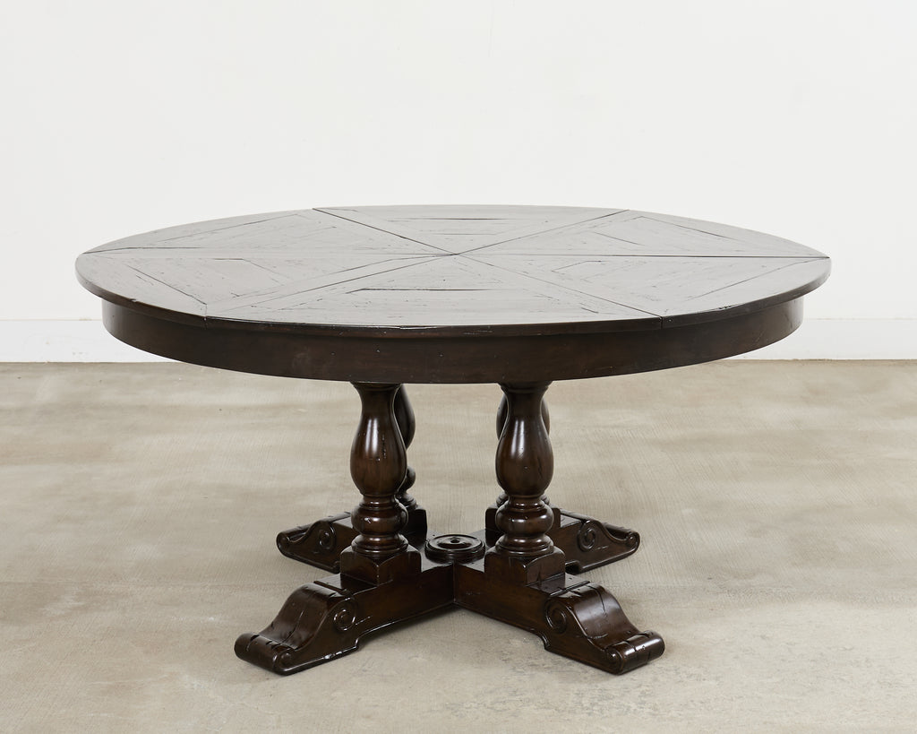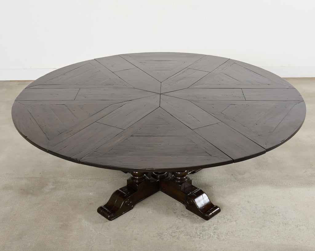 Handsome Castle Bromwich Sylvan round mahogany dining table hand-crafted by Theodore Alexander. The table features an ingenious extending parquetry segmented round circular top with self -storing hidden fold out leaves that extends from a 62.5 inch diameter to a 78 inch diameter table. Made in the country English traditional rustic style with an intentionally distressed aged patina to mimic the style and finish of a 17th century Stuart table in the Baroque taste. The top is supported by four large baluster turned legs conjoined by a large x form stretcher ending with wide scrolled shoe feet. Very heavy and solid with excellent joinery and craftsmanship. The table is signed with a maker's plaque from Theodore Alexander's Castle Browmich Collection. Ample leg room measuring 25.5 inches from the floor to the apron. From an estate in Santa Barbara, California.