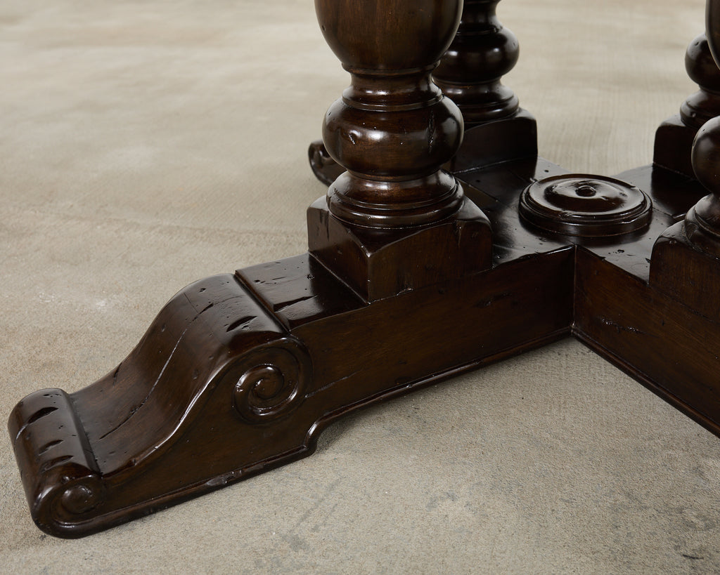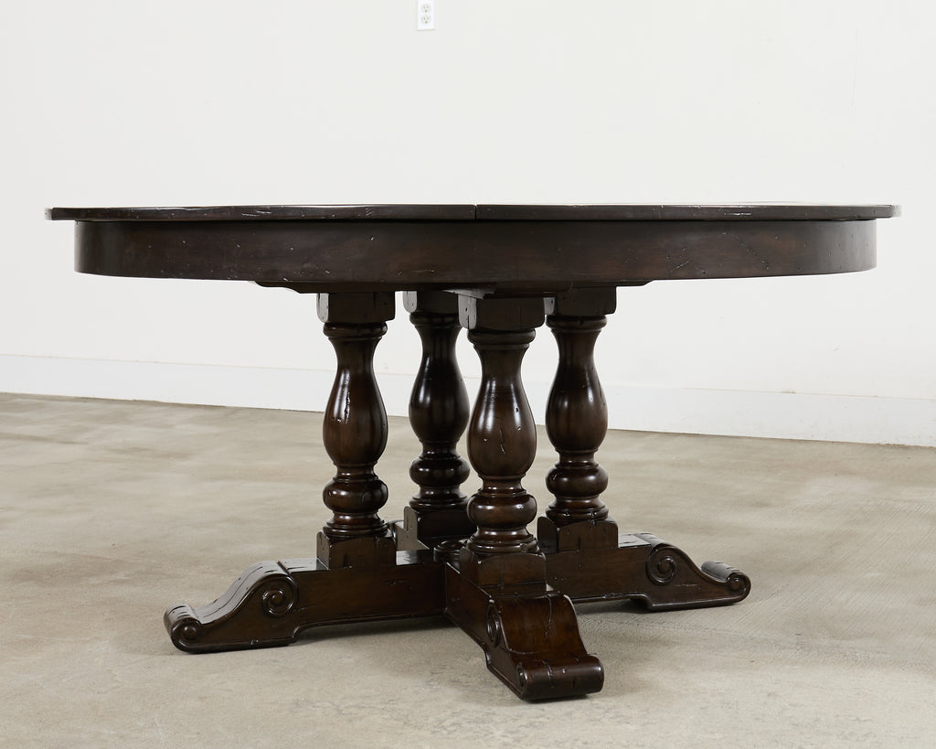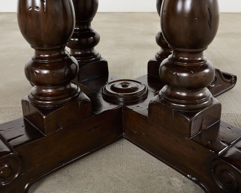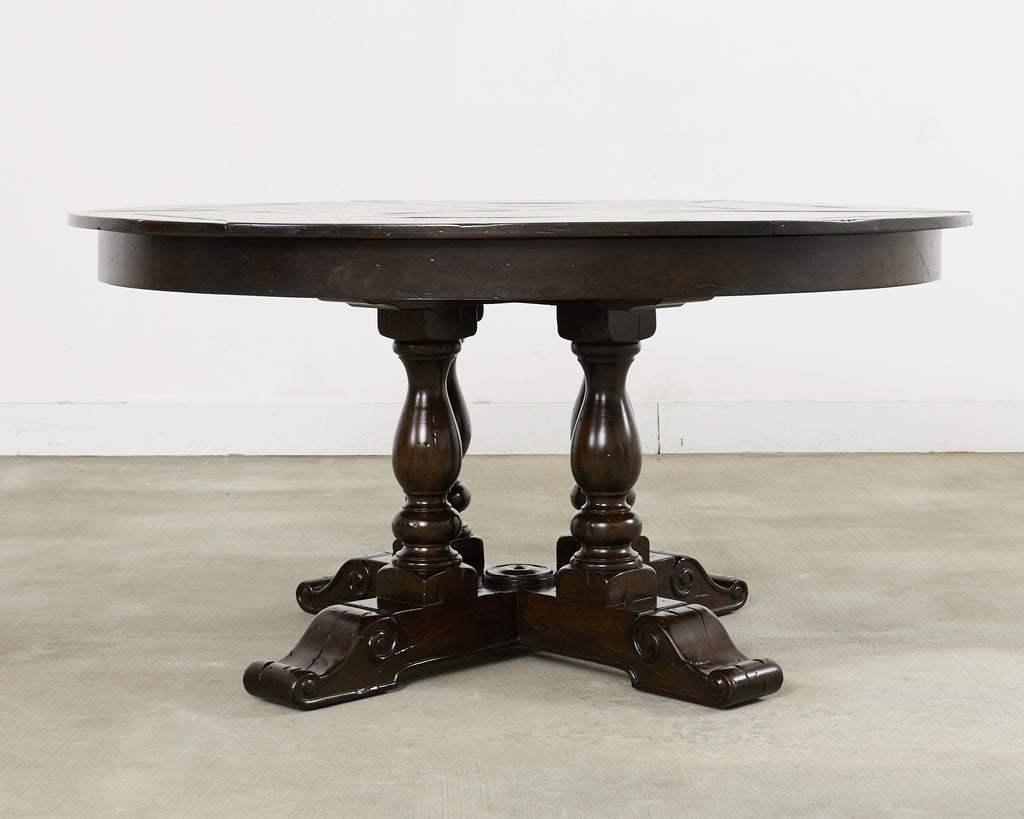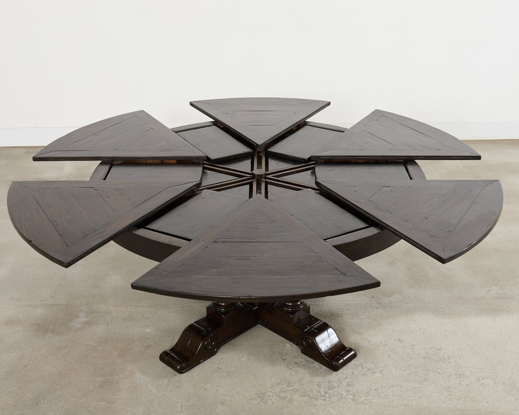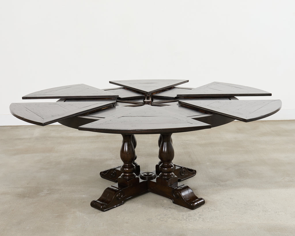 Handsome Castle Bromwich Sylvan round mahogany dining table hand-crafted by Theodore Alexander. The table features an ingenious extending parquetry segmented round circular top with self -storing hidden fold out leaves that extends from a 62.5 inch diameter to a 78 inch diameter table. Made in the country English traditional rustic style with an intentionally distressed aged patina to mimic the style and finish of a 17th century Stuart table in the Baroque taste. The top is supported by four large baluster turned legs conjoined by a large x form stretcher ending with wide scrolled shoe feet. Very heavy and solid with excellent joinery and craftsmanship. The table is signed with a maker's plaque from Theodore Alexander's Castle Browmich Collection. Ample leg room measuring 25.5 inches from the floor to the apron. From an estate in Santa Barbara, California.