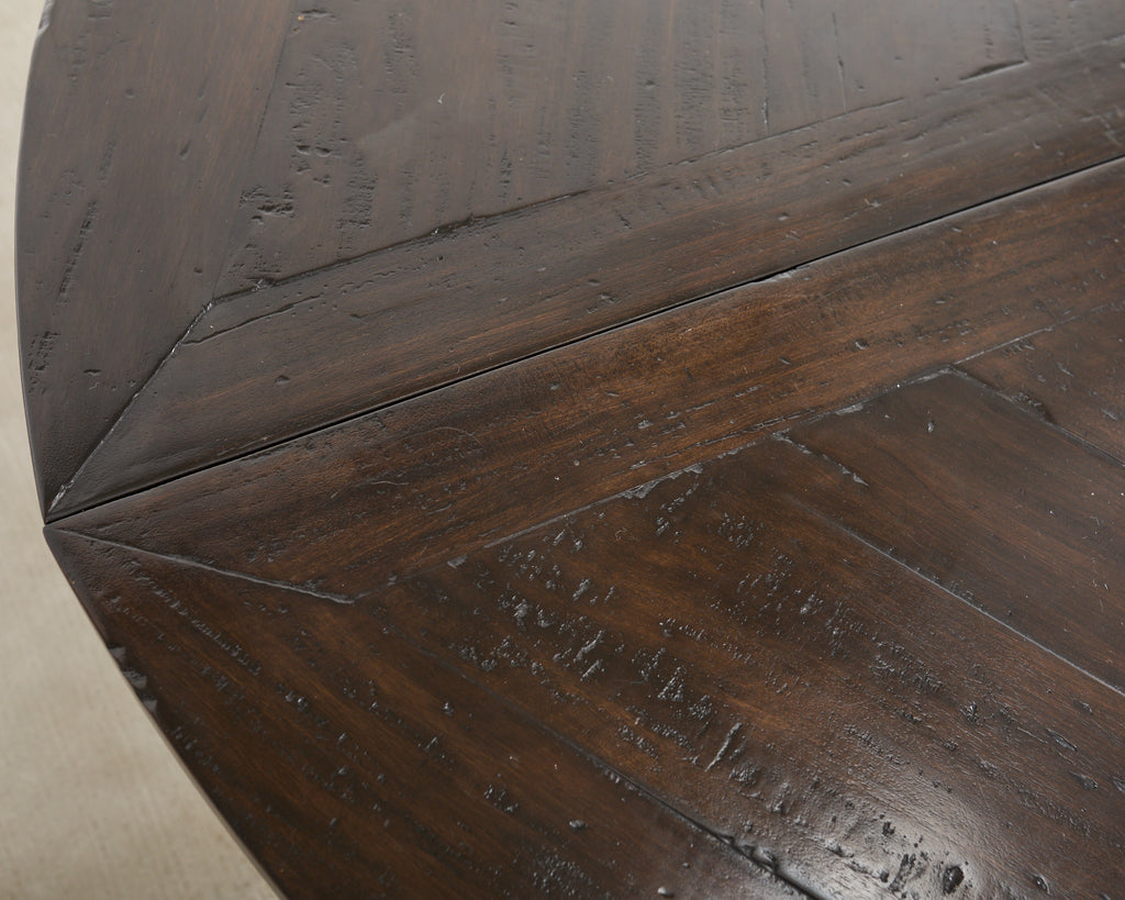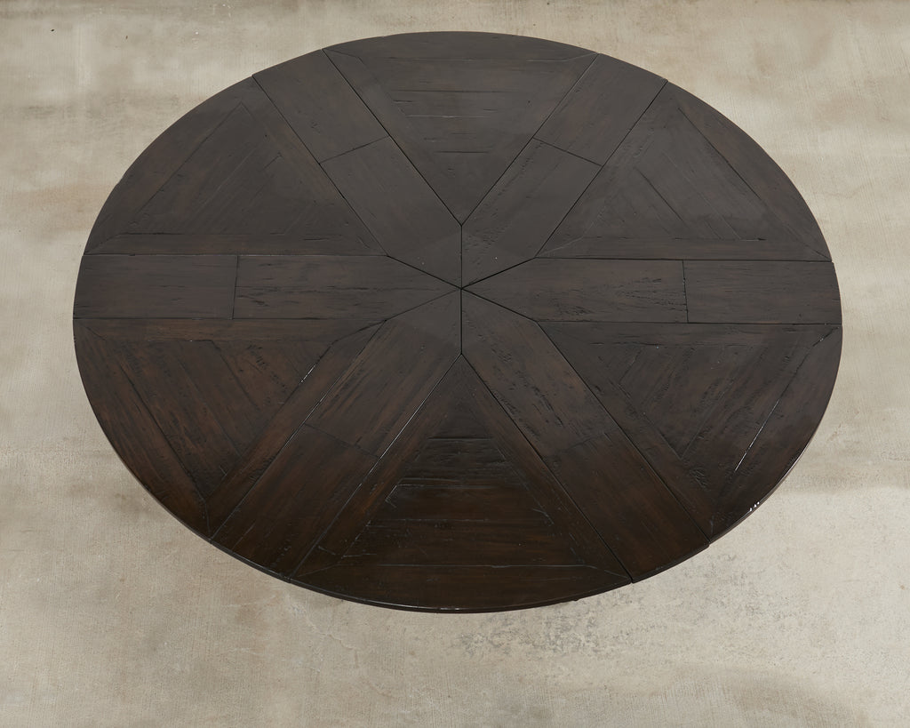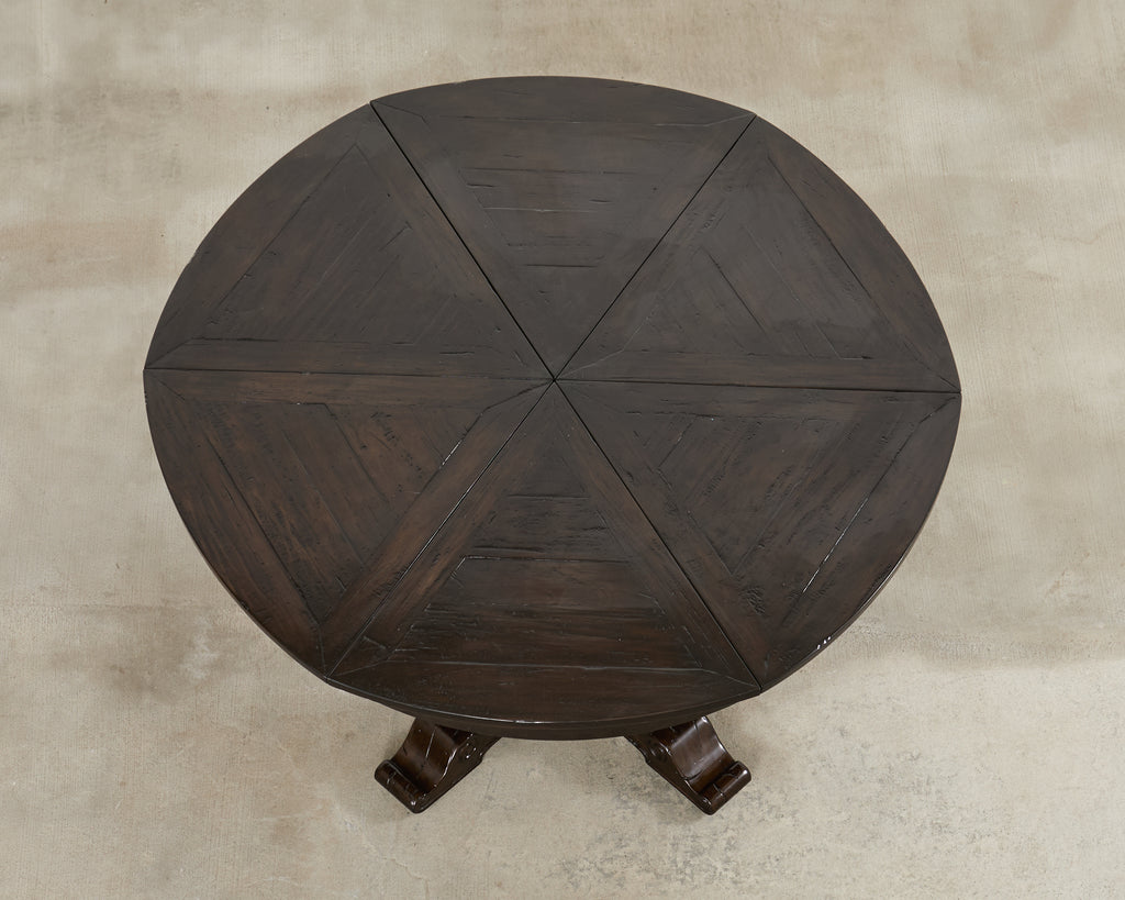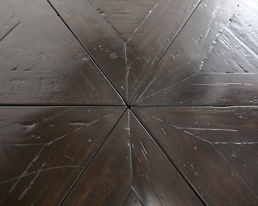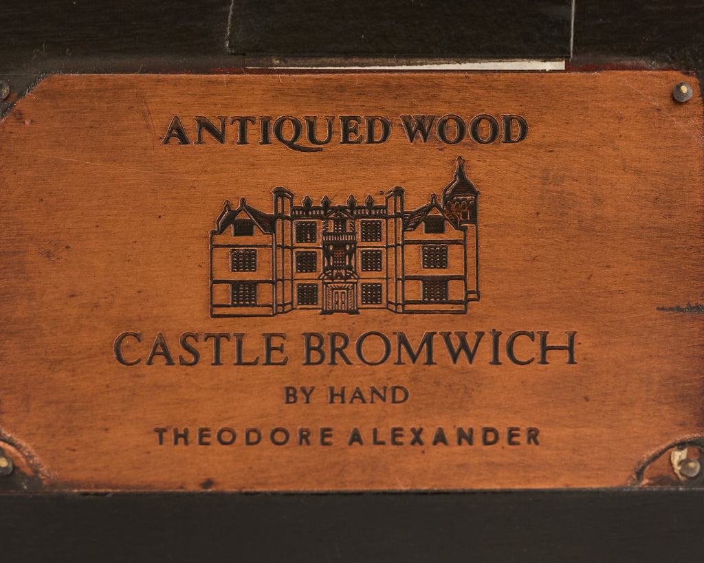 Handsome Castle Bromwich Sylvan round mahogany dining table hand-crafted by Theodore Alexander. The table features an ingenious extending parquetry segmented round circular top with self -storing hidden fold out leaves that extends from a 62.5 inch diameter to a 78 inch diameter table. Made in the country English traditional rustic style with an intentionally distressed aged patina to mimic the style and finish of a 17th century Stuart table in the Baroque taste. The top is supported by four large baluster turned legs conjoined by a large x form stretcher ending with wide scrolled shoe feet. Very heavy and solid with excellent joinery and craftsmanship. The table is signed with a maker's plaque from Theodore Alexander's Castle Browmich Collection. Ample leg room measuring 25.5 inches from the floor to the apron. From an estate in Santa Barbara, California.