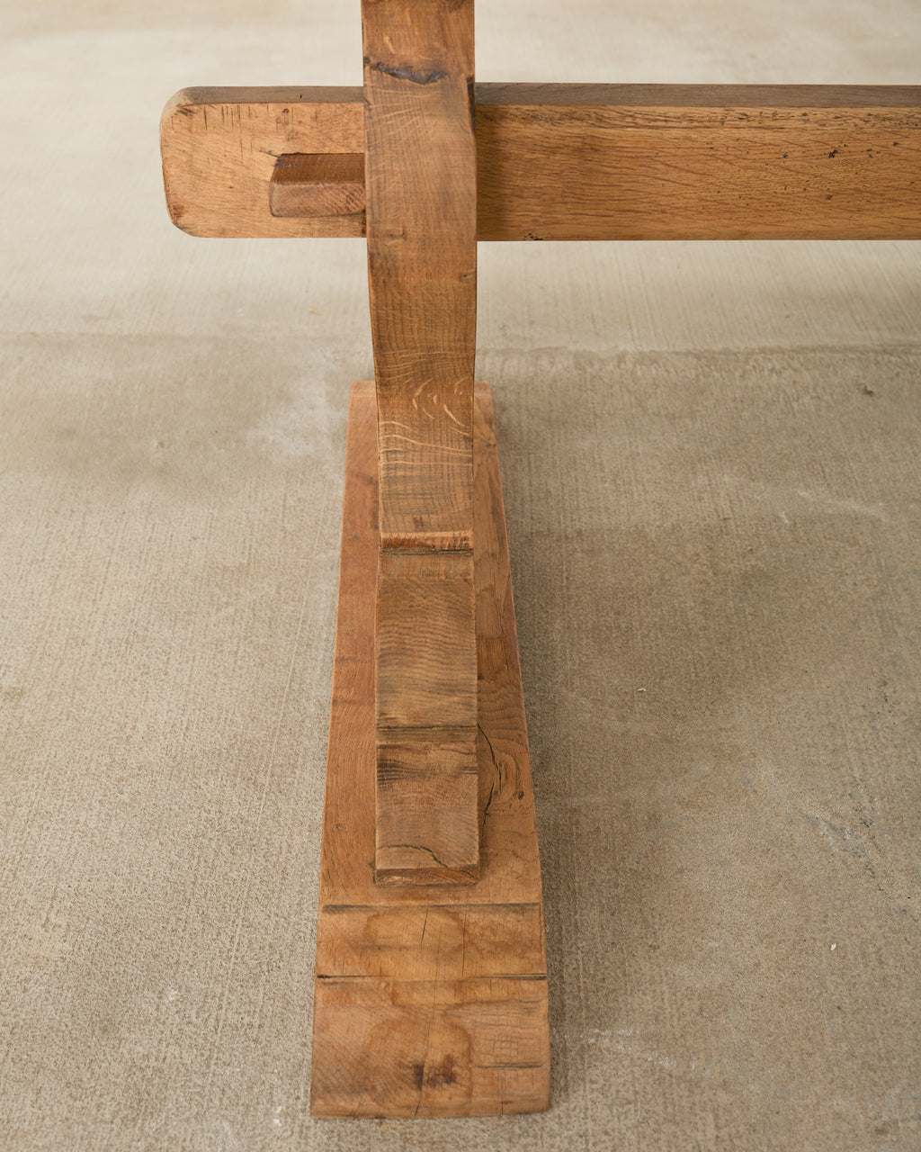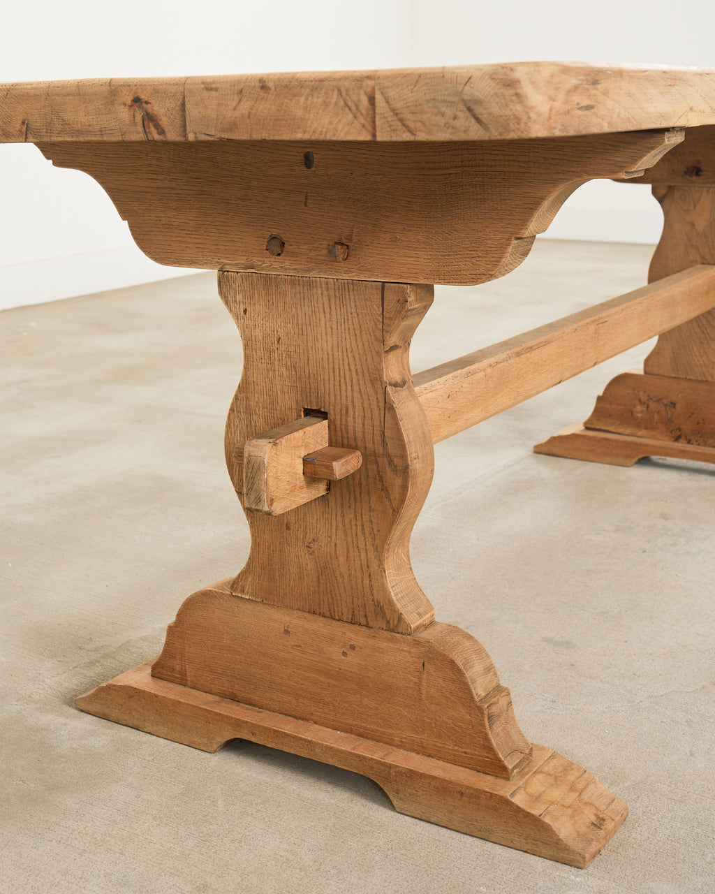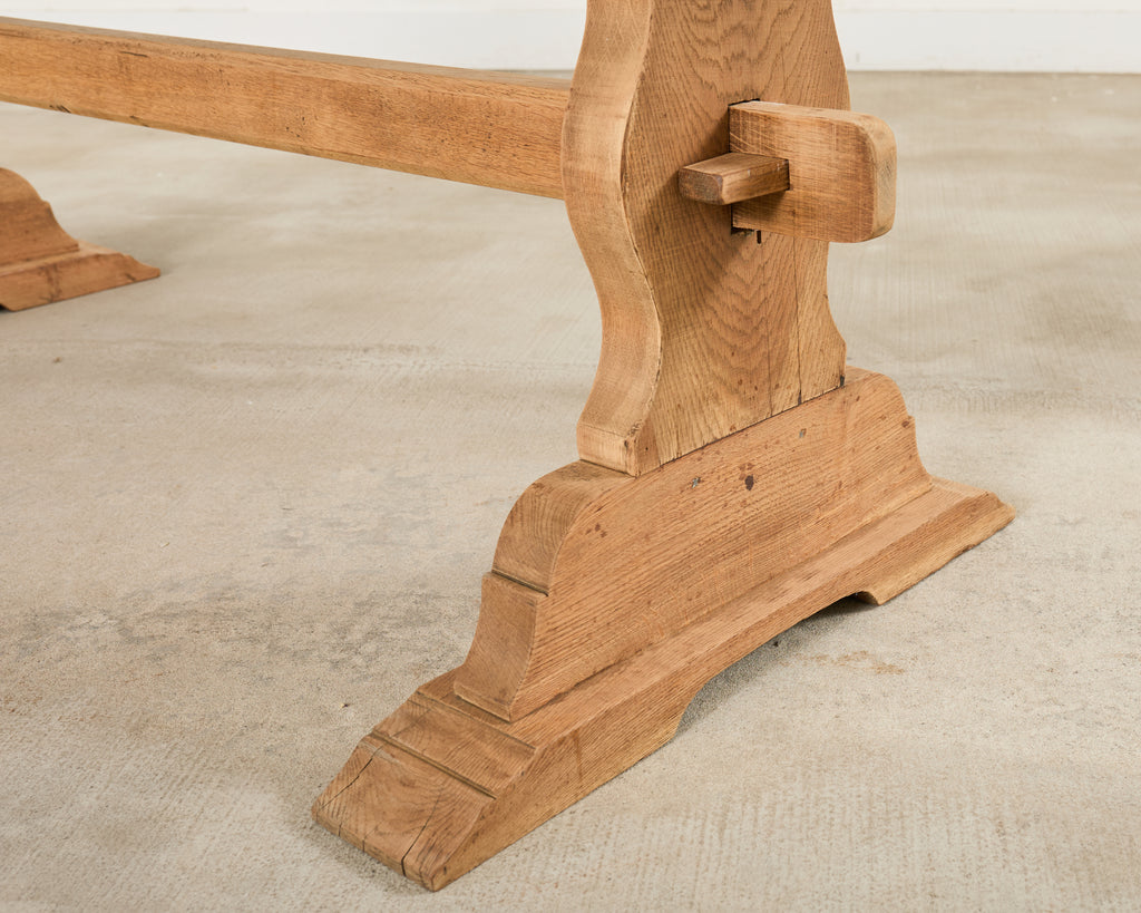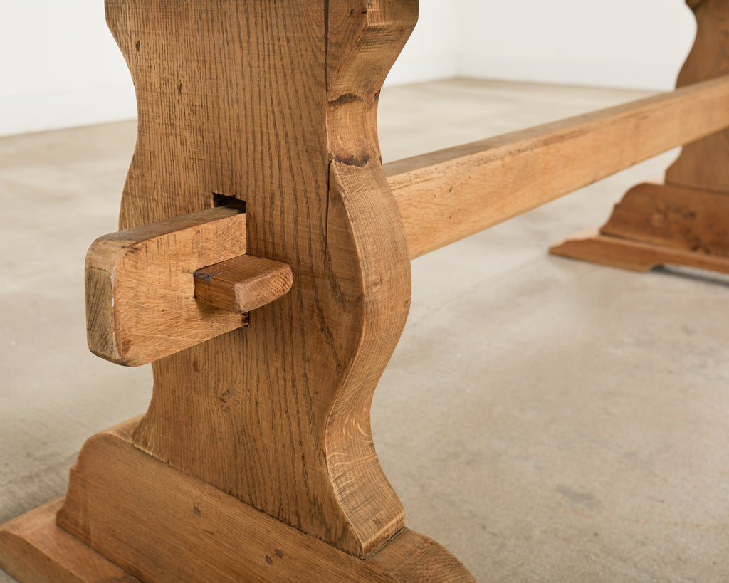 Rustic 20th century country French provincial style farmhouse dining table featuring a bleached oak finish. The table has a 2 inch thick plank top supported by a trestle base. The hourglass shaped legs are conjoined by a long stretcher having an exposed mortise and tenon joinery ending with wide shoe feet. The oak has a soft patina and blonde tone to the finish. Constructed with mostly wood pegs in an old world style. The table is sturdy with a natural weathered charm and character. Erin Lane Estate specializes in European farm tables with over 100 in stock ready to ship from our warehouse in California.