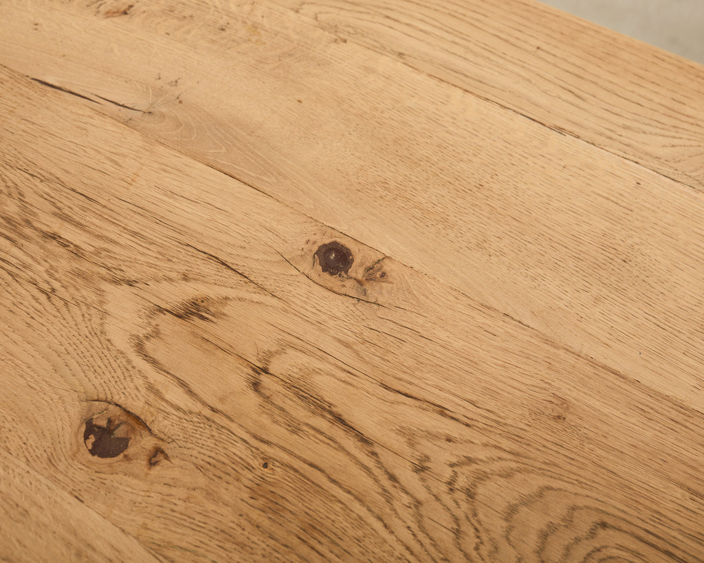 Condition: Distressed, wear consistent with age and use. Beautifully crafted with solid joinery and construction. Bleached oak has a weathered, distressed patina as seen in photos. Age appropriate wear with natural age cracks, chips, scuffs, shrinkage, stains, and scratches as expected.
