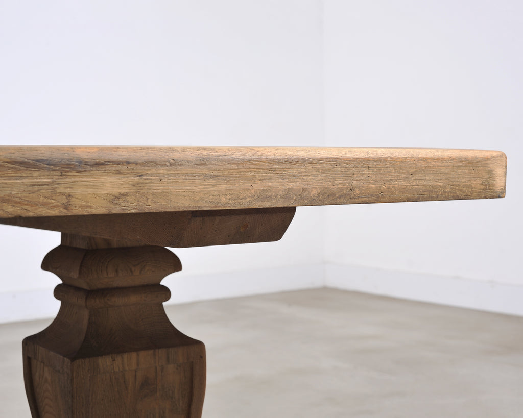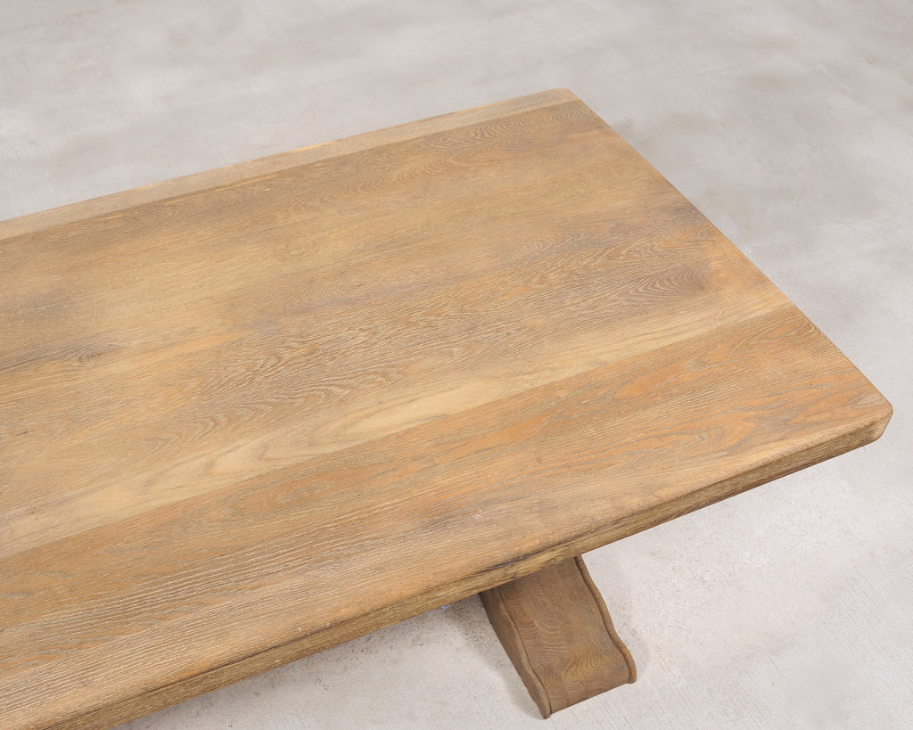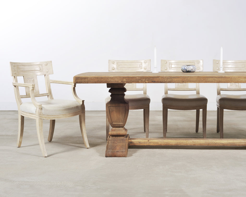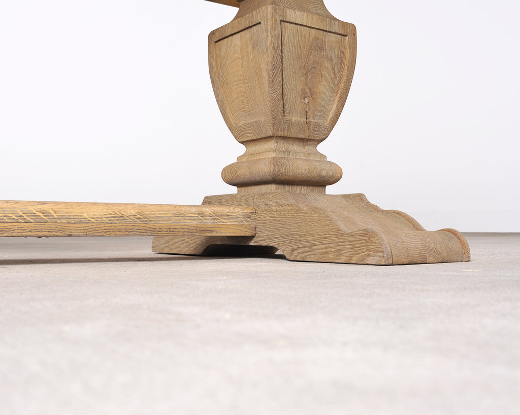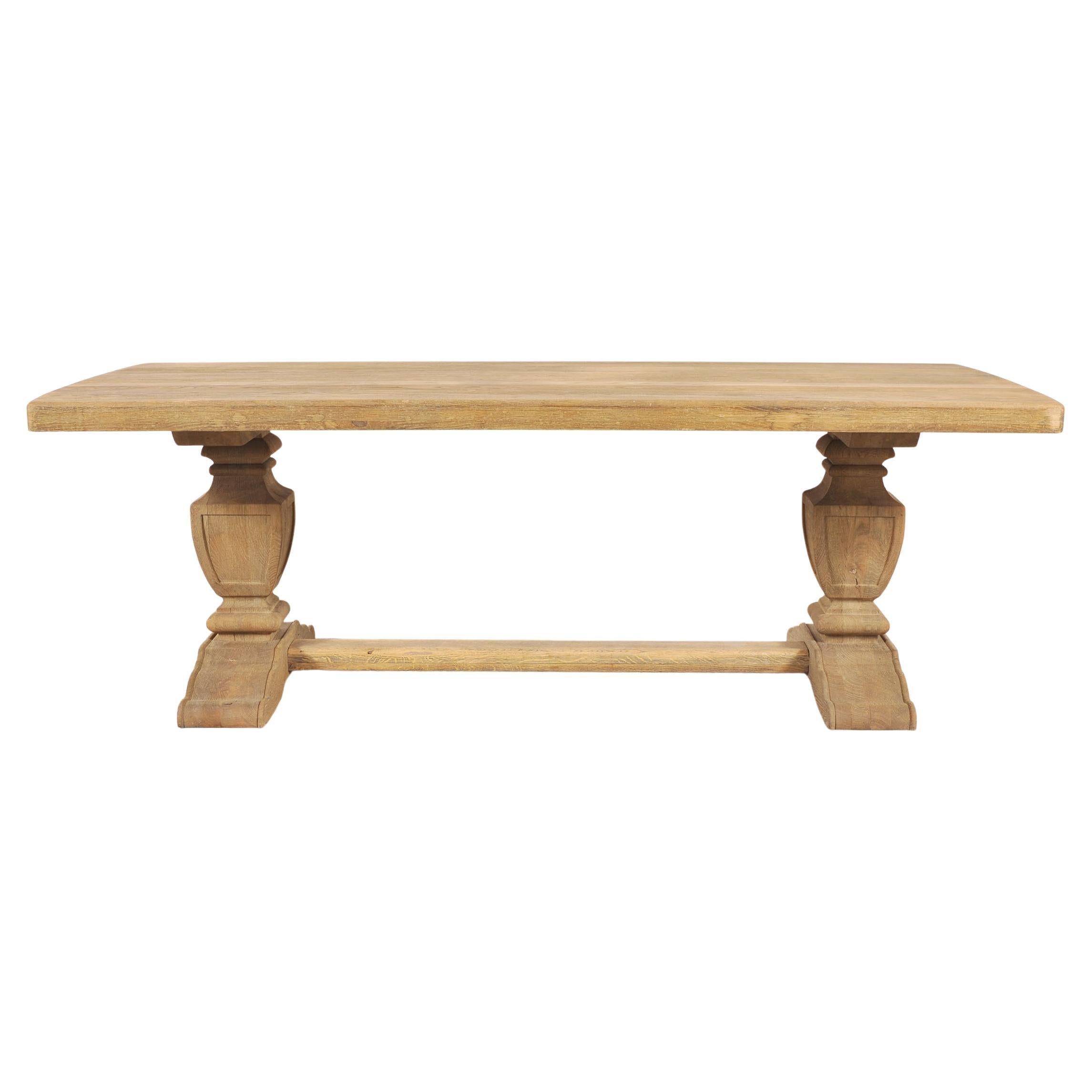A substantial stripped oak trestle dining table crafted in the country Italian Provincial style. The large table features a solid 2.5 inch thick rectangular plank top supported by two neoclassical style sculptural urn-form pedestal legs. The legs are conjoined by a long simple stretcher on the bottom and end with wide shoe feet. The urn shaped pedestal supports are broad and molded having a tapered form with four sides. The trestle feet have softly scrolling contours, in the style of a European refectory table. The piece is executed in oak with an intentionally distressed, weathered finish. The stripped oak has a distinctive dry, matte patina with a naturally toned finish. The finish showcasing the pale oak's beautiful organic grain movement and softly weathered surface in a bleached or cerused style. The table is stylistically flexible, combining French Provincial, Refectory, Rustic, Country, and Neoclassical styles and influences. The top measures 2.5" thick over a leg clearance of 27". The table is sturdy and strong having excellent joinery and craftsmanship. From an estate in Beverly Hills. CA. Erin Lane Estate specializes in European style farmhouse tables with over 100 in stock ready to ship from our California warehouse.