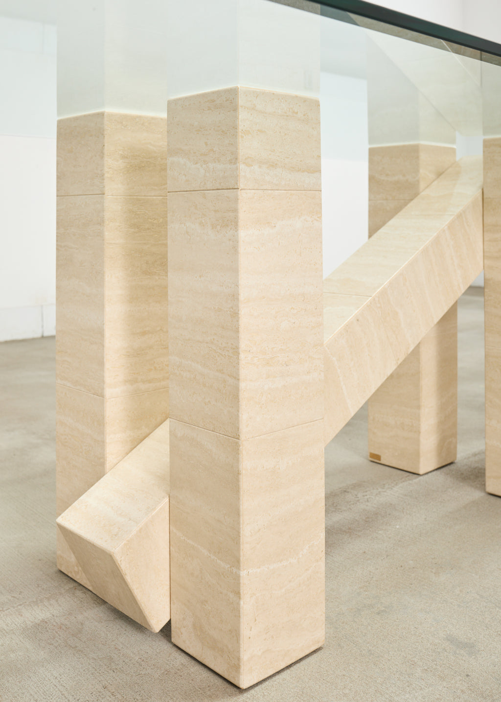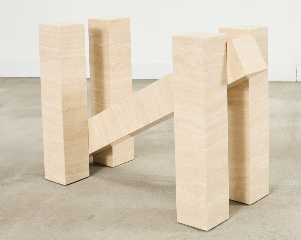 Architectural Italian mid-century modern dining table crafted from thick travertine posts in a sculptural design trestle style. The table features five substantial geometric block posts of four legs conjoined by a slanted block. The travertine has a smooth, honed finish with warm, natural veining. The organic post modern design has a minimalist aesthetic and dramatic profile. Topped with a thick pane of beveled glass measuring 7 feet long. The table is made in the style of Willy Ballez a mid-century Belgium designer who crafted in travertine. The table is signed by maker with a gold plaque having the initials H.R. on the leg. From an estate in San Francisco, CA.