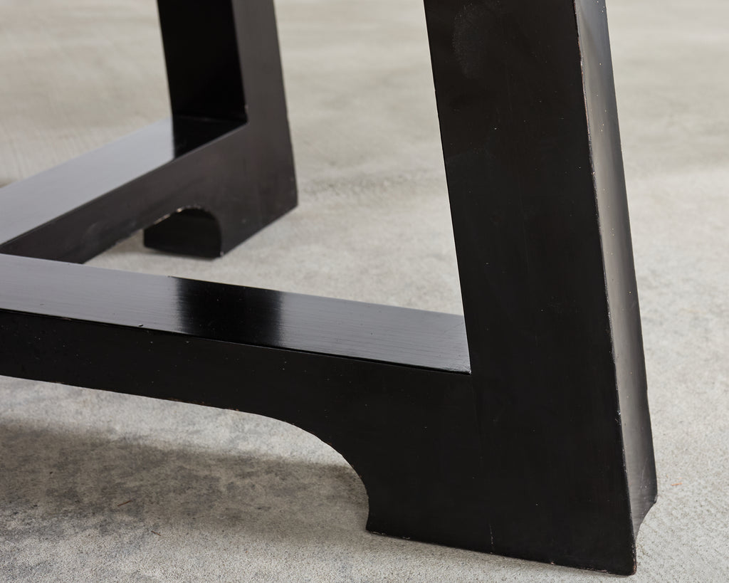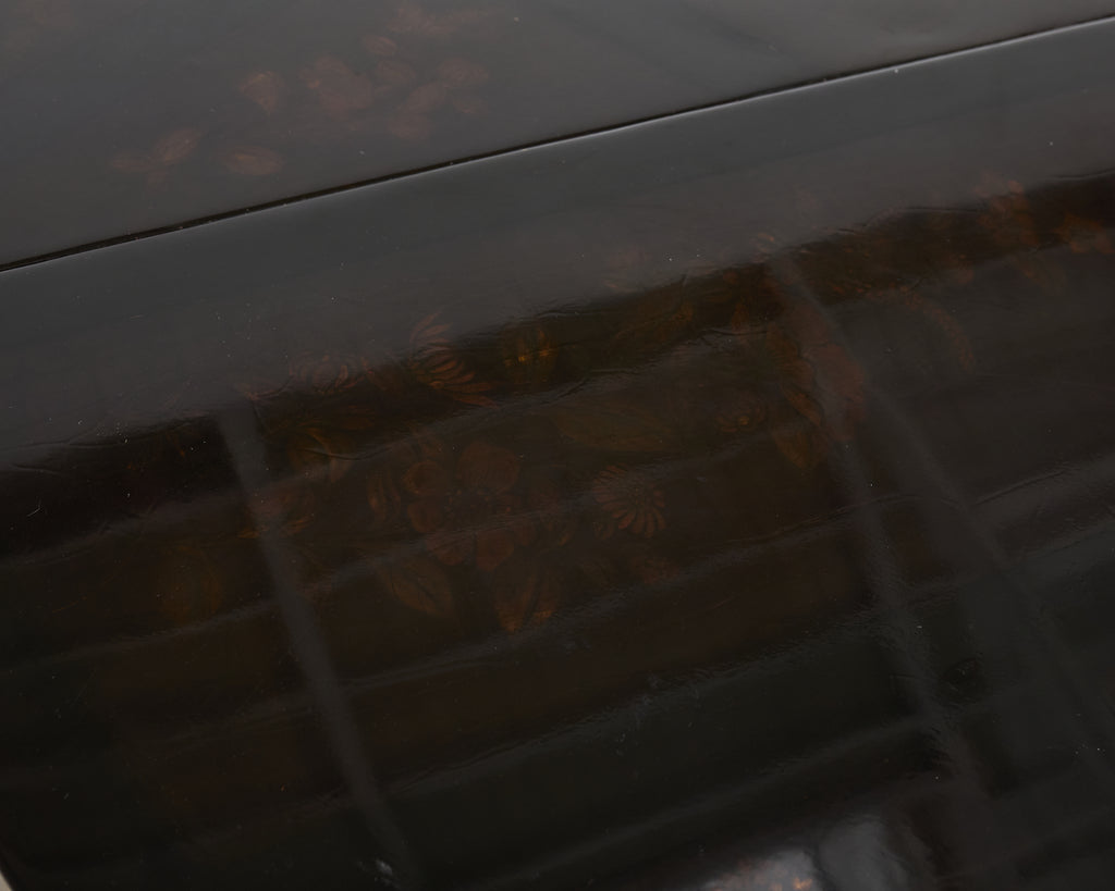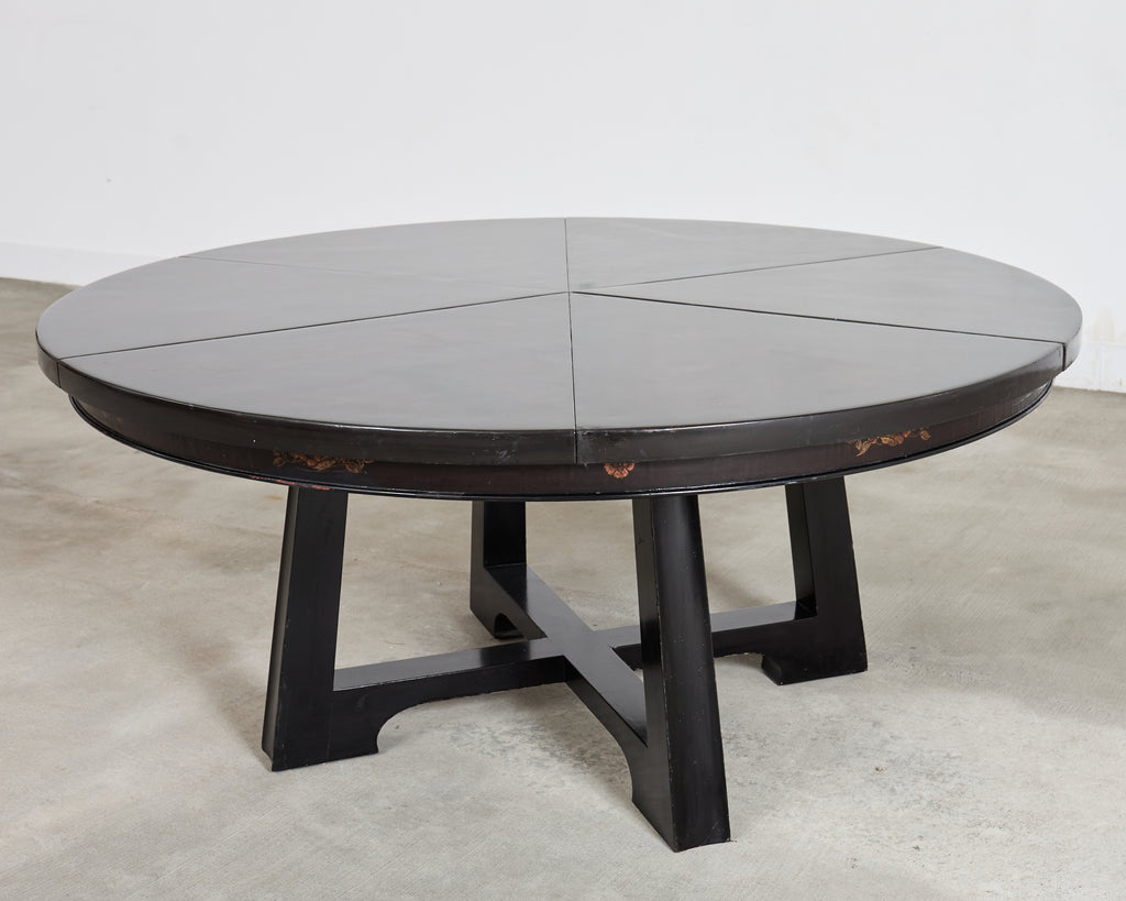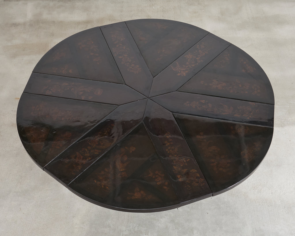An exceptional bespoke Chinoiserie decorated round dining table designed by L. Rossi, San Fransisco, CA. Known as the "evolution" table distinguished by its segmented "pie-slice" top in a refined lacquer finish with warm sepia chinoiserie floral decorations below the lacquered surface. The top is engineered to present as a clean, minimal round surface in its closed configuration and expands to an dramatic and immense starburst patterned top when additional segments are installed. The top surface and apron are finished in a dramatic dark lacquer with warm sepia-toned floral vignettes, giving a shadowed and subtle chinoiserie element in the Asian aesthetic. The lacquer finish is intentionally distressed to mimic age as seen in photos. The table is anchored by a bold architectural base with four splayed supports joined by a X-form stretcher offering strong stability and a massive visual presence. The table could function equally well as a dining table, a center table, an elevated games or conference table. L. Rossi signature stamp underneath. MSRP was purported to be $31,000. From an estate in Bel Air, CA.