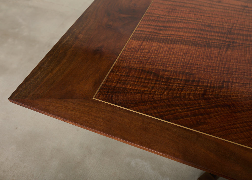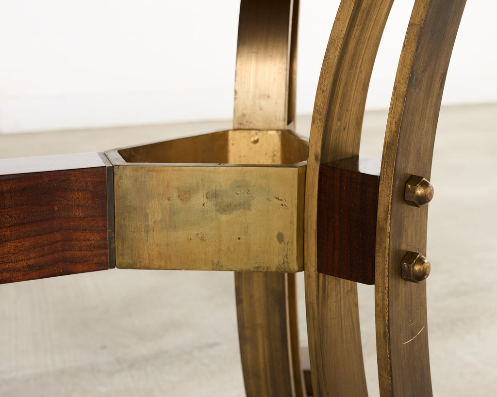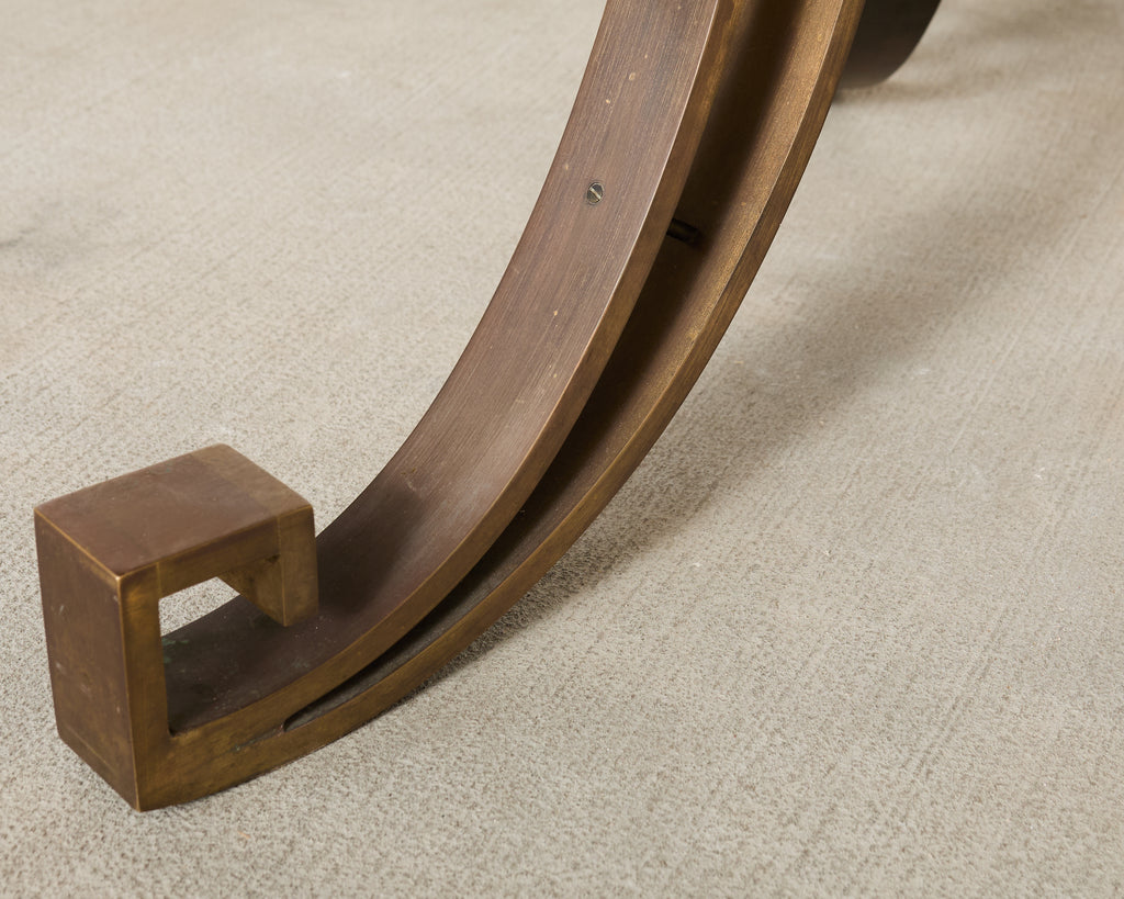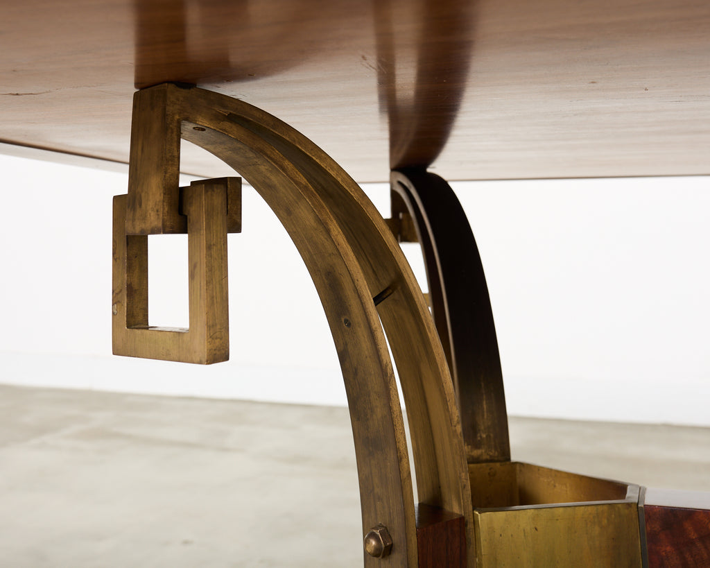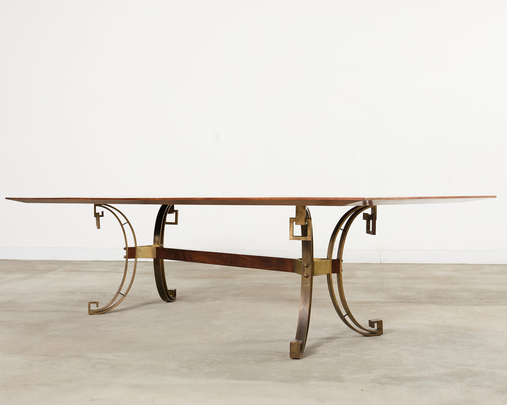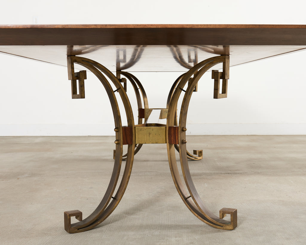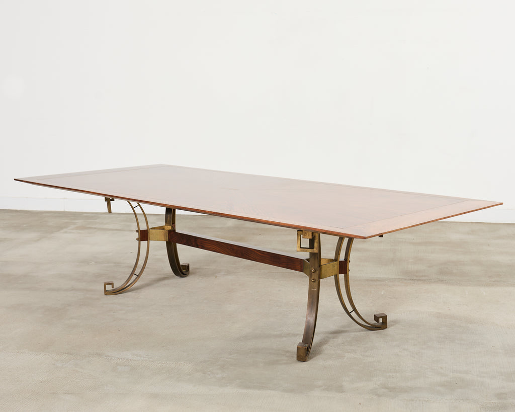 Fantastic French mid-century modern bronze trestle dining table attributed to Maison Ramsay. The table features a heavy and thick patinated bronze trestle base with gracefully curved architectural "C" scroll legs. The legs have a hanging square buckle on the top and a Greek key motif foot on the bottom. The legs are conjoined by a long hardwood stretcher. The table is topped with a large rectangular hardwood top measuring nearly 10 feet long. The top features an amazing sunburst pattern design of book matched hardwood veneers. The design has a fine thread inlay, border of brass with a center brass medallion. The radial grain patterns are geometric and make a dramatic presentation. The table top is thick with a beveled edge that tapers to the thin edge. The design evokes neoclassical architecture with a fine silhouette and profile. Impressive to view in person line staring at a piece of classic French sculpture. From an estate in Beverly Hills, California.