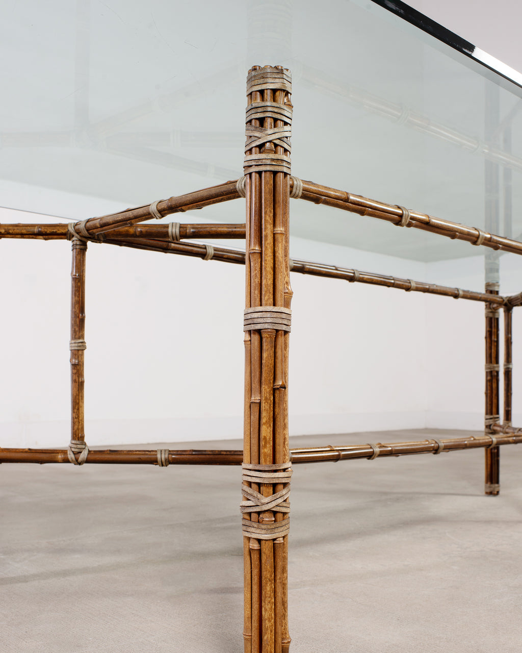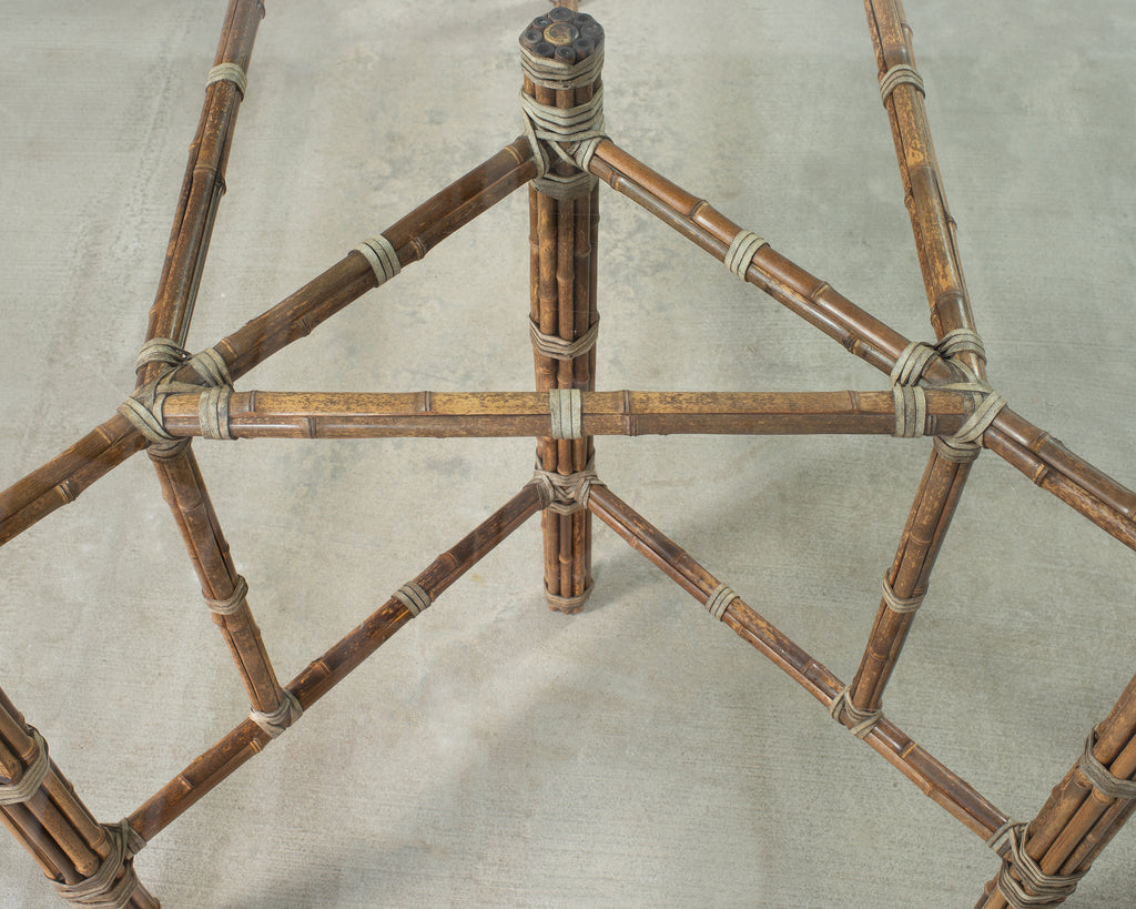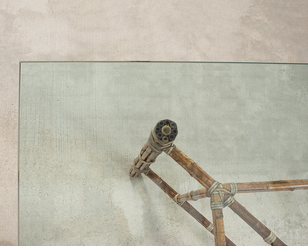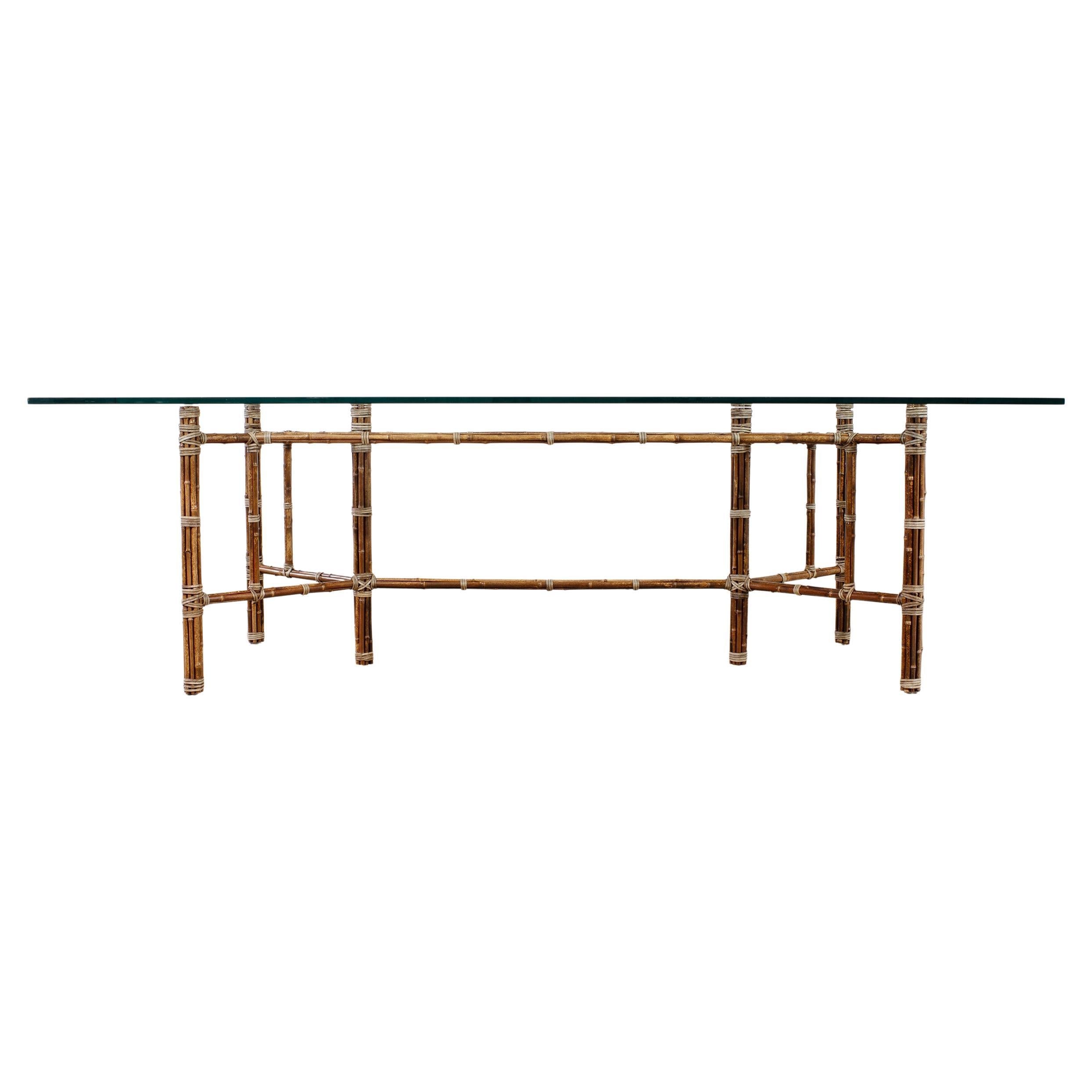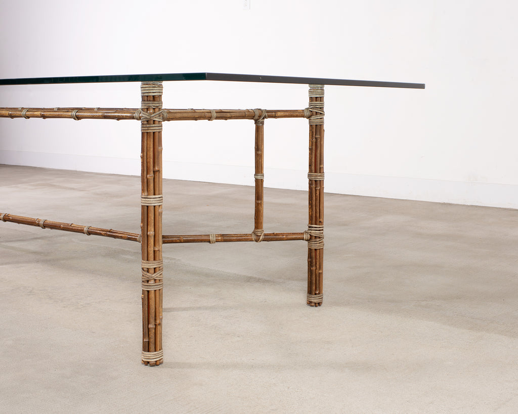Genuine large 8 foot long bamboo glass top dining table made in the California coastal organic modern style by McGuire artisans. The table base has an iron frame painted golden gate orange for authenticity and is entirely wrapped with pole bamboo and lashed together with leather rawhide laces on the exposed joints. The base is topped with a huge pane of thick, beveled glass. The base alone measures 73 long by 31 wide and is the largest size McGuire offered in this classic style. Very heavy and solid having excellent joinery and craftsmanship. The bamboo poles have a desirable aged patina on the finish as seen in photos. From an original owner estate in San Francisco, California. Each leg has an adjustable foot on the bottom for leveling. Handsome profile and large scale design with an open airy silhouette.