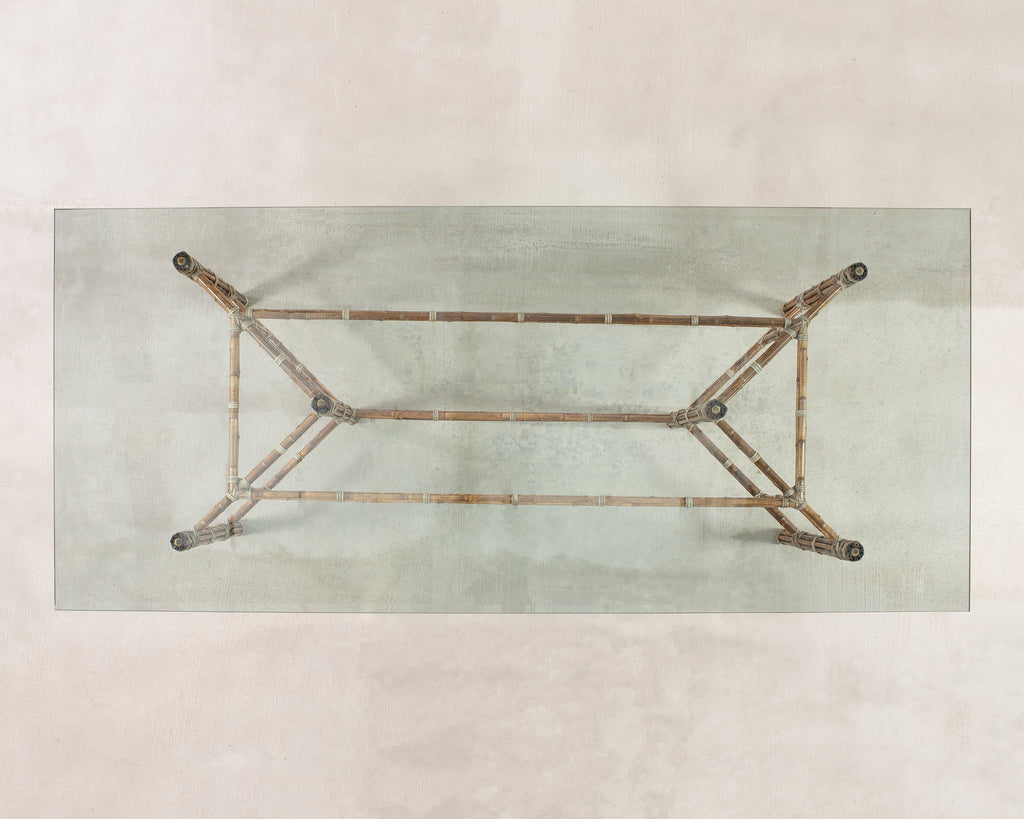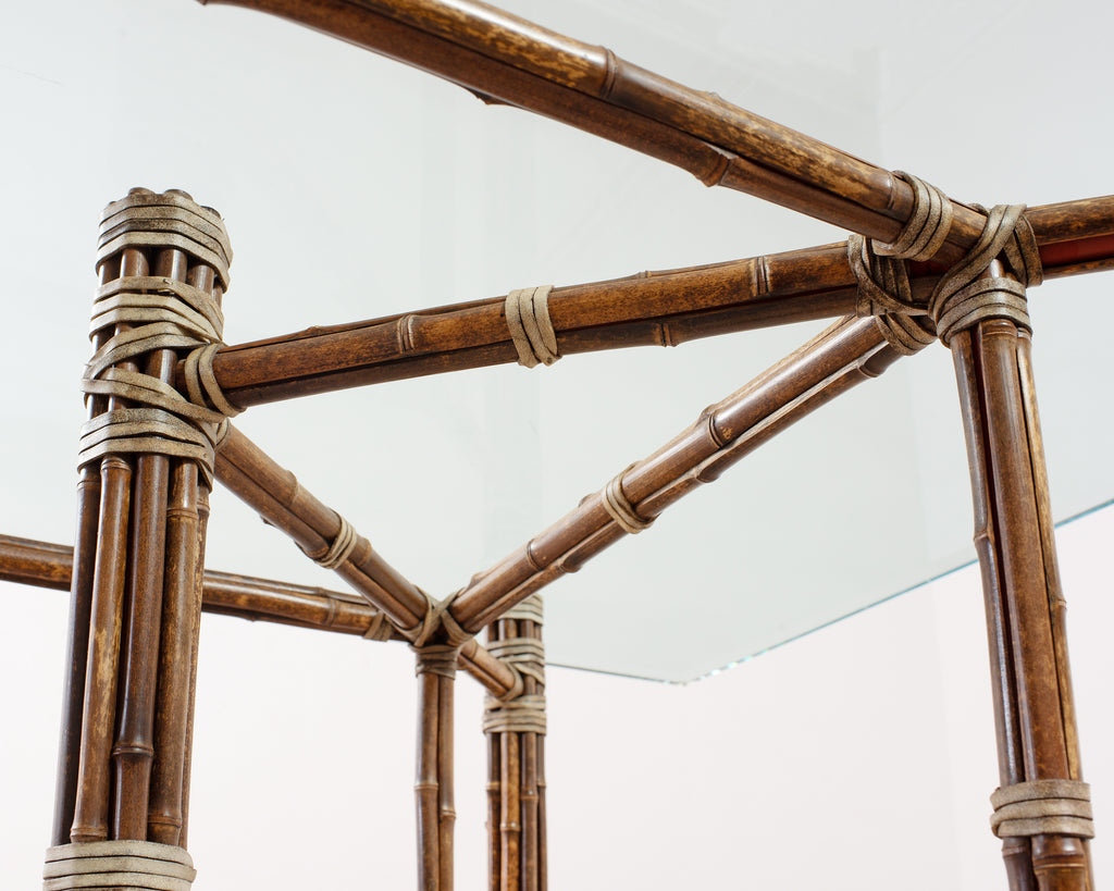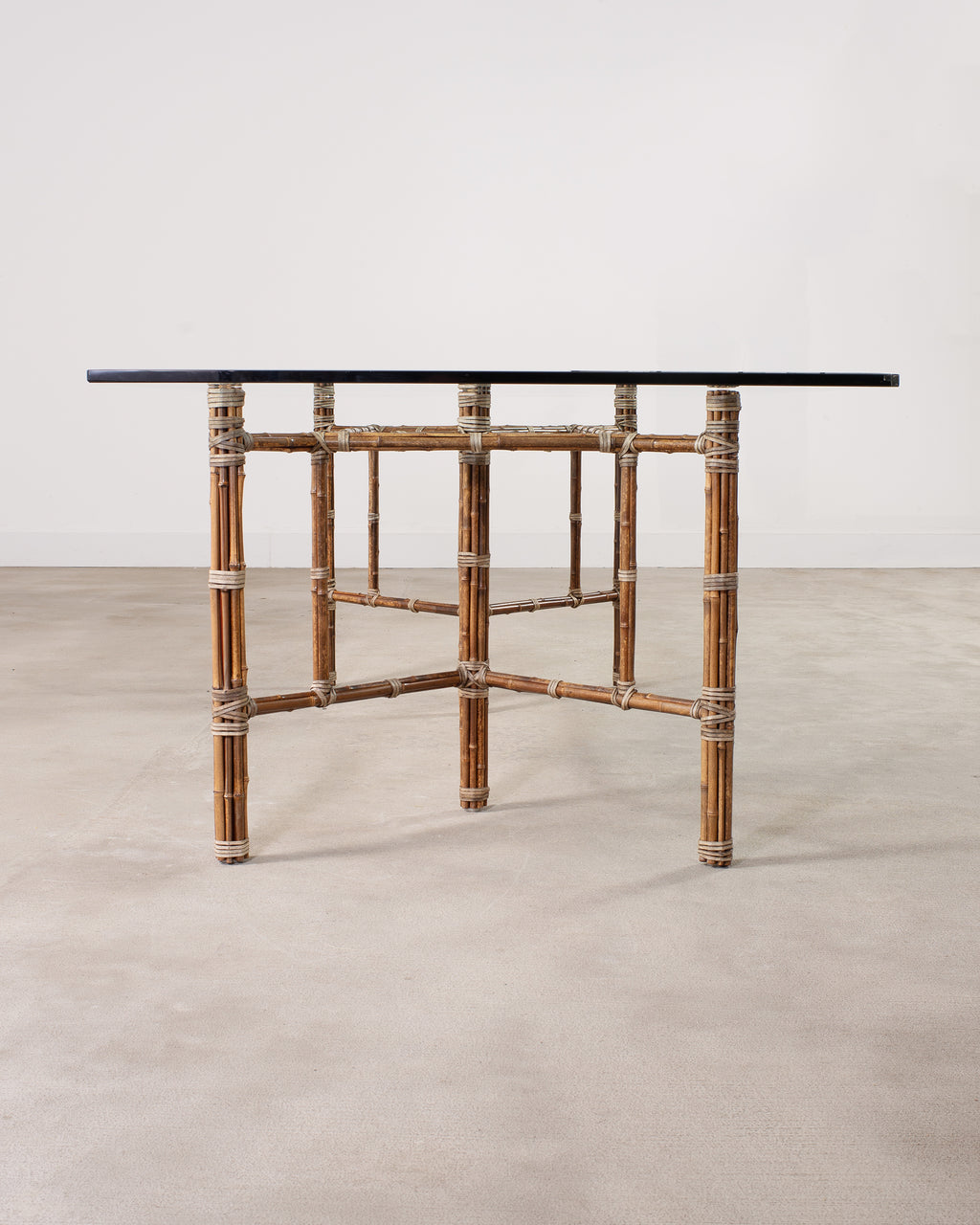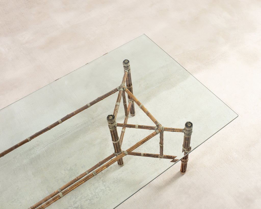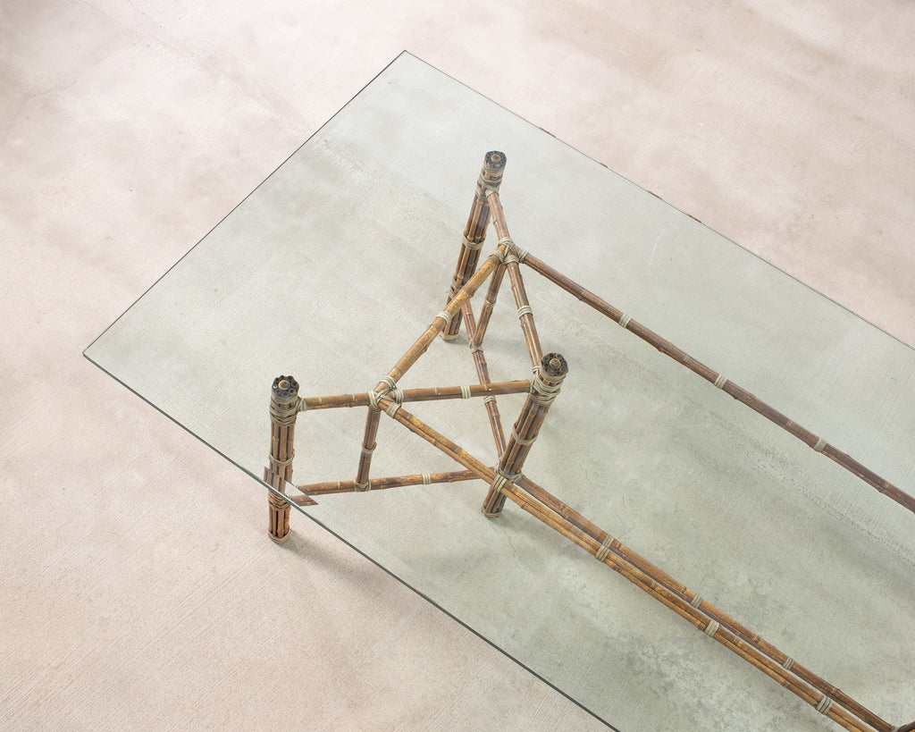 Genuine large 8 foot long bamboo glass top dining table made in the California coastal organic modern style by McGuire artisans. The table base has an iron frame painted golden gate orange for authenticity and is entirely wrapped with pole bamboo and lashed together with leather rawhide laces on the exposed joints. The base is topped with a huge pane of thick, beveled glass. The base alone measures 73 long by 31 wide and is the largest size McGuire offered in this classic style. Very heavy and solid having excellent joinery and craftsmanship. The bamboo poles have a desirable aged patina on the finish as seen in photos. From an original owner estate in San Francisco, California. Each leg has an adjustable foot on the bottom for leveling. Handsome profile and large scale design with an open airy silhouette.