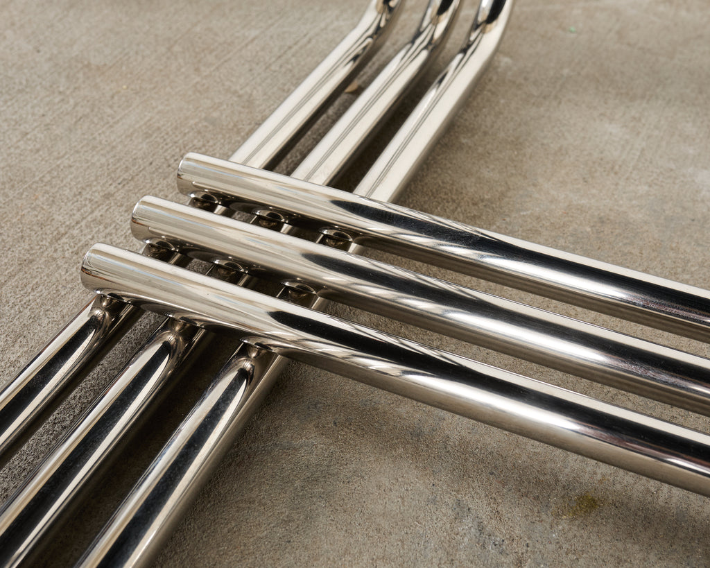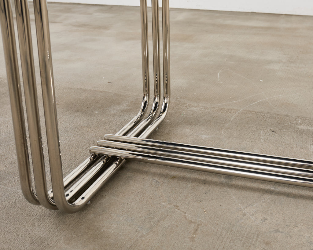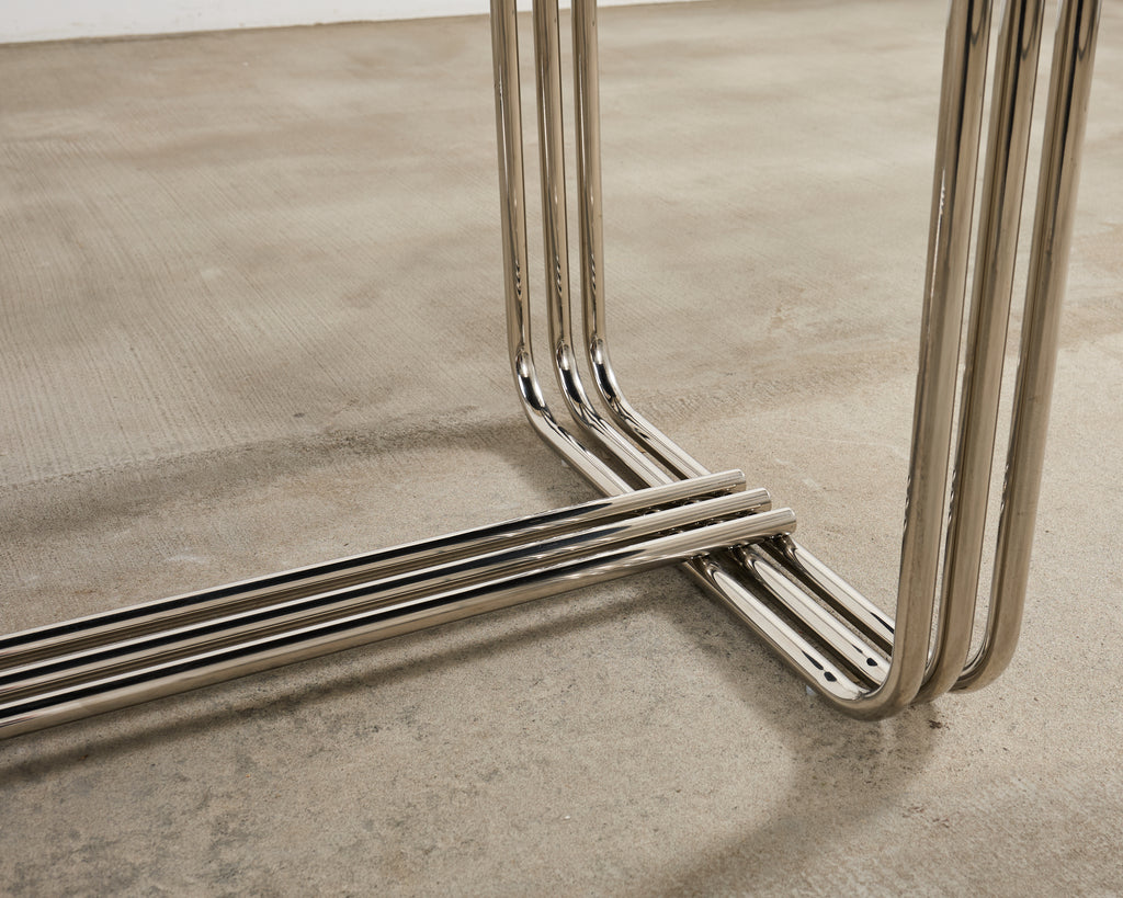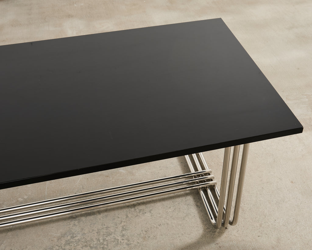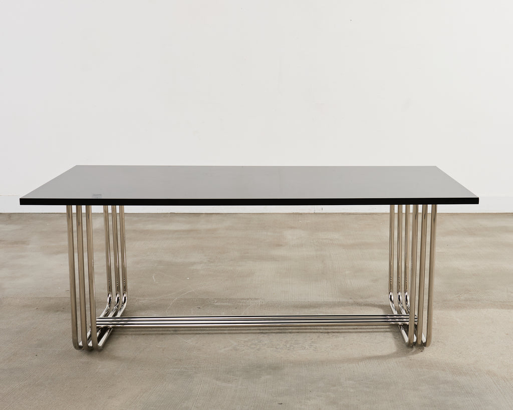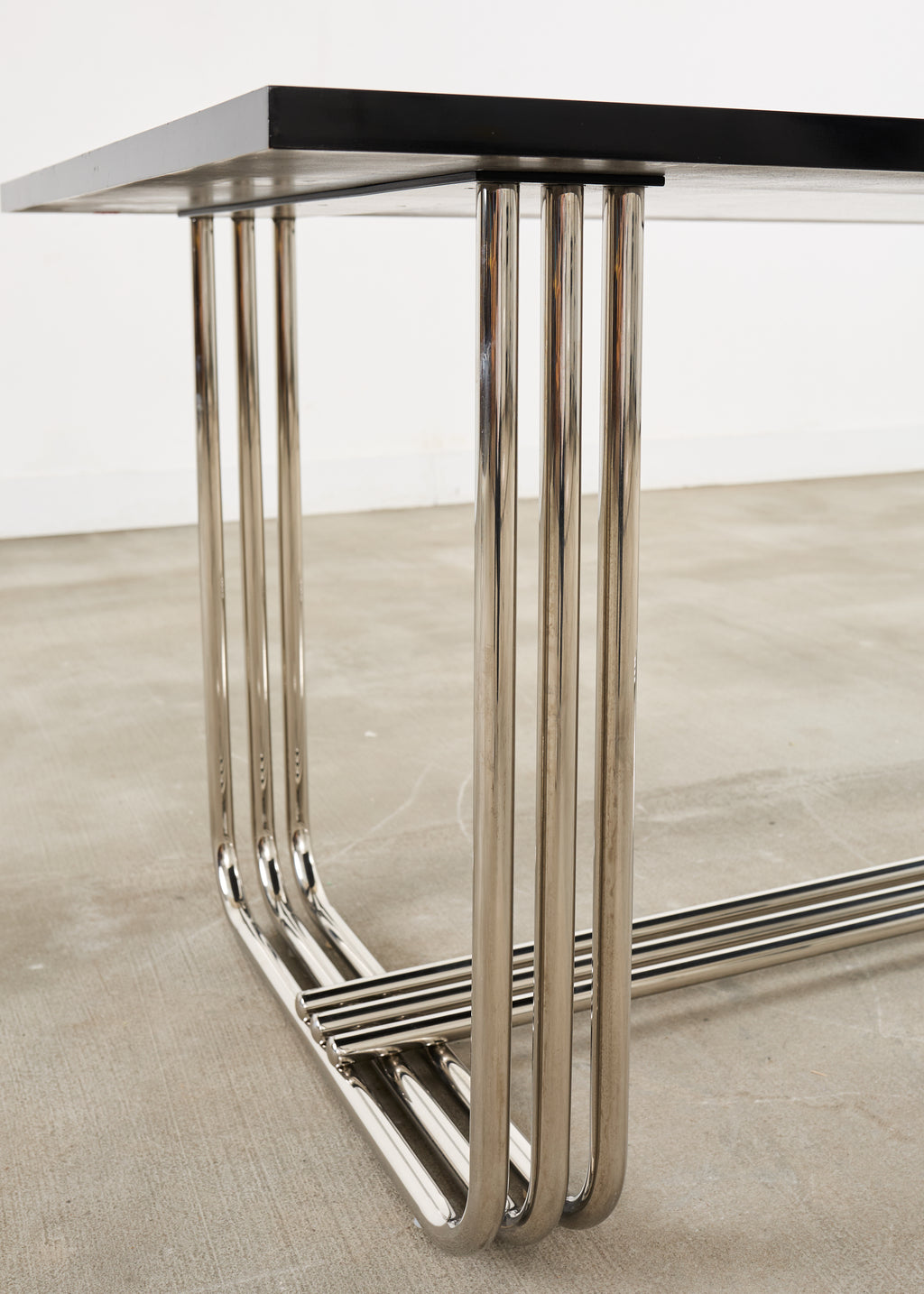 A striking Ralph Lauren rectangular dining table featuring a thick black lacquered mahogany top set on a tubular steel trestle base polished with a dramatic chrome like finish. The design is defined by the contrast of the inky, lacquer surface floating above a bright, chrome framework executed in a distinctive triple-rod motif. U-shaped legs and parallel tube stretchers provide visual rhythm and structural stability. Signed to the underside with a Ralph Lauren metal plaque. The design is similar to the iconic Hudson St. lounge chair from Lauren's Hudson collection. Clean lines and streamlined monochromatic design inspired by Art Deco bring a strong visual symmetry to the table. Small glides at contact points below supports. The steel rods are thick with a luxurious finish. The desk could serve as a chic desk or display table. The top of the table measures 1" thick with a 28.25" clearance below. The lacquered top has an aged patina with a fine craquelure adding to its intrigue and design. The table is sturdy and strong with excellent joinery and bench-made craftsmanship by Italian artisans.