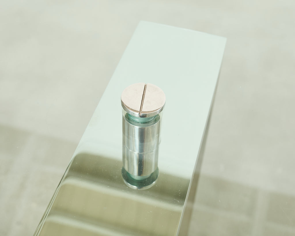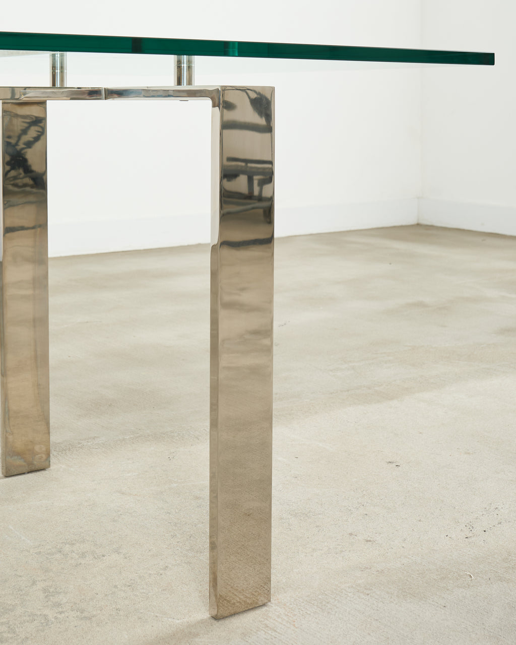 Rare and opulent Langham dining table designed by Ralph Lauren. The table features polished steel legs having a dramatic chrome style finish. The legs support a thick pane of glass that appears to float over the frame having an incredibly light and airy silhouette. The cylindrical hardware that attaches the top is designed to look like oversized bolts with screw tops. The hand-cast table is crafted in Italy and is bench made to the highest level of hand craftsmanship. Part of Ralph Lauren's Langham collection model #AFRTB10-1. The table is in very good, well preserved condition as seen in photos. This table could also serve as a chic desk or library table.